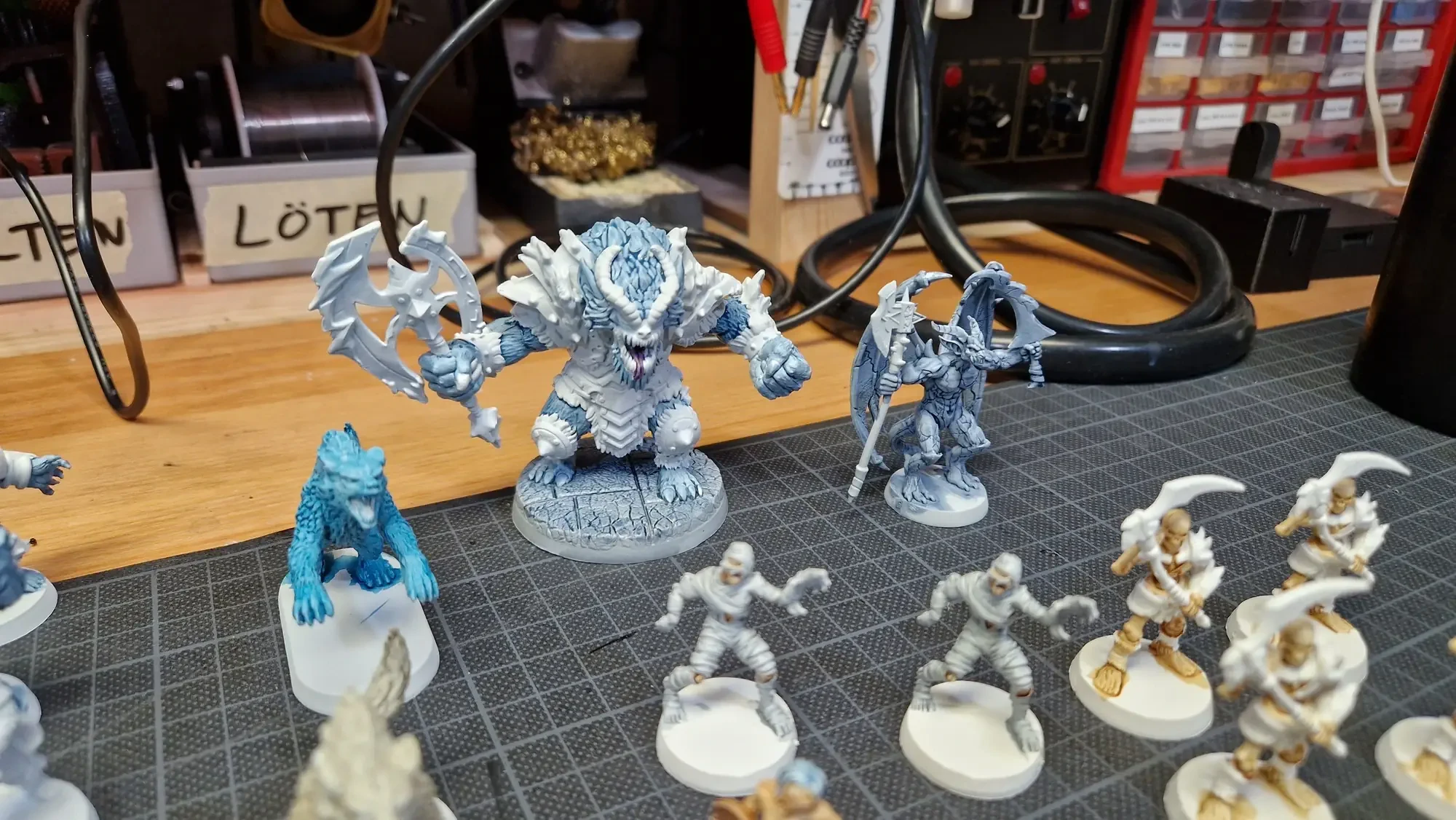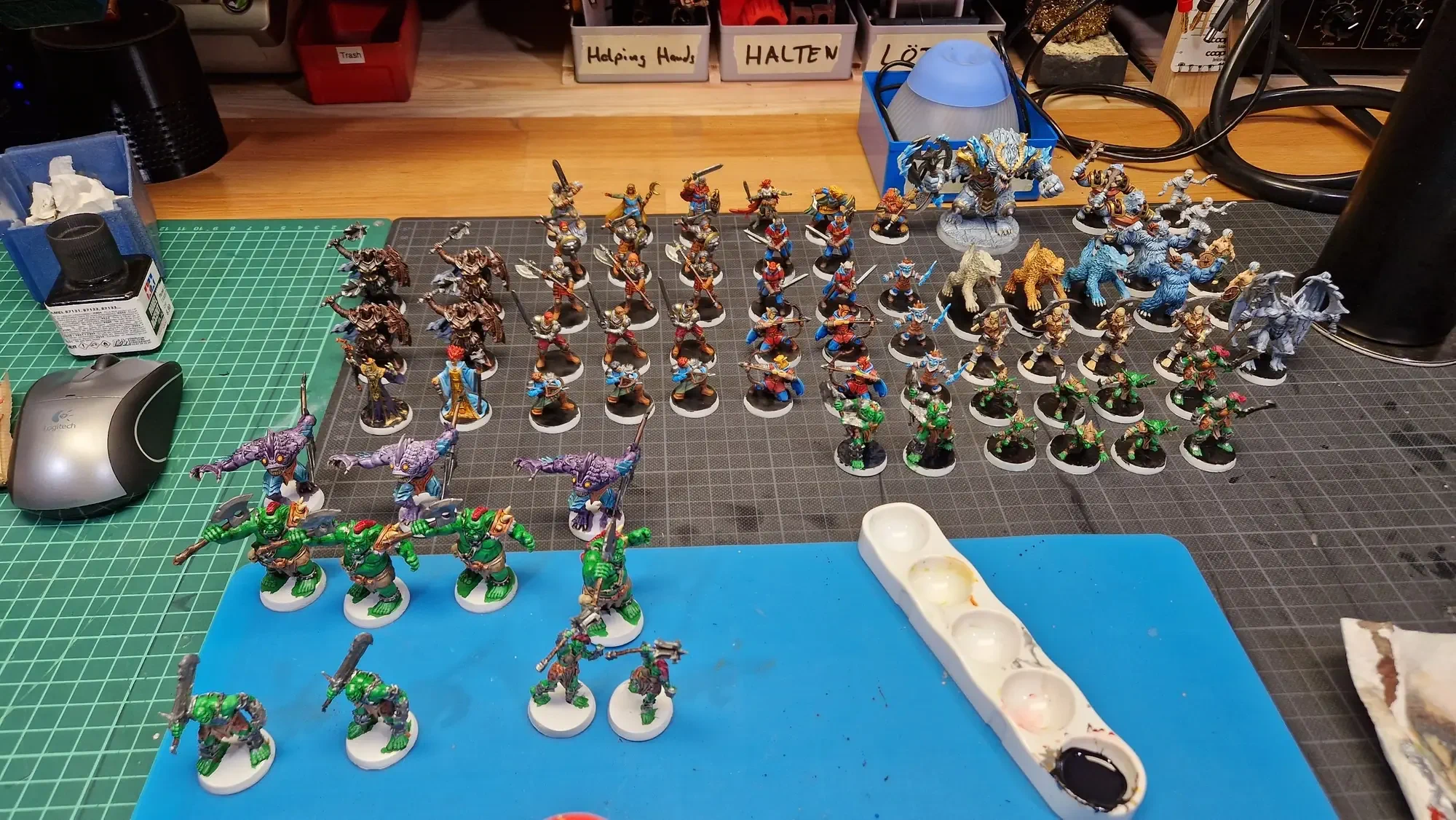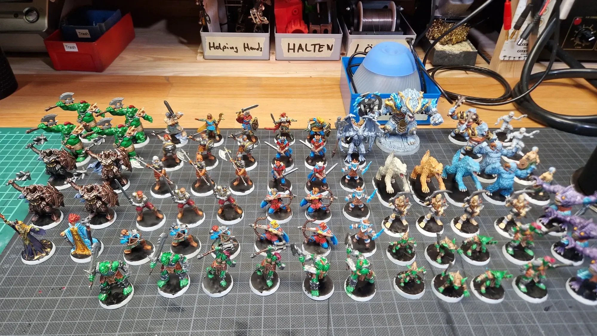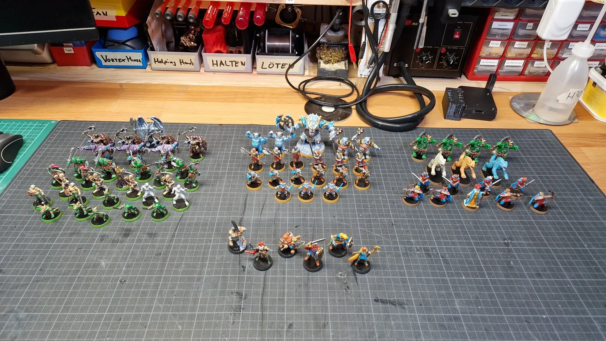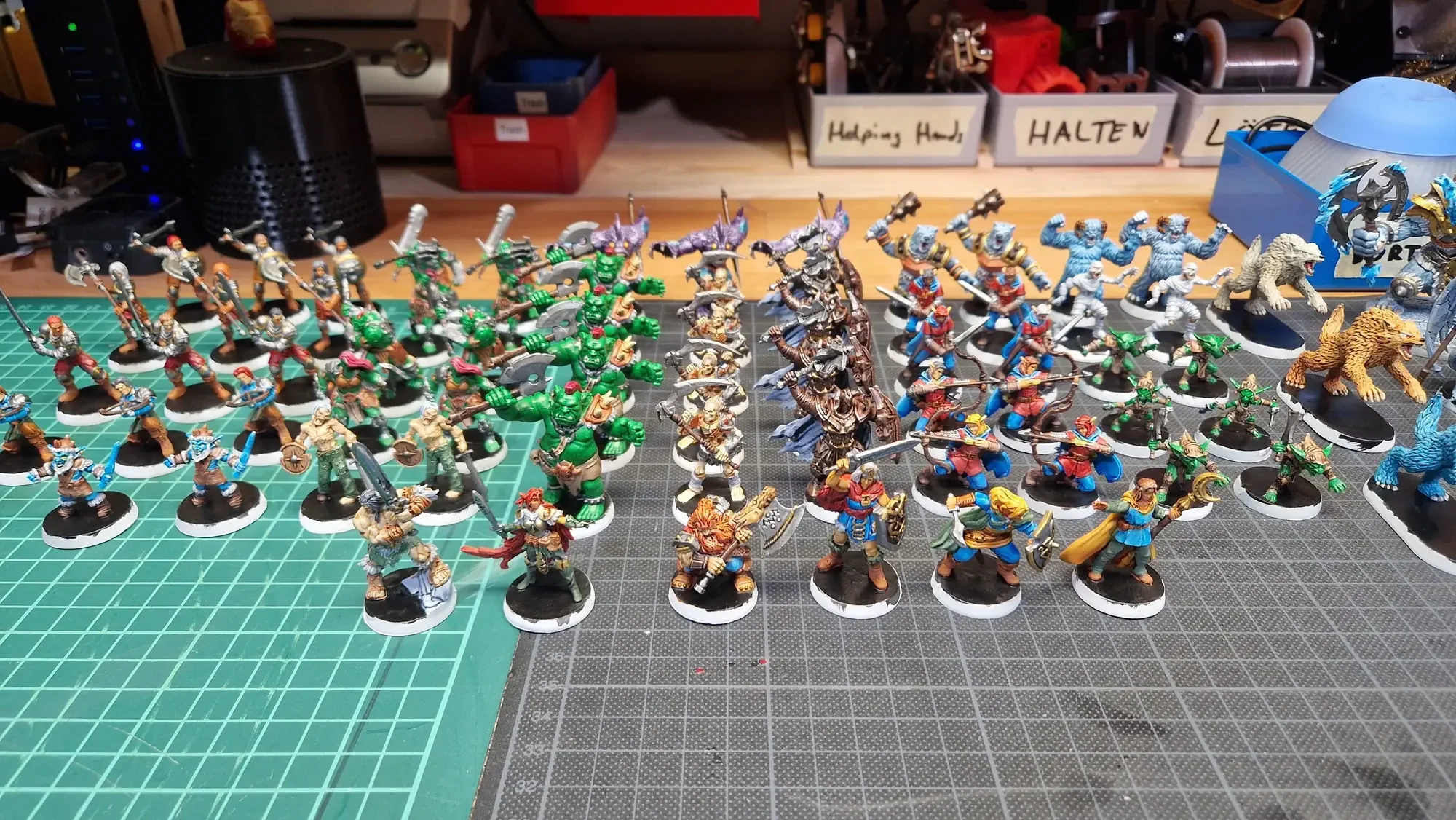 Das Bemalen hat mehrere Abende in Anspruch genommen. Ich habe mich Farbe für Farbe durch alle Minis gearbeitet und lange genug gewartet, dass sich die Armypainter Speed Paints 1.0 (“Die alten”) nicht wieder aktivieren, wenn sie zusammenlaufen.