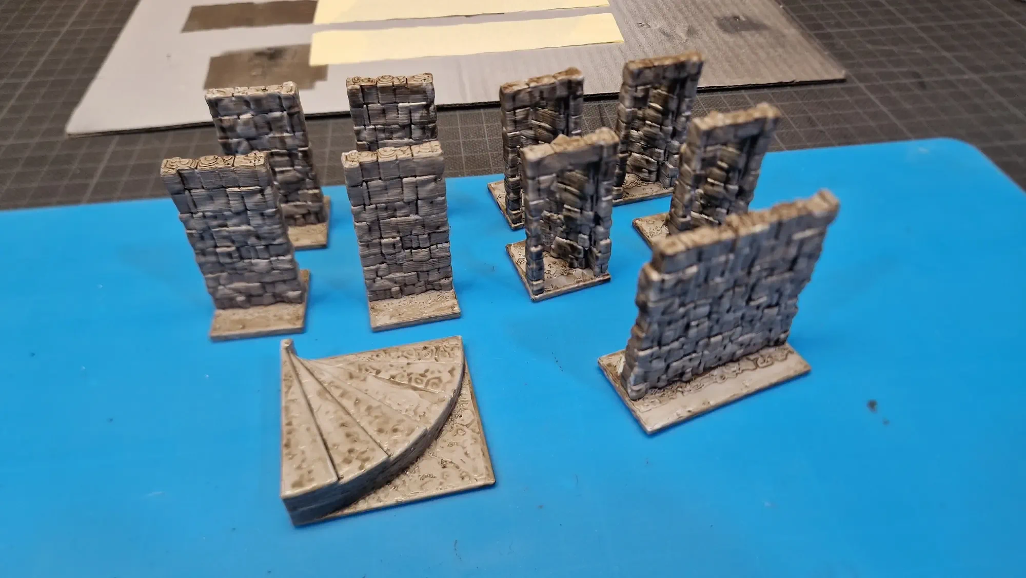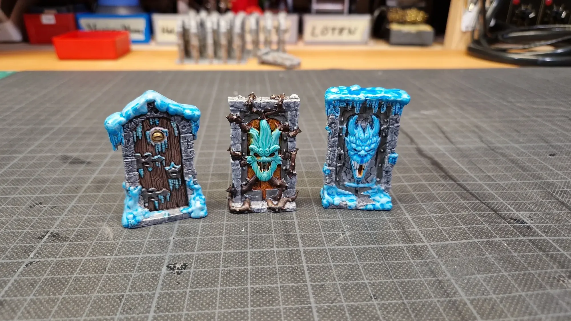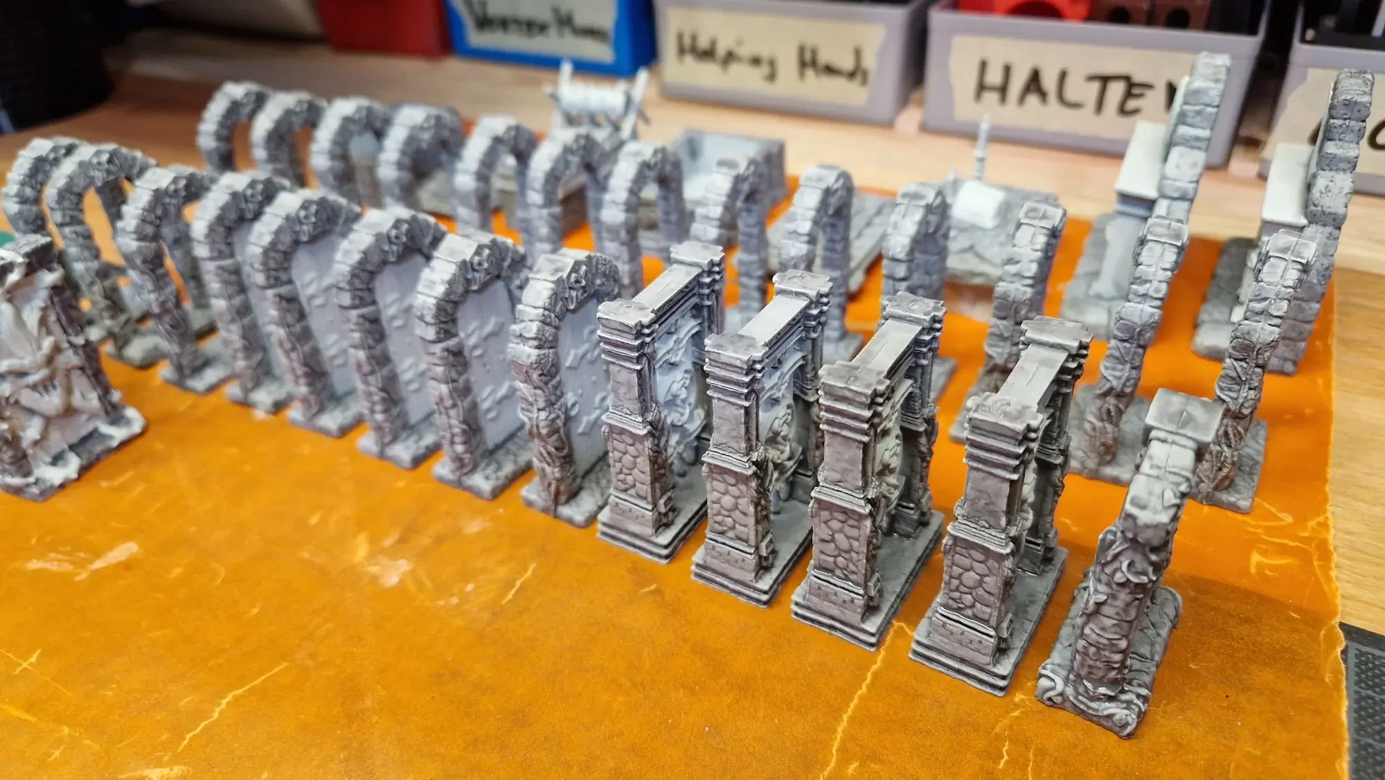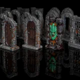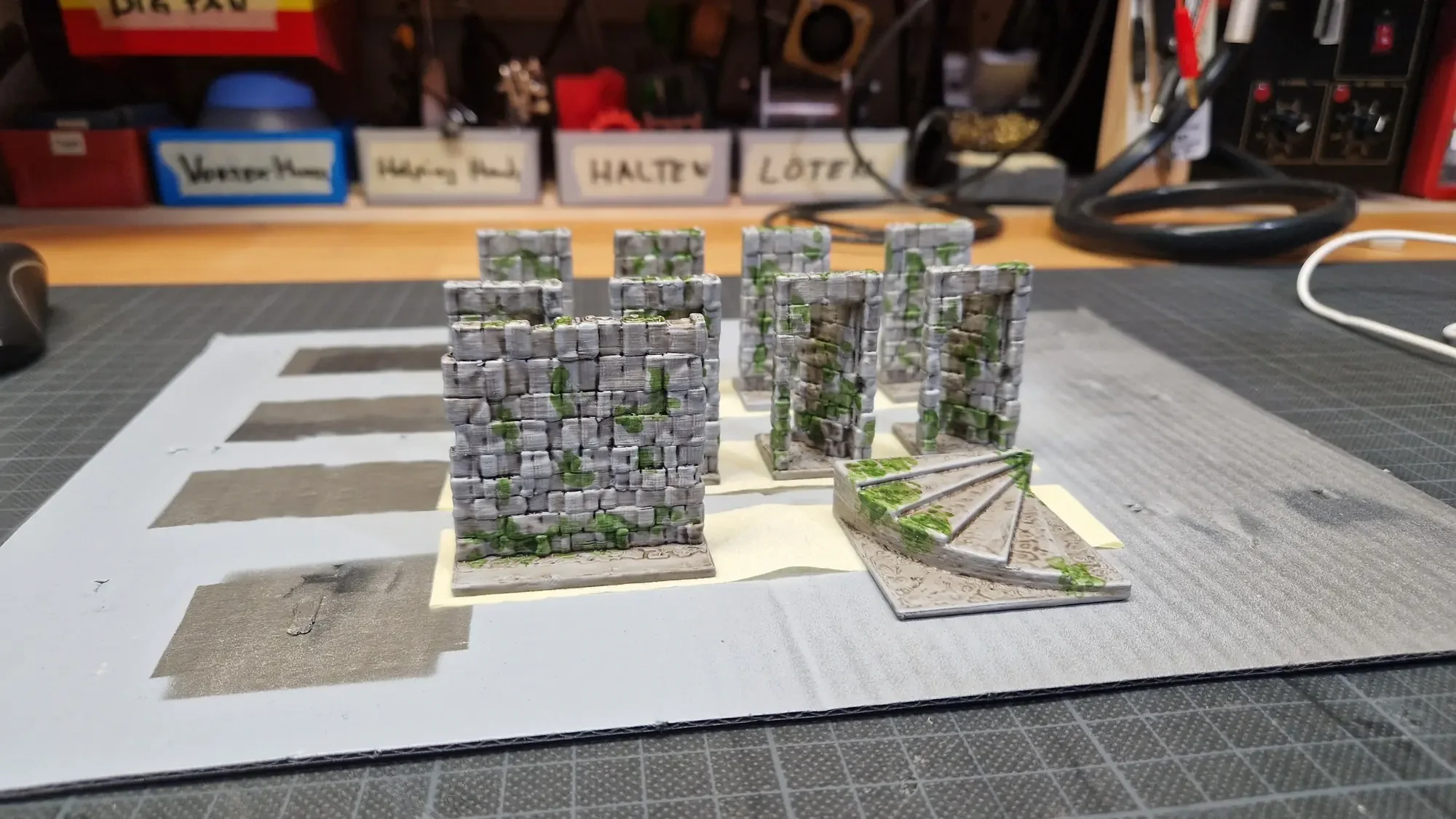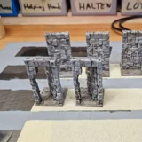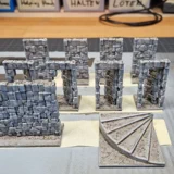 Im Spiel sind Wände mit und ohne Geheimtüren nur Tokens die auf dem Spielfeld abgelegt werden. Ich habe jedoch schöne 3D-Modelle (Wände, Doppelwand, Wand mit Gehimtür) gefunden und gedruckt. Auch die Treppe über welche die Helden jeweils in den Dungeon hinabsteigen, wurde in 3D Gedruckt.