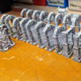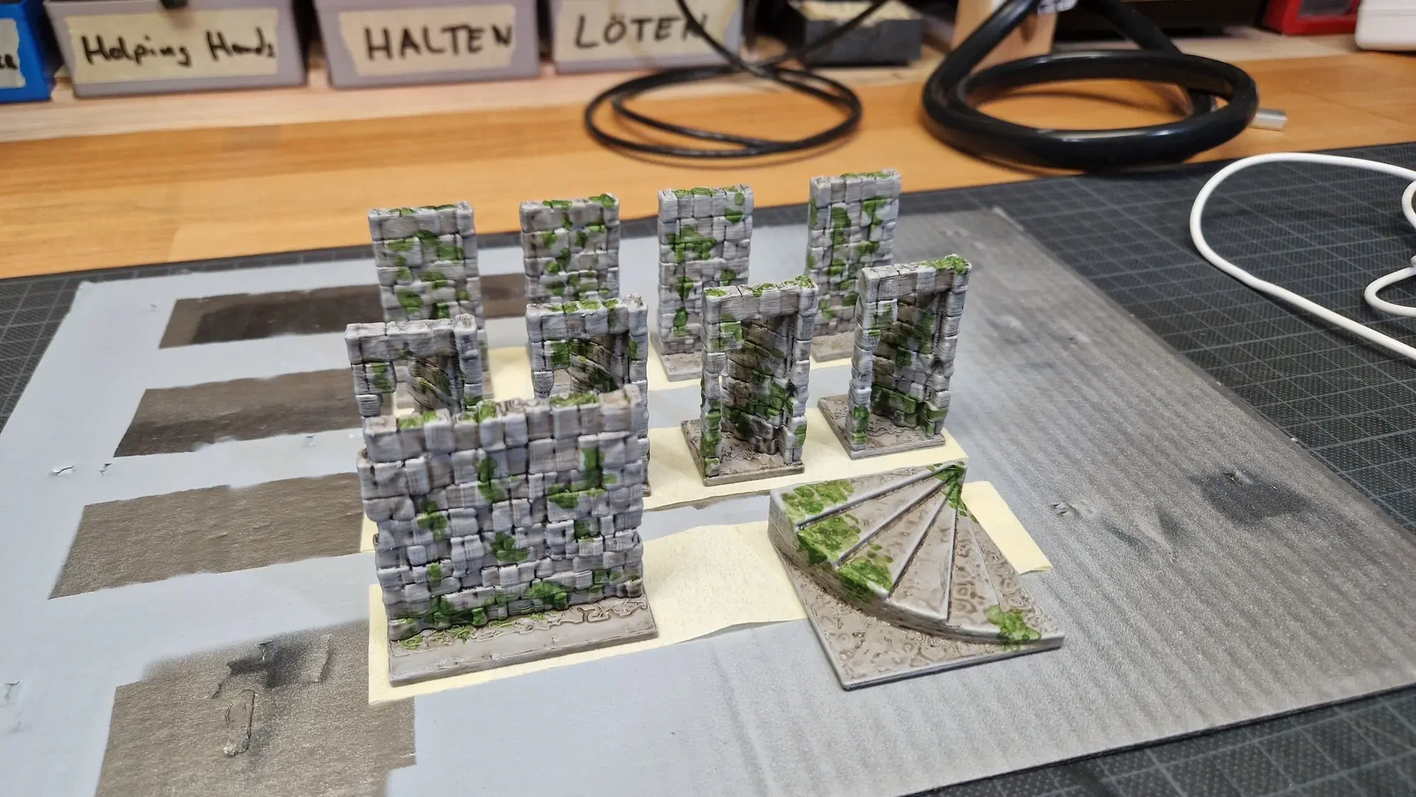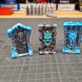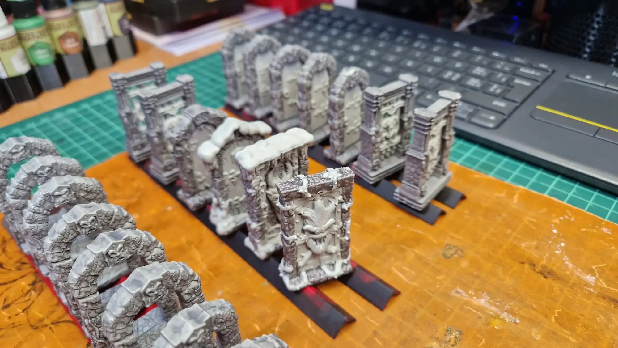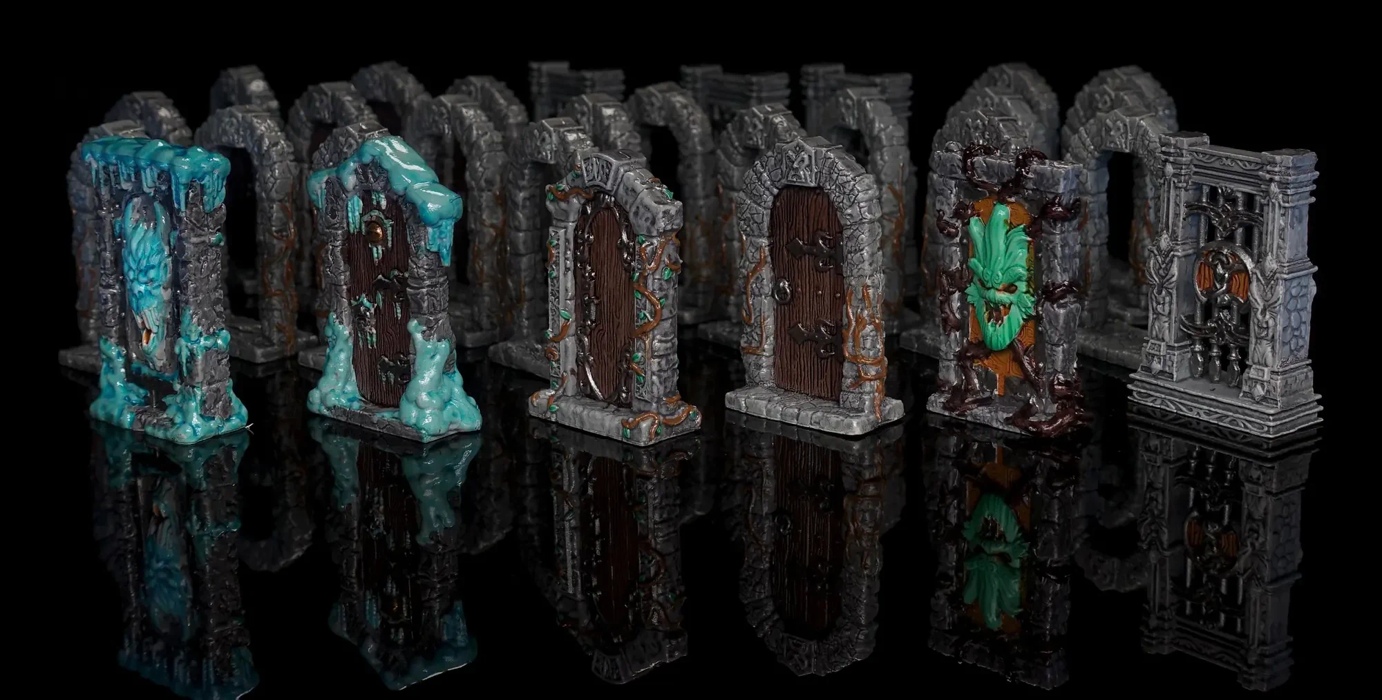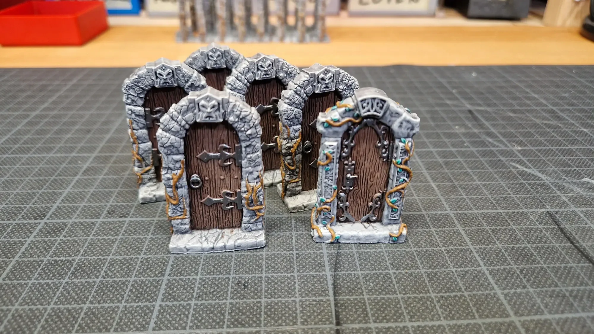 Im Spiel sind Wände mit und ohne Geheimtüren nur Tokens die auf dem Spielfeld abgelegt werden. Ich habe jedoch schöne 3D-Modelle (Wände, Doppelwand, Wand mit Gehimtür) gefunden und gedruckt. Auch die Treppe über welche die Helden jeweils in den Dungeon hinabsteigen, wurde in 3D Gedruckt.