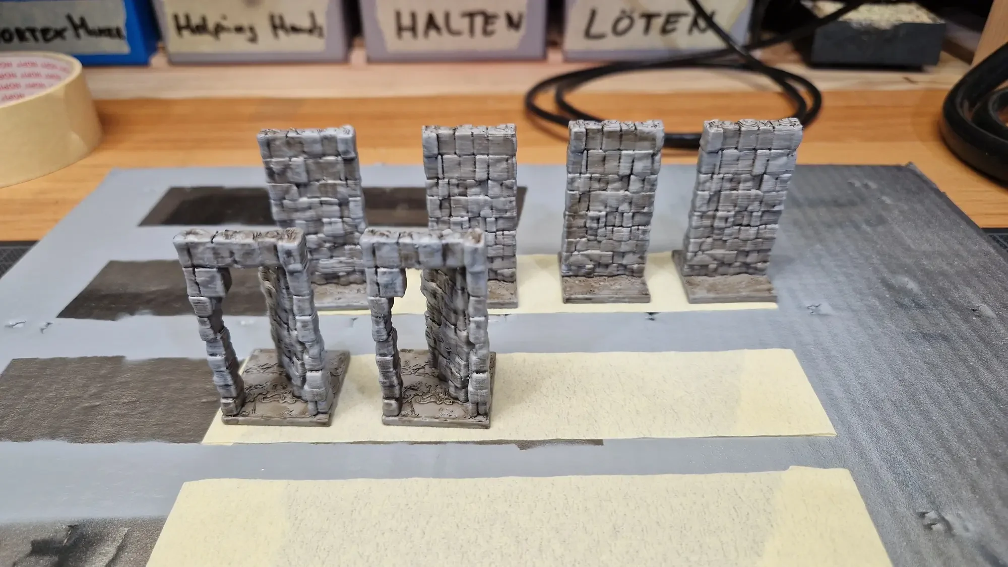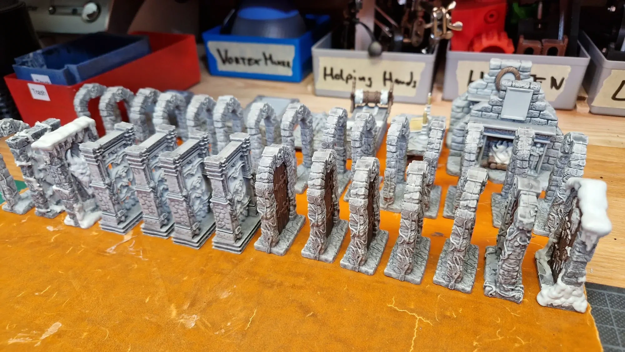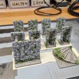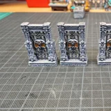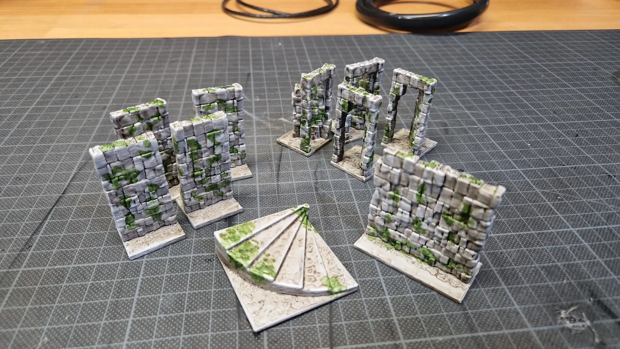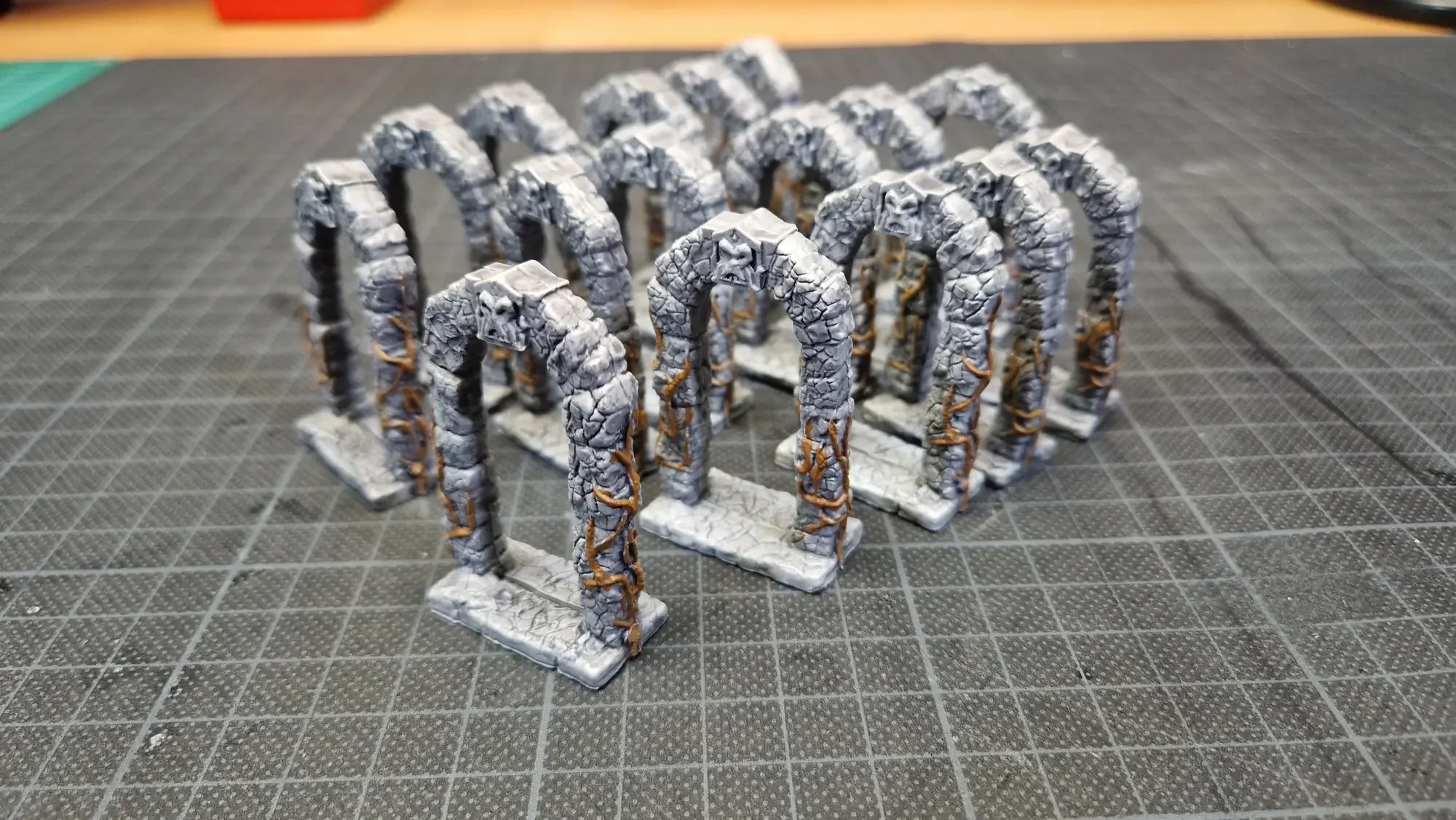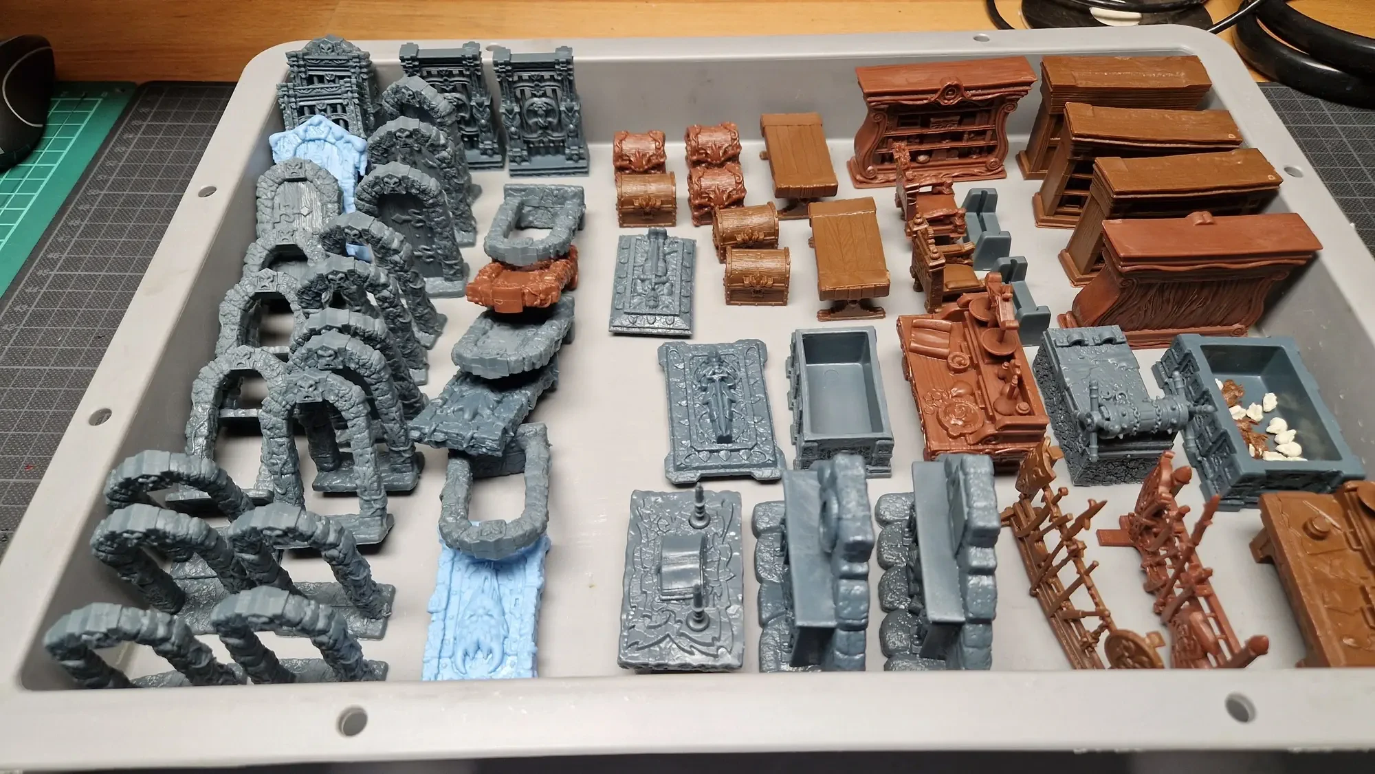 Im Spiel sind Wände mit und ohne Geheimtüren nur Tokens die auf dem Spielfeld abgelegt werden. Ich habe jedoch schöne 3D-Modelle (Wände, Doppelwand, Wand mit Gehimtür) gefunden und gedruckt. Auch die Treppe über welche die Helden jeweils in den Dungeon hinabsteigen, wurde in 3D Gedruckt.
