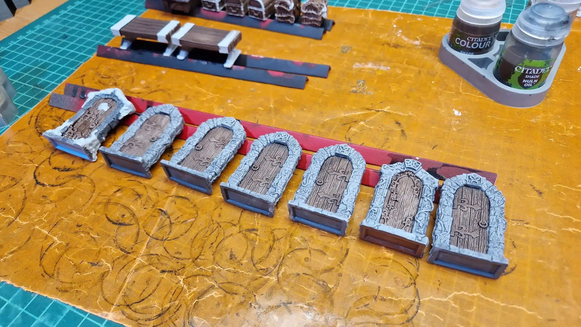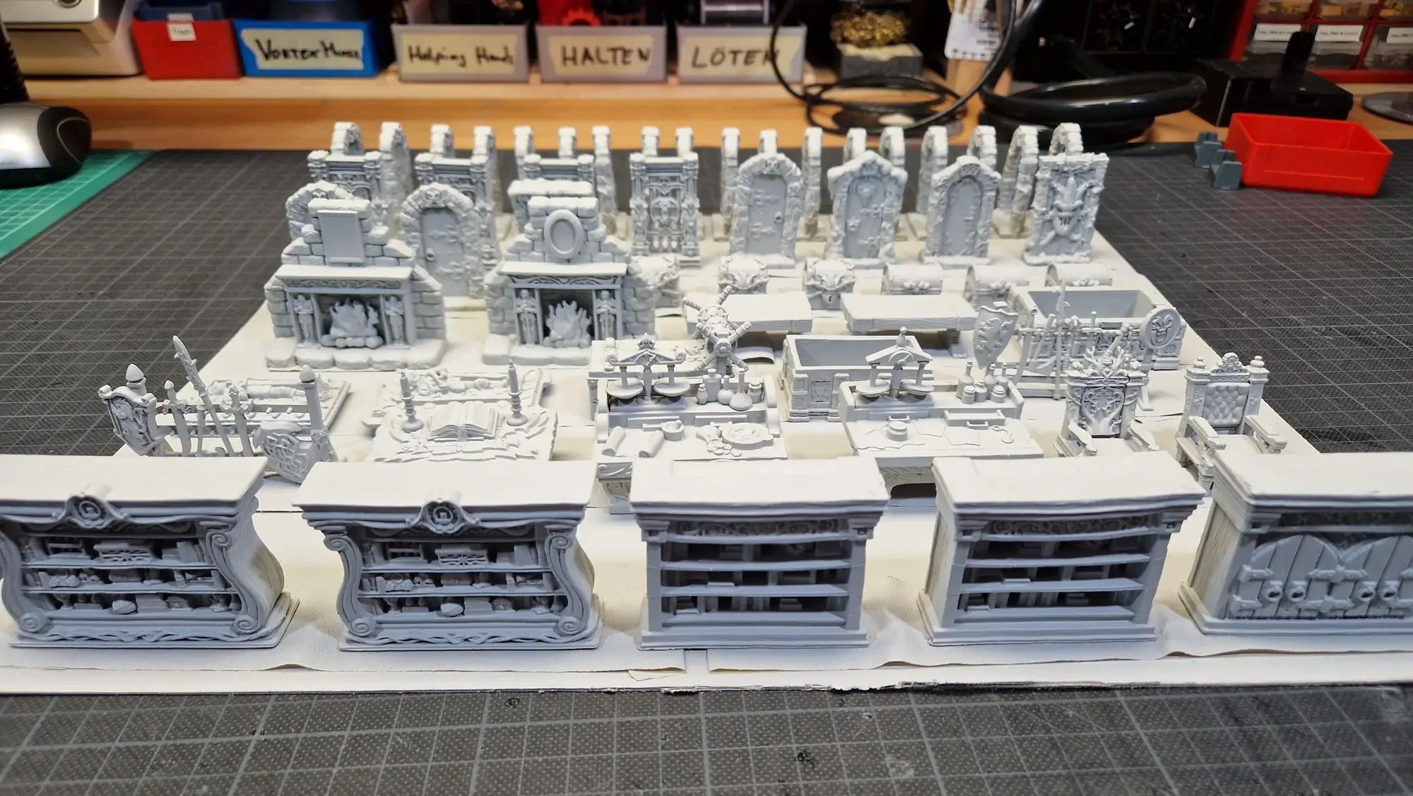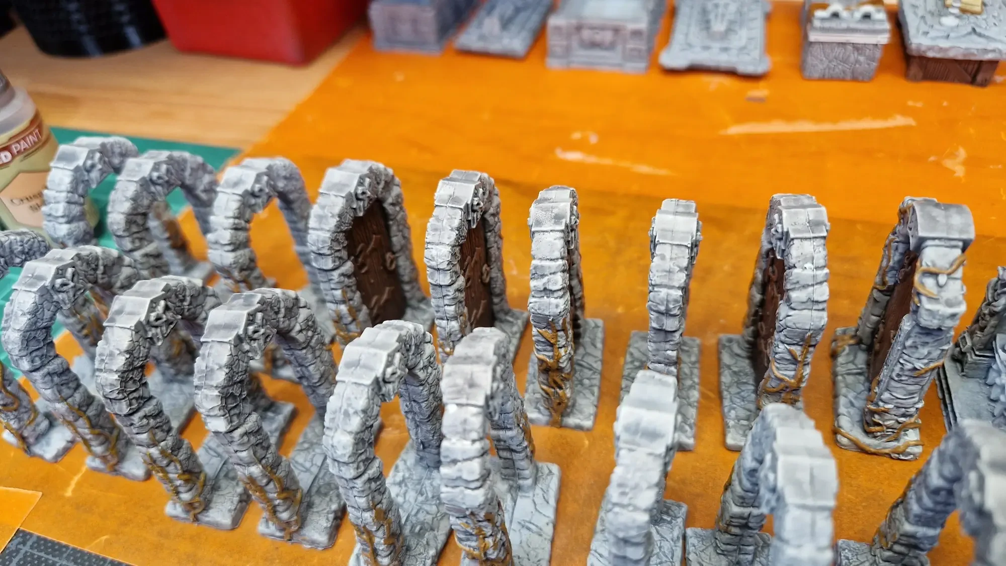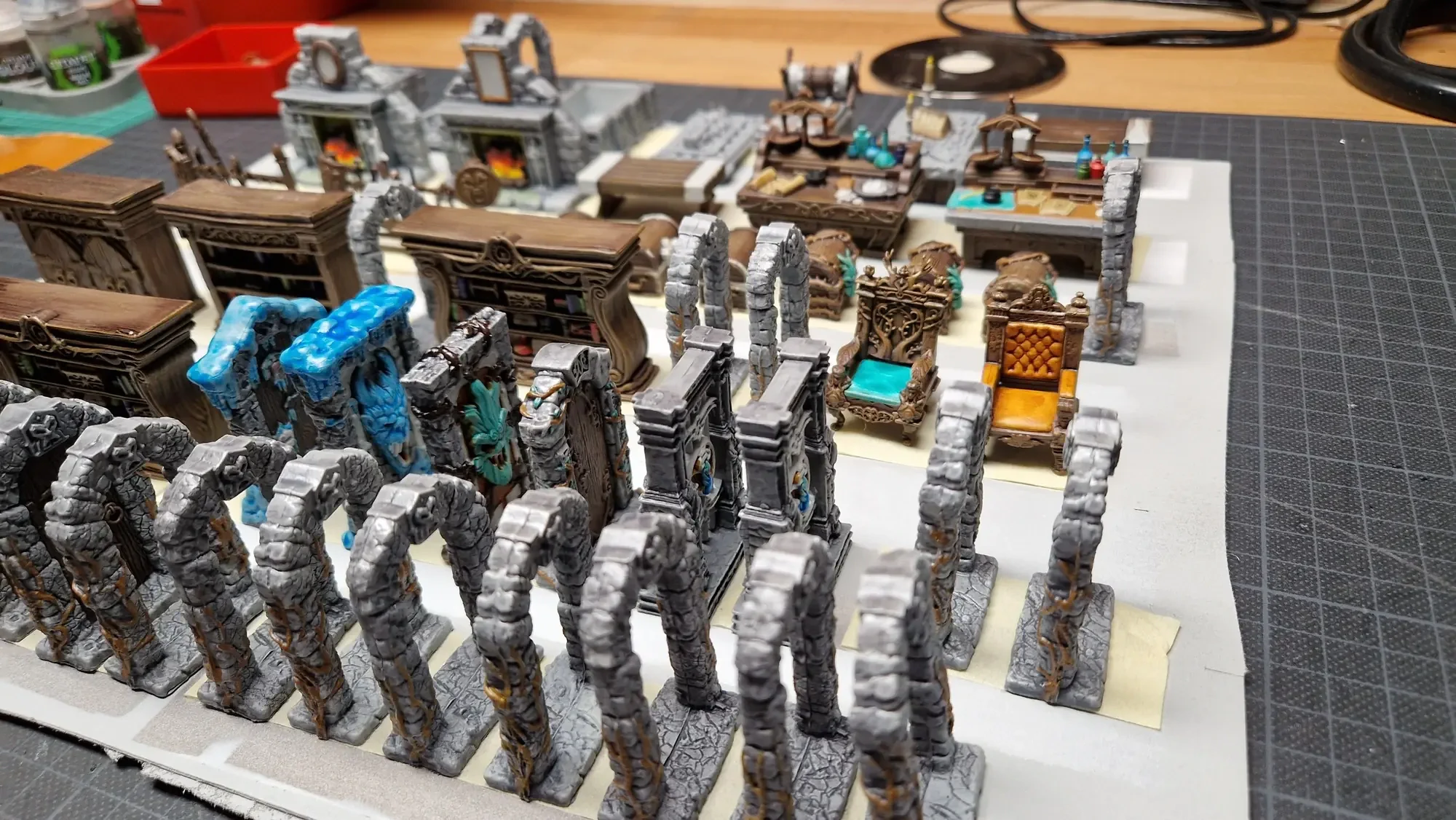 Im Spiel sind Wände mit und ohne Geheimtüren nur Tokens die auf dem Spielfeld abgelegt werden. Ich habe jedoch schöne 3D-Modelle (Wände, Doppelwand, Wand mit Gehimtür) gefunden und gedruckt. Auch die Treppe über welche die Helden jeweils in den Dungeon hinabsteigen, wurde in 3D Gedruckt.