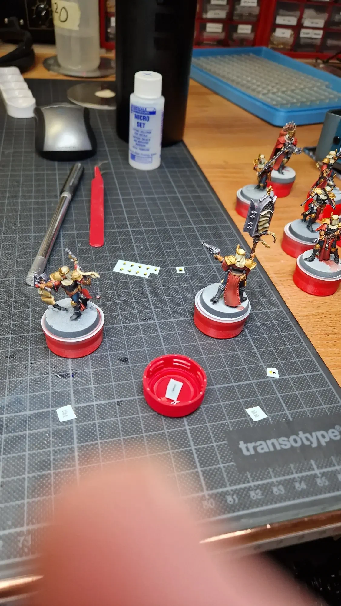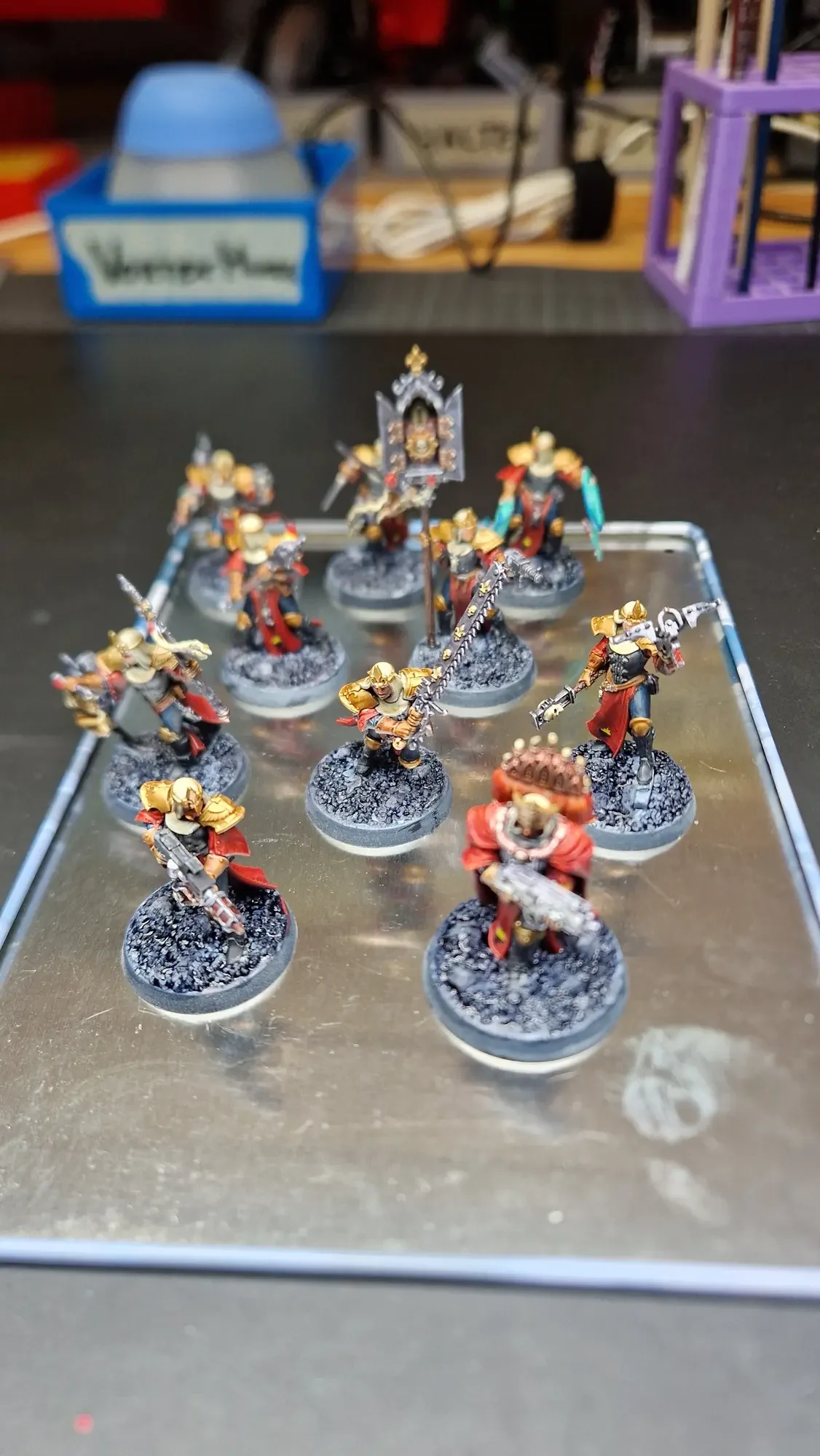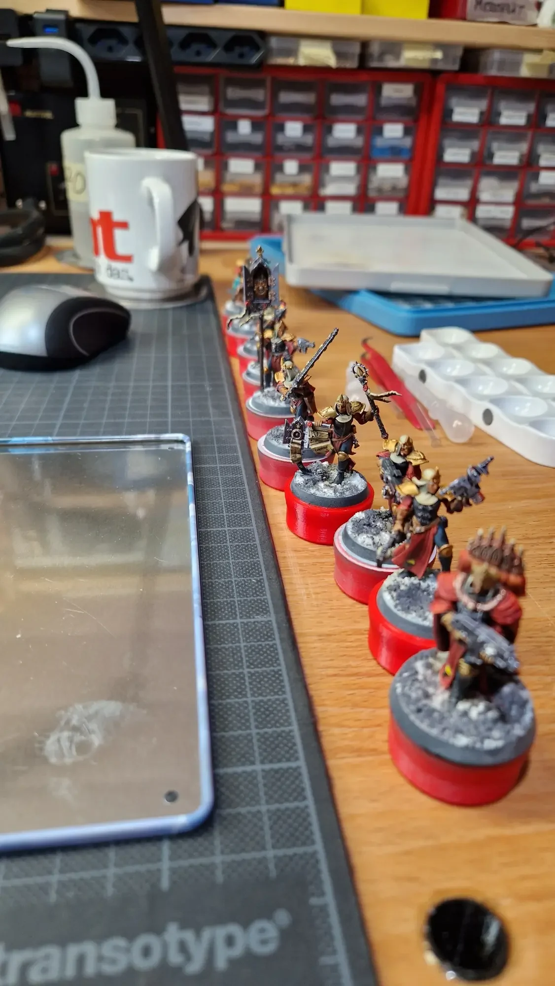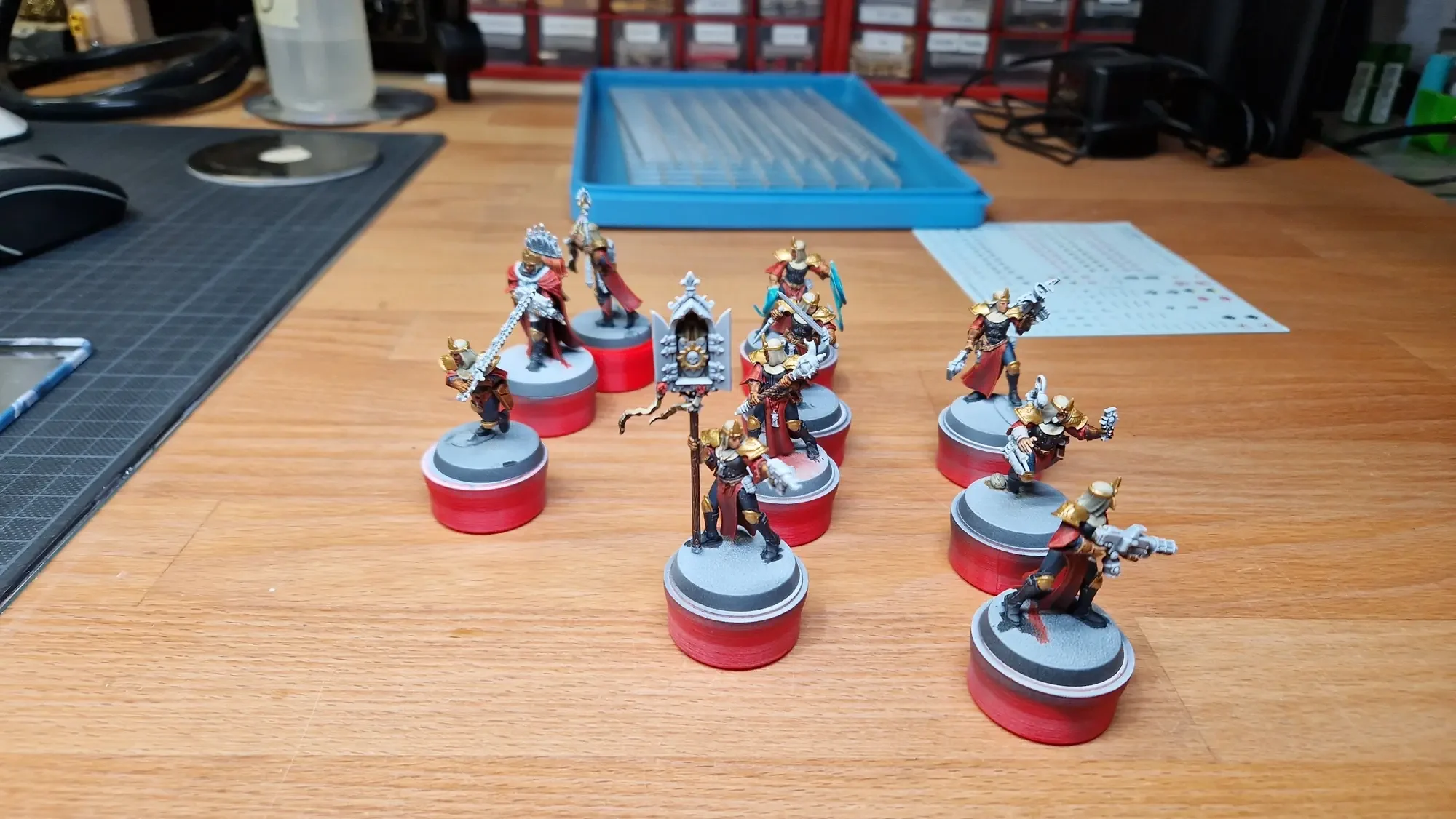 Als letztes habe ich noch die Decals matt versiegelt und die Ränder der Bases schwarz bemalt. Die Kampf-Nonnen sind Einsatzbereit.