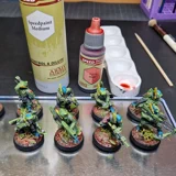 Danach wurden die Minis in schwarz grundiert, mit grau Zenithal gehighlightet und anschliessend mit weiss drybrushed. Diesmal habe ich darauf geachtet, dass der graue Zenithal weniger stark ist, damit der Drybrush die Details und Kanten besser hervorhebt. Anschliessend habe ich alle minis mit gloss versiegelt, damit die Speed Paints gut fliessen können.