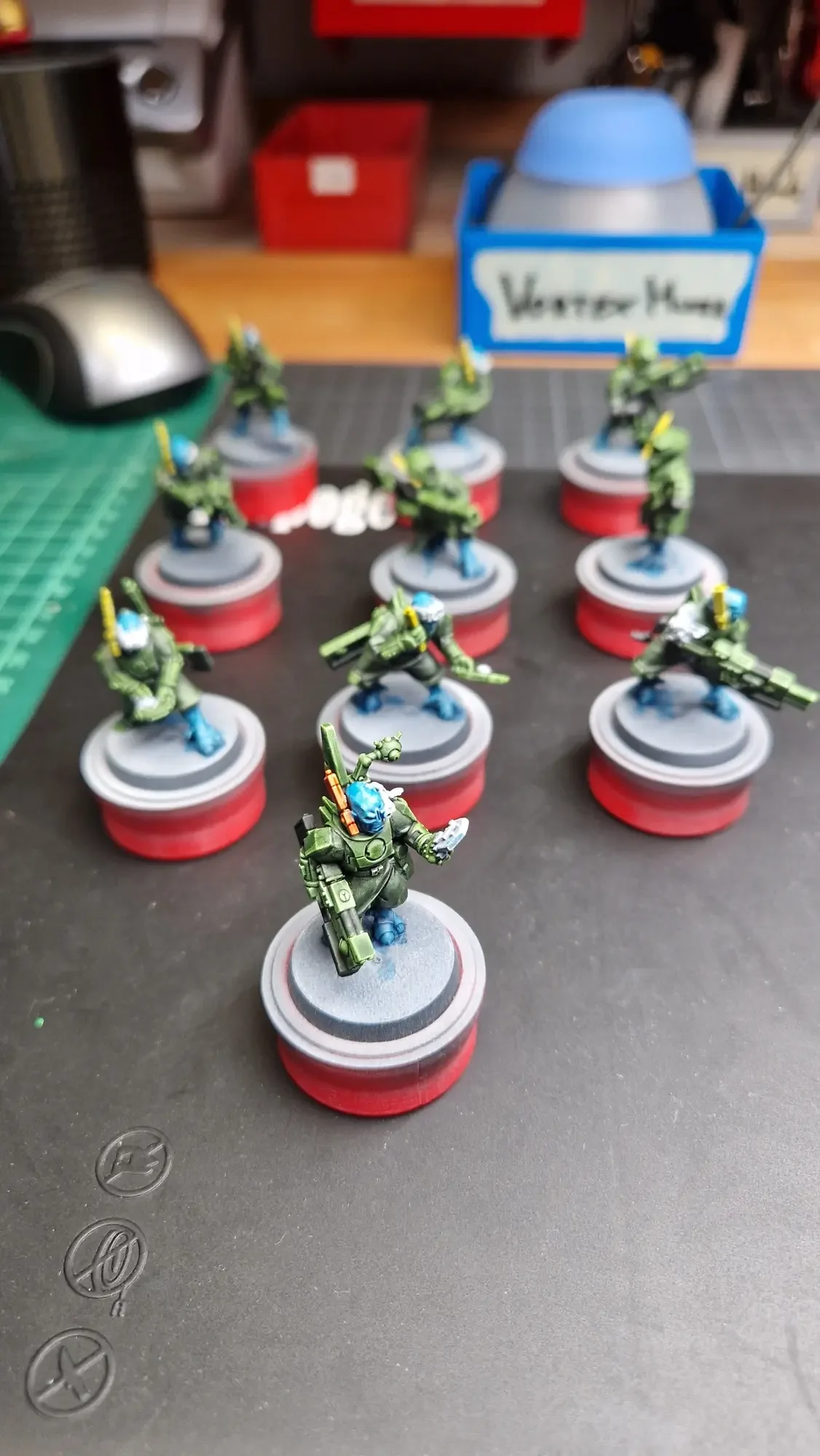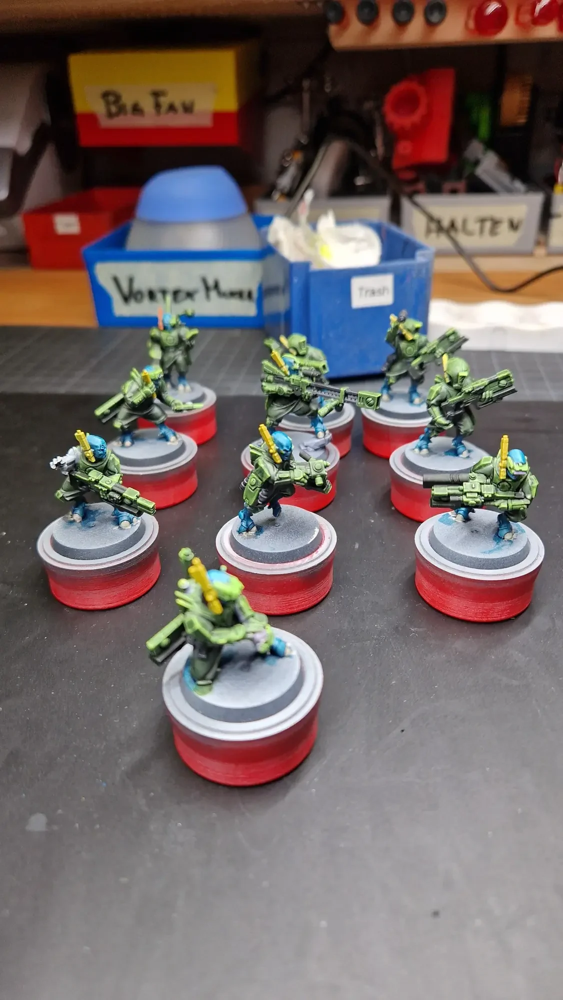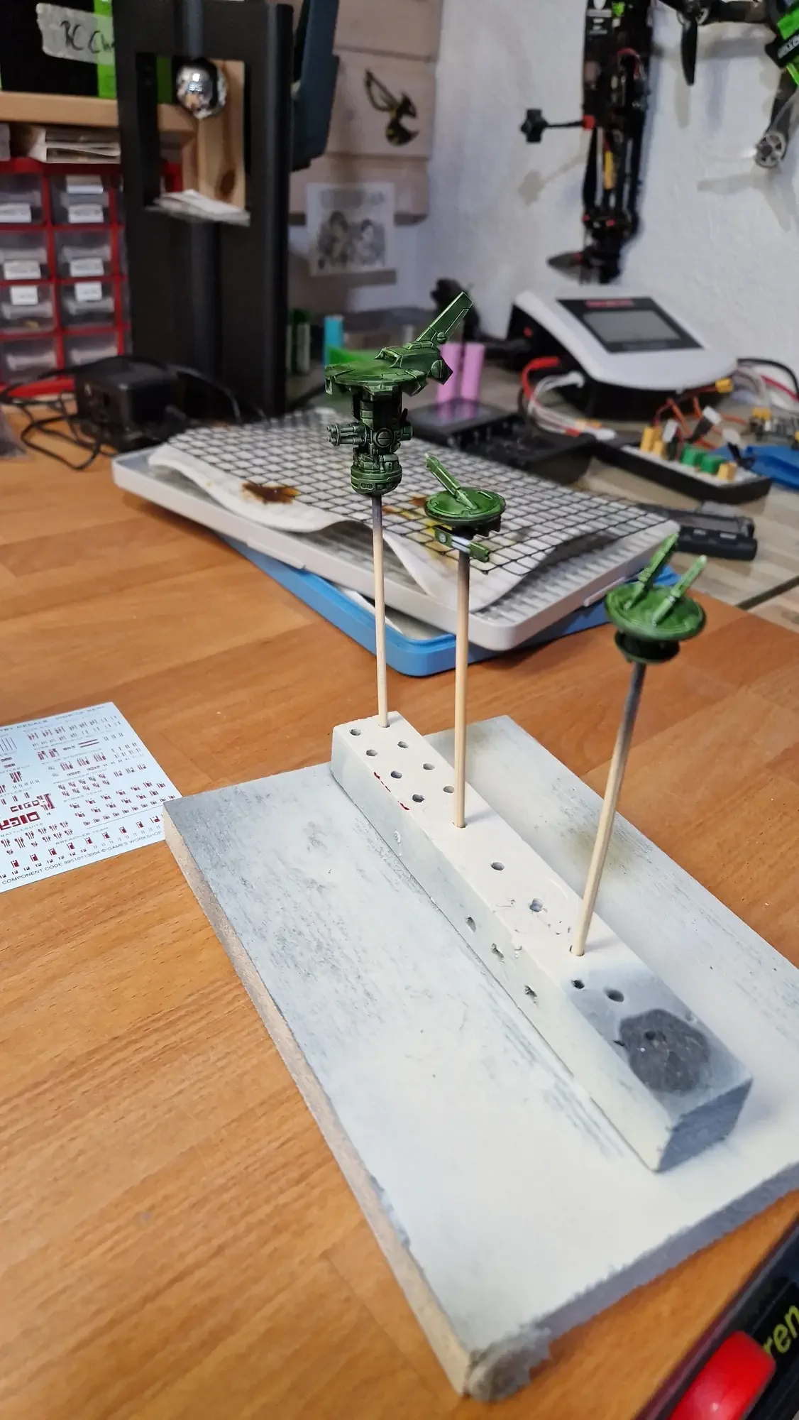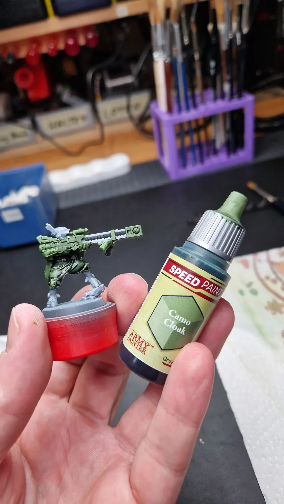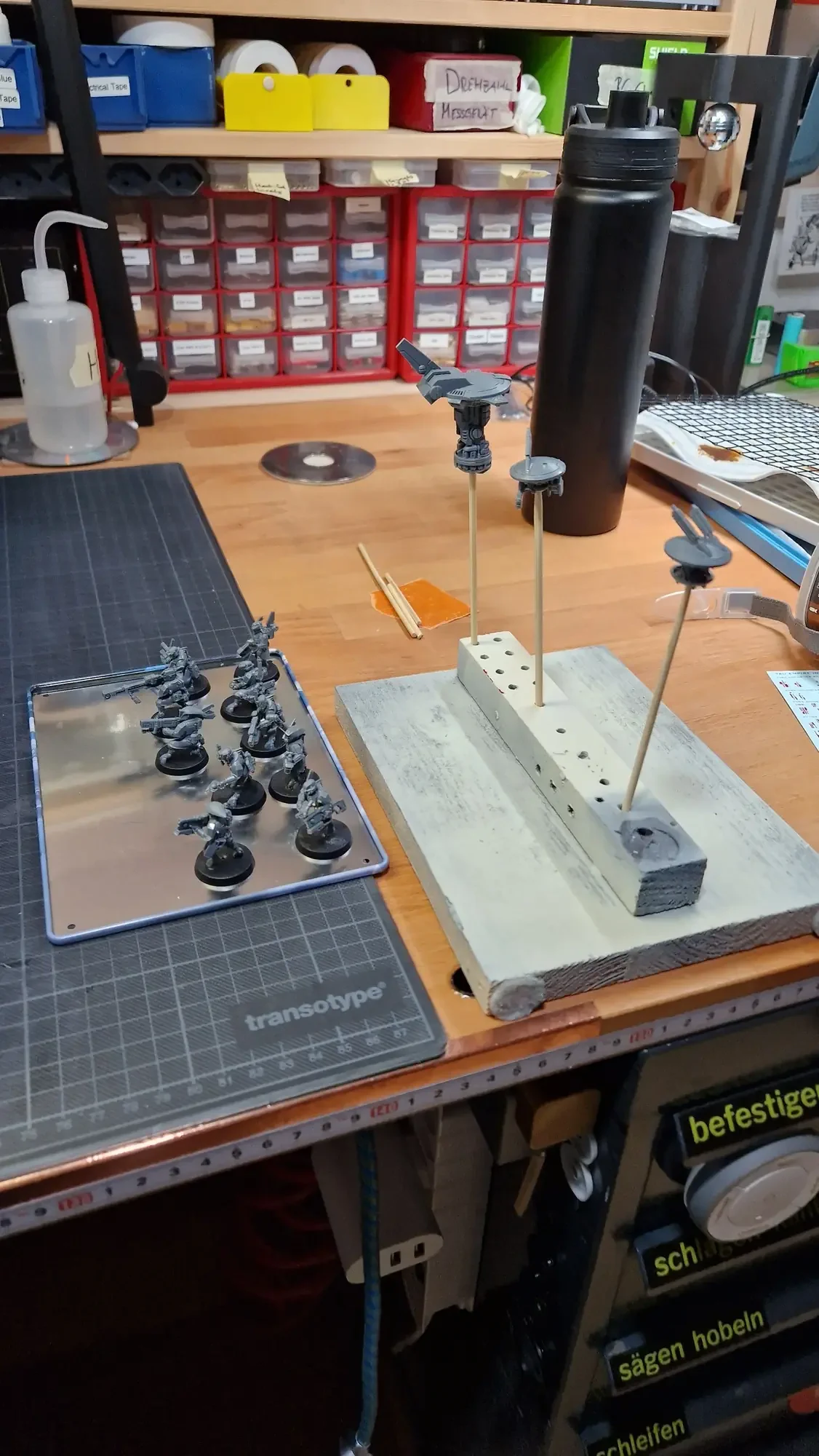 Zuerst Bilder des Build-Prozesses. Da die T’au fliegende Drohnen haben, müssen auch die durchsichtigen Stands magnetisiert werden. Und schon wieder habe ich den Tamiya Leim umgestossen … eine Flasche für 2 Kill Teams… 😒 Also habe ich einen Ständer designed und gedruckt. Praktischerweise passt auch der Tamiya Panel-Liner perfekt in den Halter.