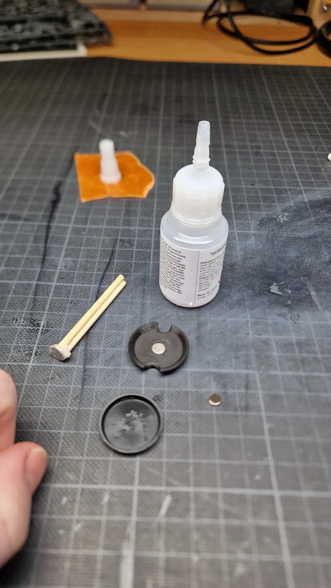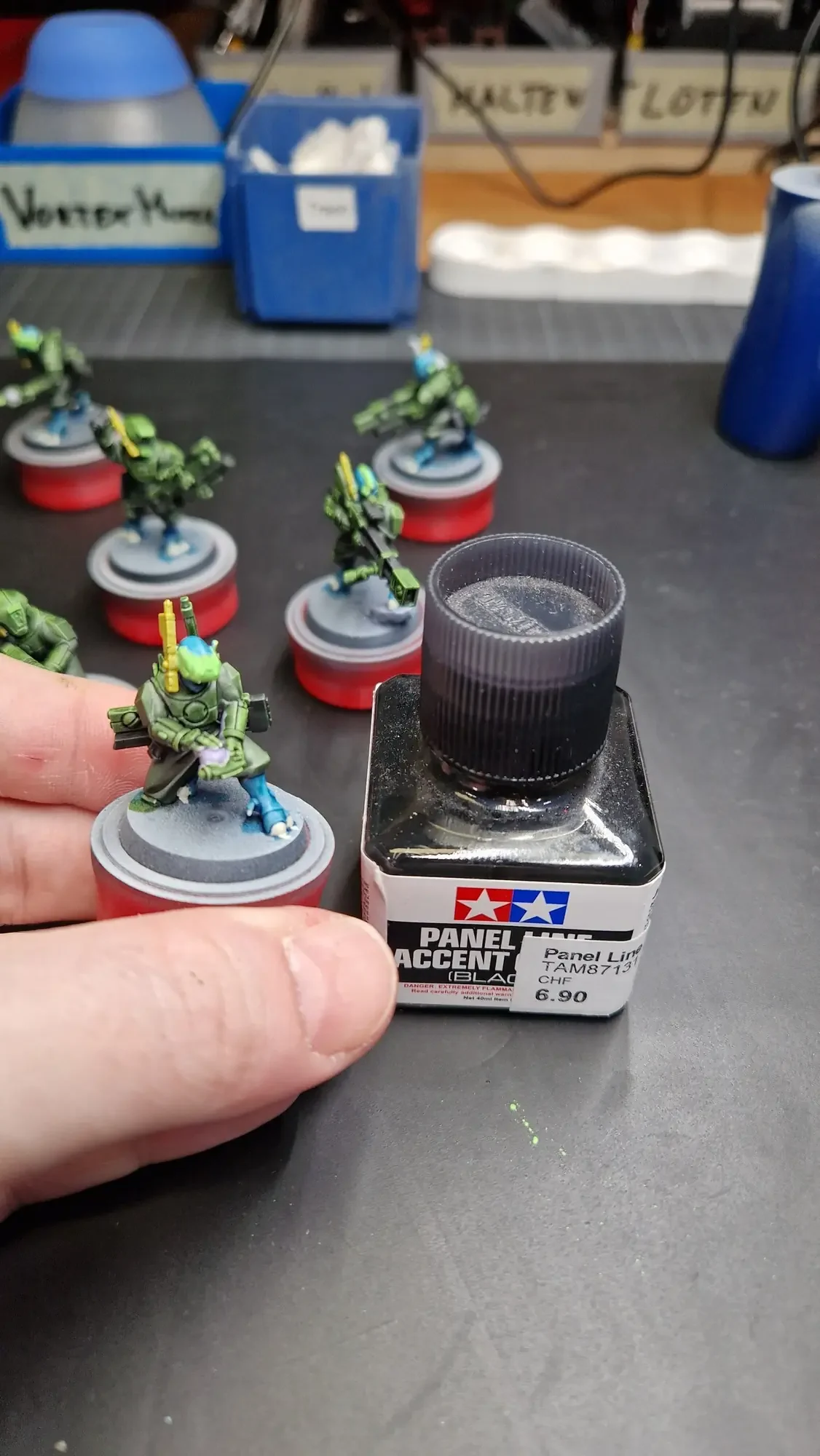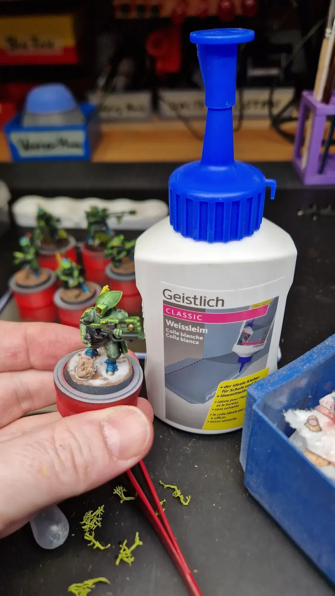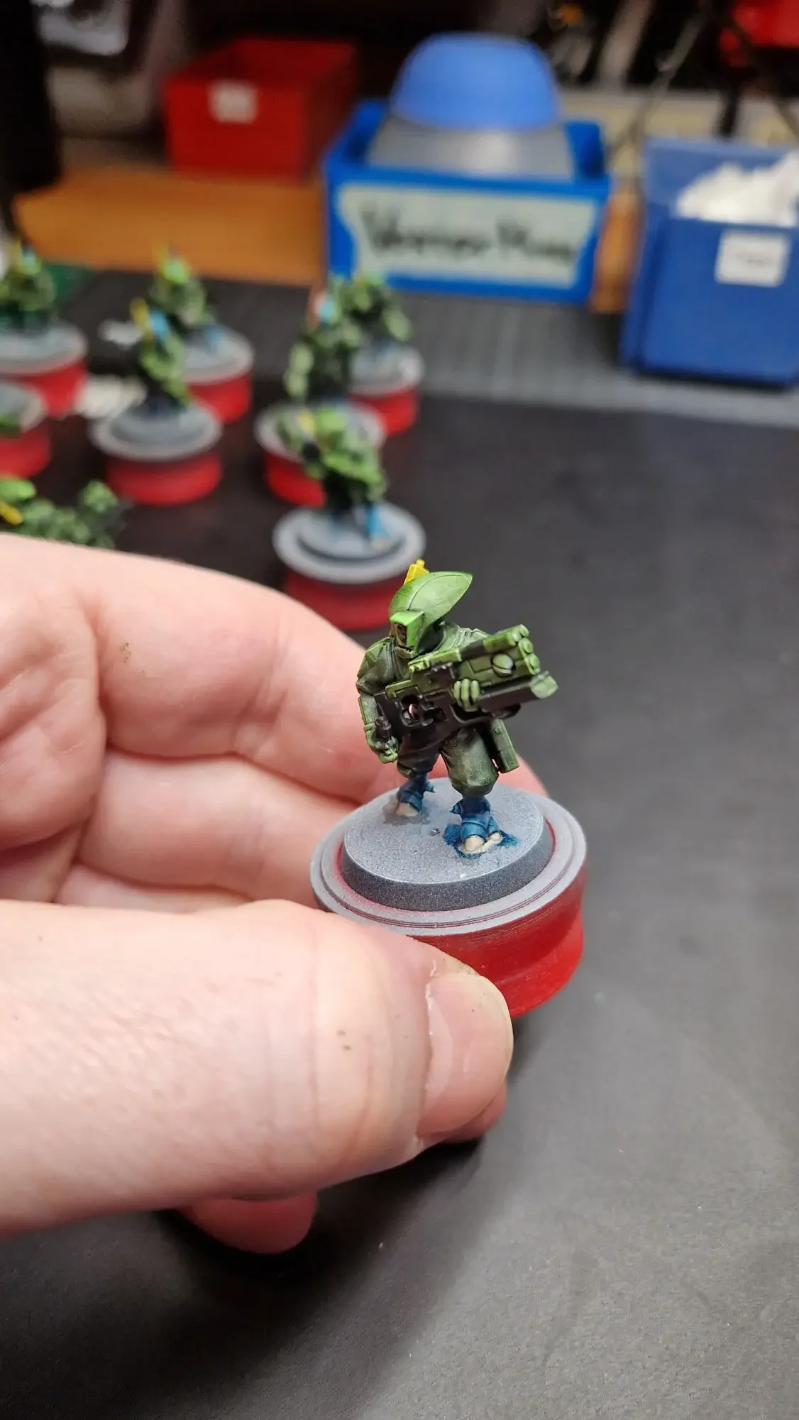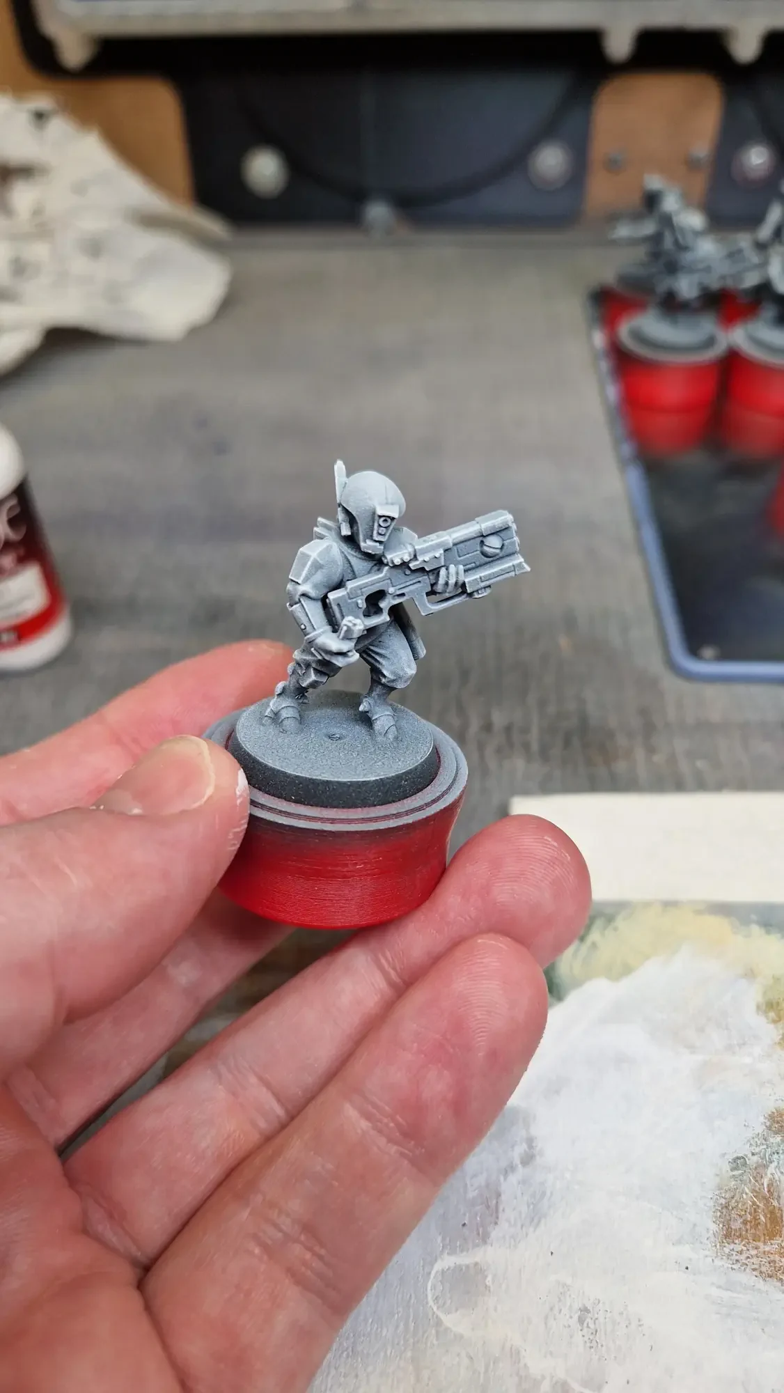Zuerst Bilder des Build-Prozesses. Da die T’au fliegende Drohnen haben, müssen auch die durchsichtigen Stands magnetisiert werden. Und schon wieder habe ich den Tamiya Leim umgestossen … eine Flasche für 2 Kill Teams… 😒 Also habe ich einen Ständer designed und gedruckt. Praktischerweise passt auch der Tamiya Panel-Liner perfekt in den Halter.