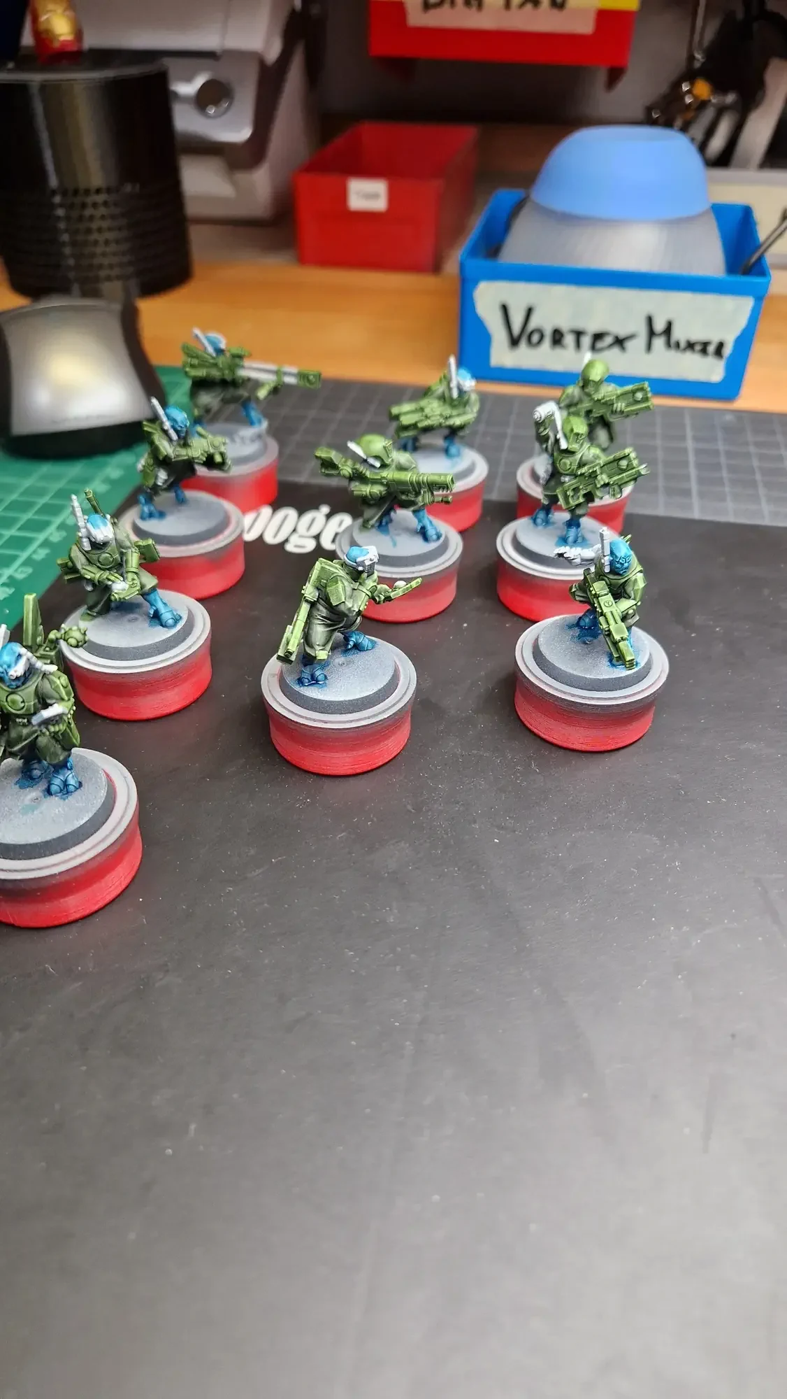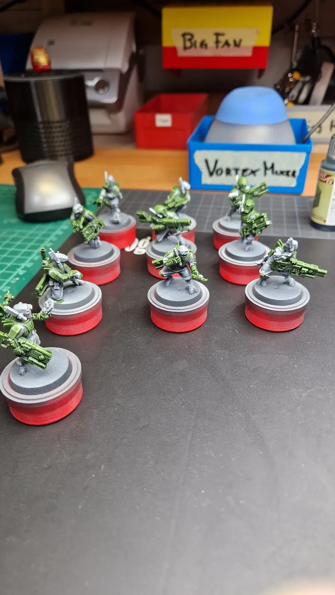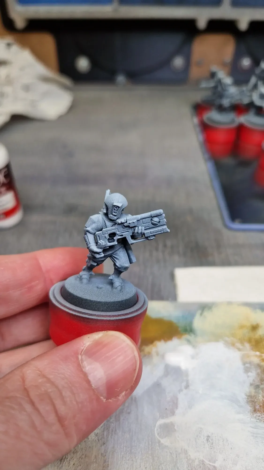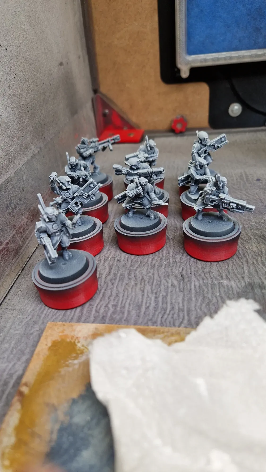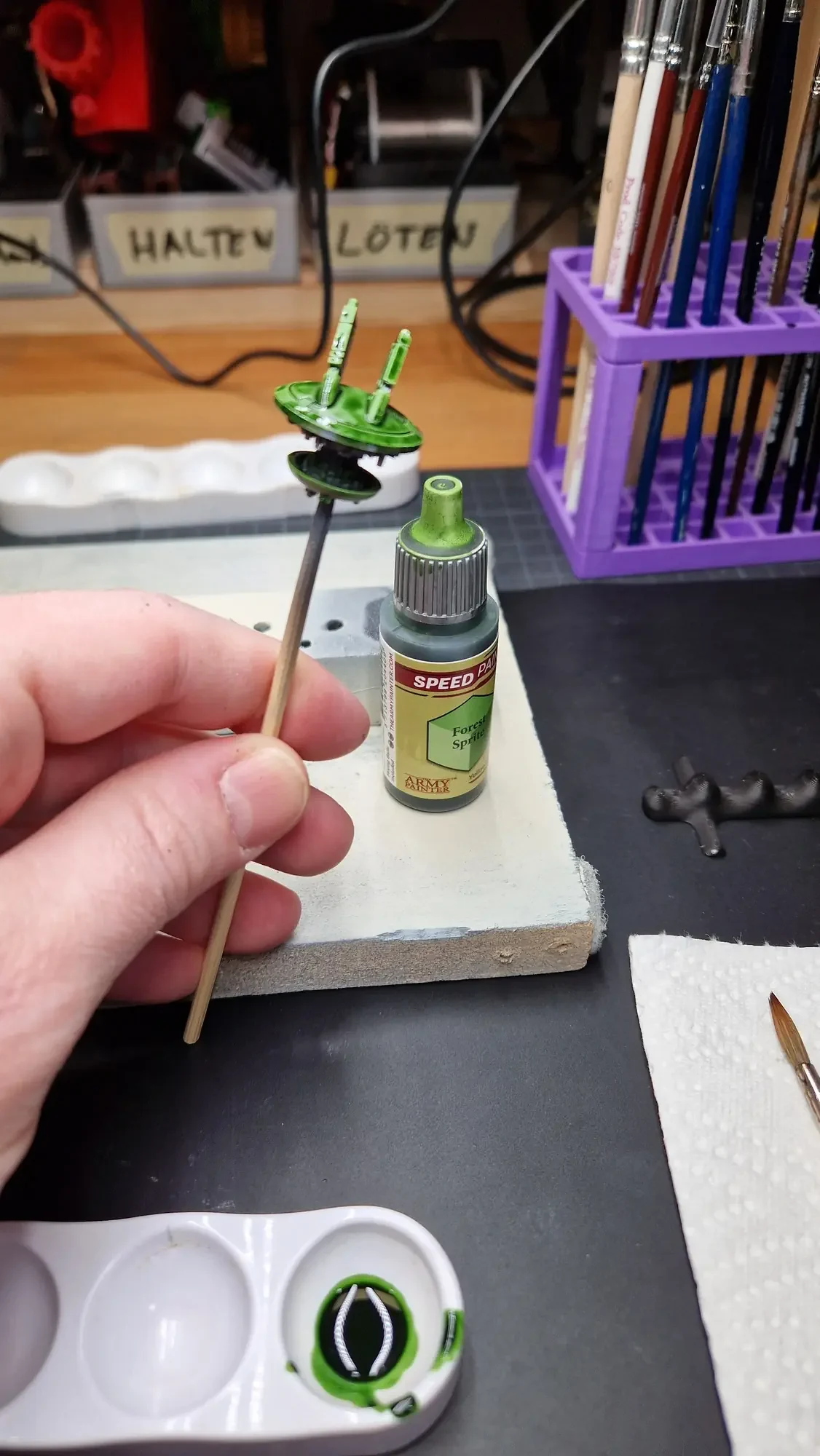 Zuerst Bilder des Build-Prozesses. Da die T’au fliegende Drohnen haben, müssen auch die durchsichtigen Stands magnetisiert werden. Und schon wieder habe ich den Tamiya Leim umgestossen … eine Flasche für 2 Kill Teams… 😒 Also habe ich einen Ständer designed und gedruckt. Praktischerweise passt auch der Tamiya Panel-Liner perfekt in den Halter.