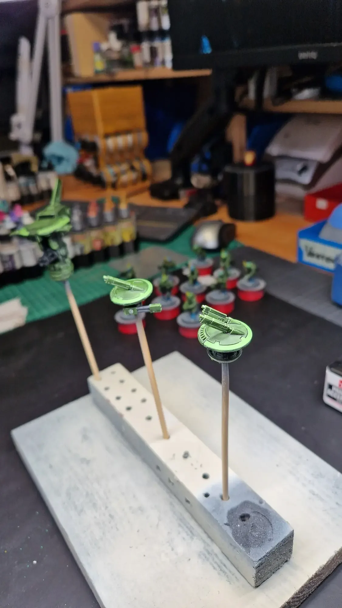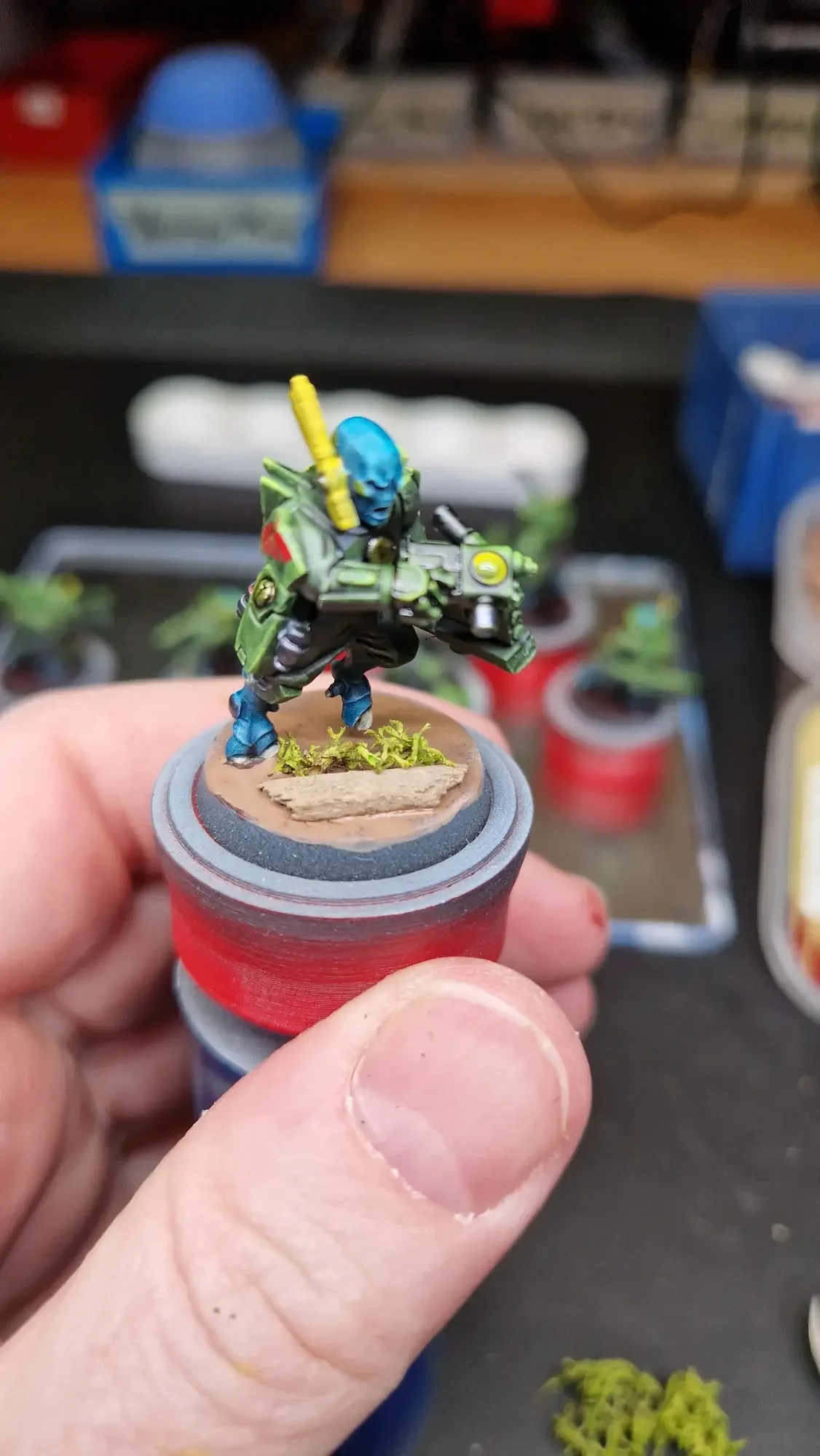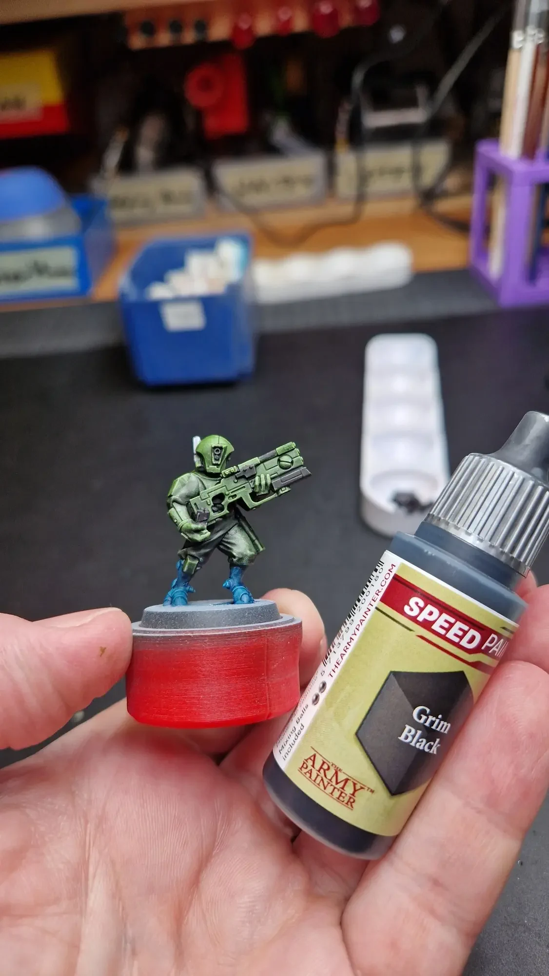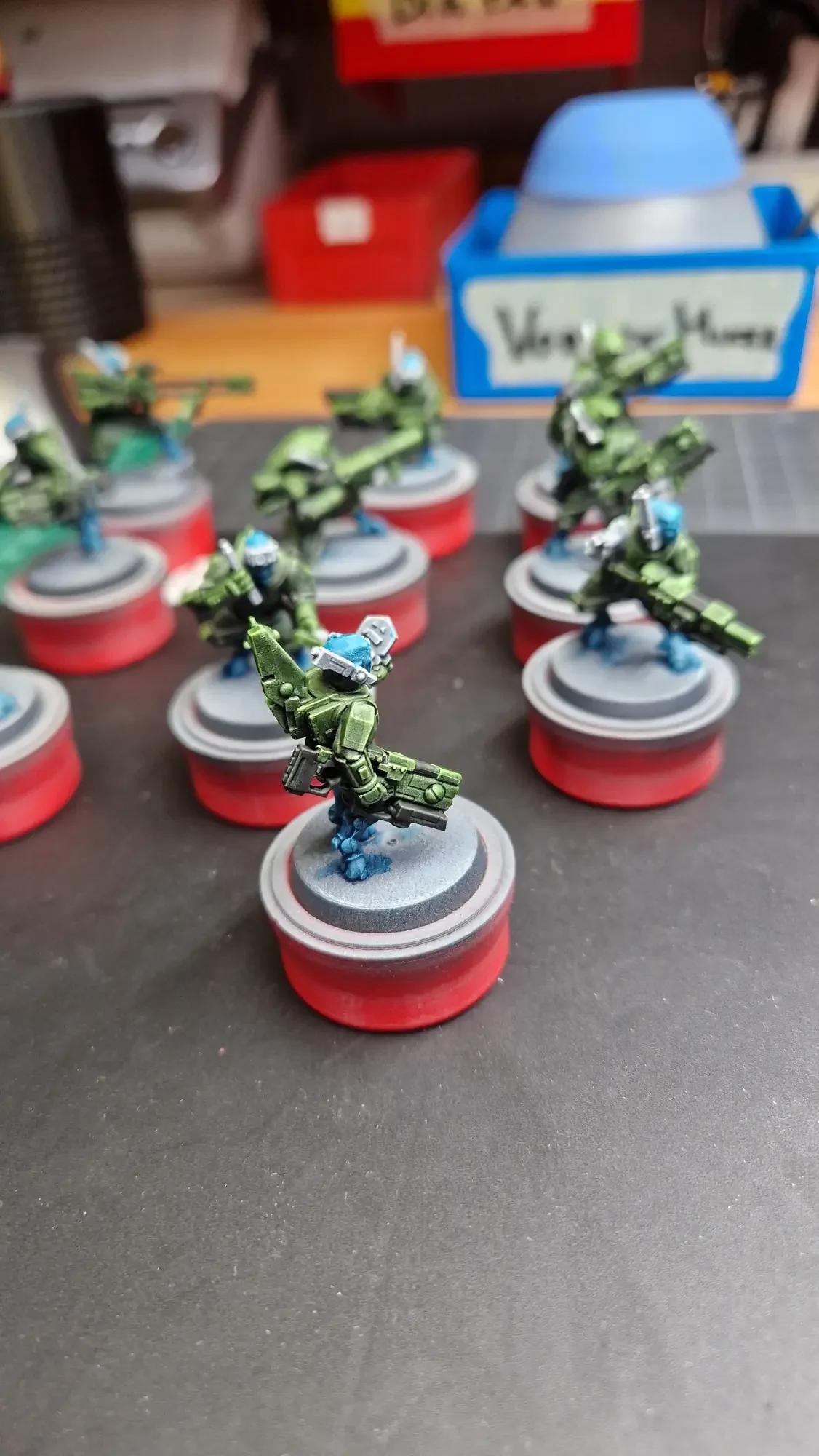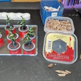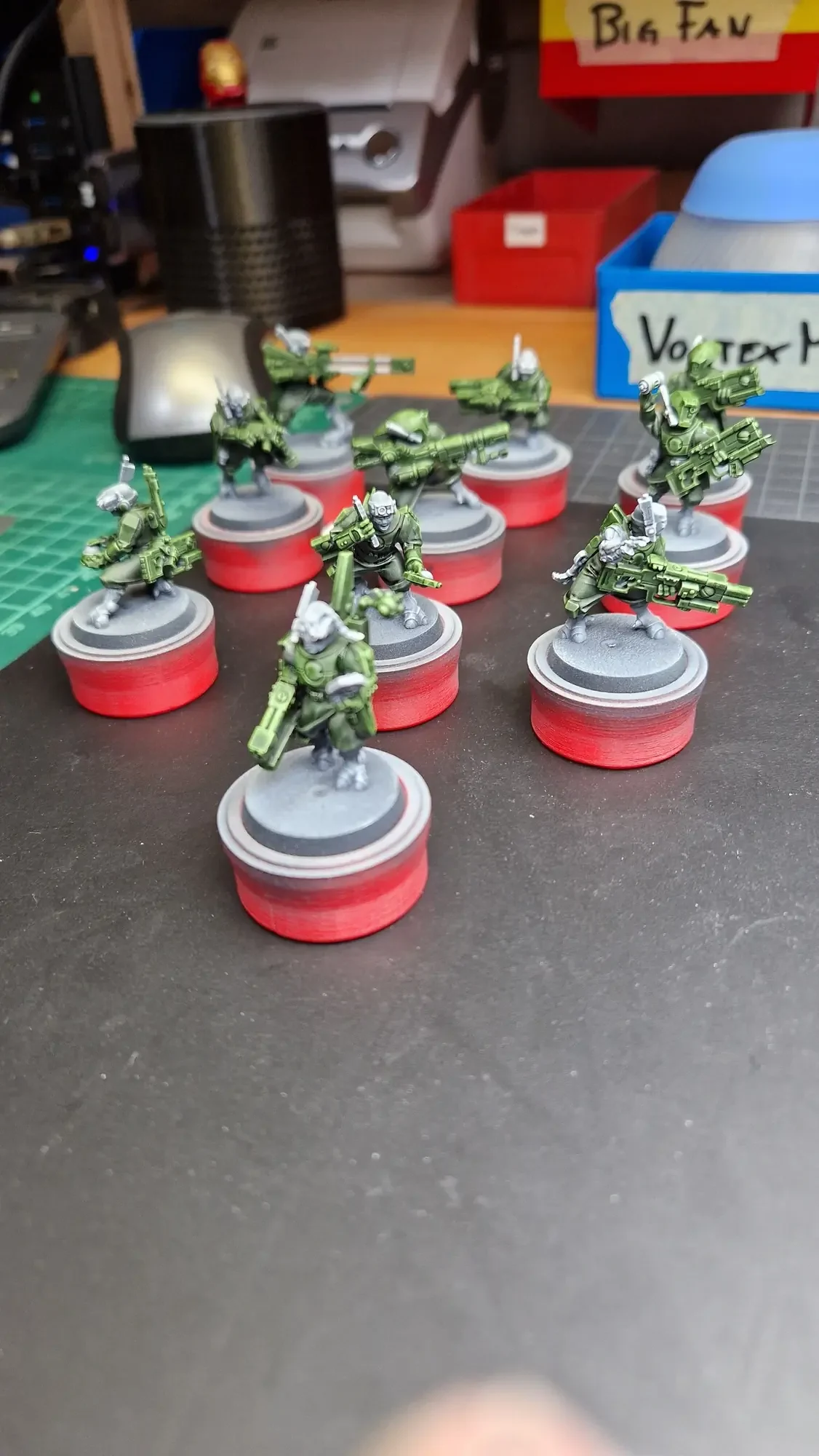 Zuerst Bilder des Build-Prozesses. Da die T’au fliegende Drohnen haben, müssen auch die durchsichtigen Stands magnetisiert werden. Und schon wieder habe ich den Tamiya Leim umgestossen … eine Flasche für 2 Kill Teams… 😒 Also habe ich einen Ständer designed und gedruckt. Praktischerweise passt auch der Tamiya Panel-Liner perfekt in den Halter.