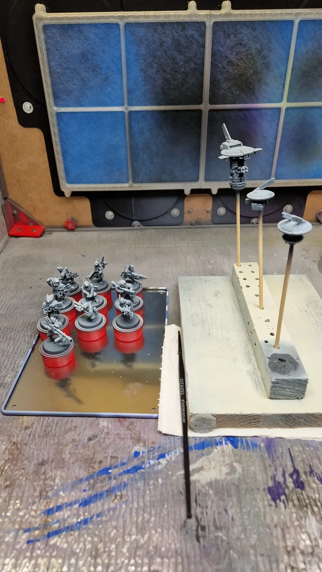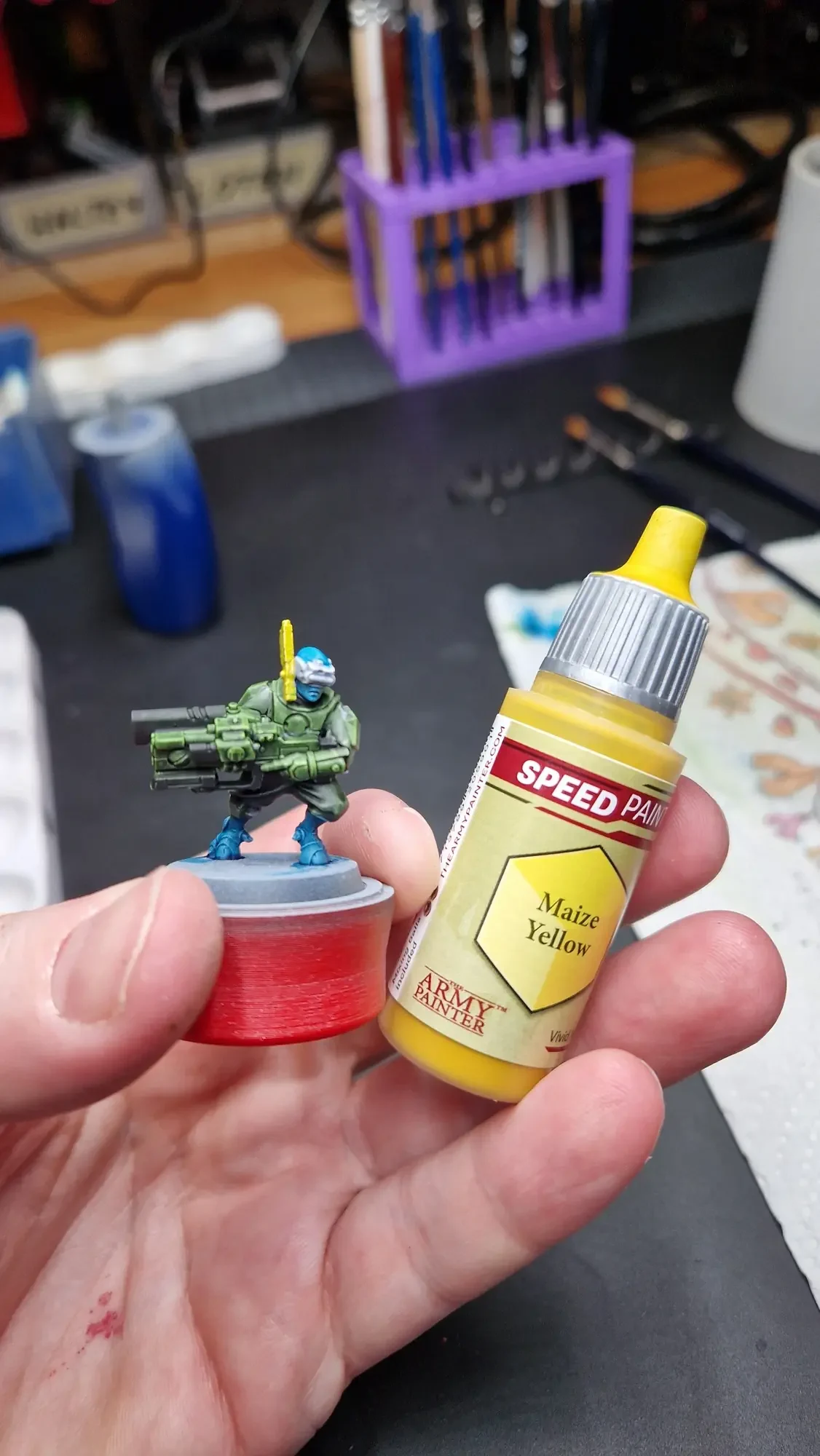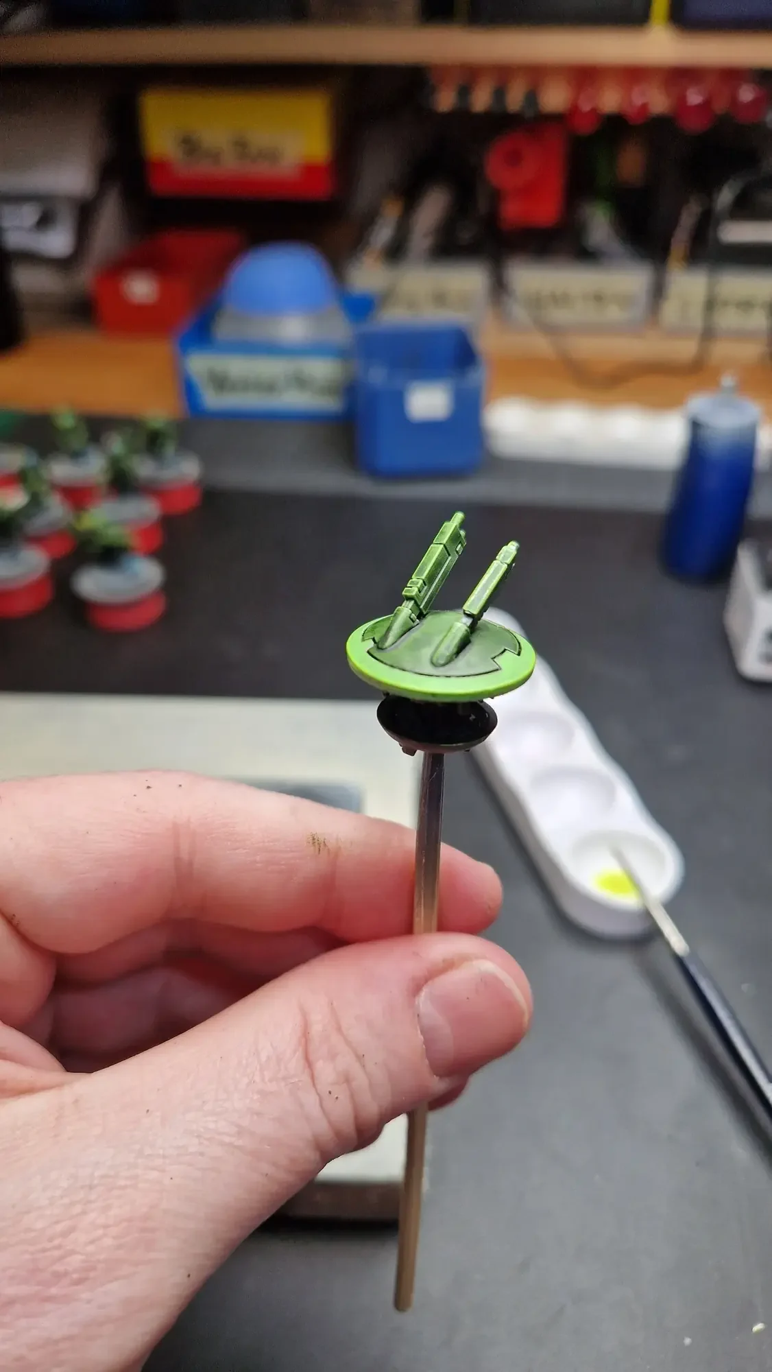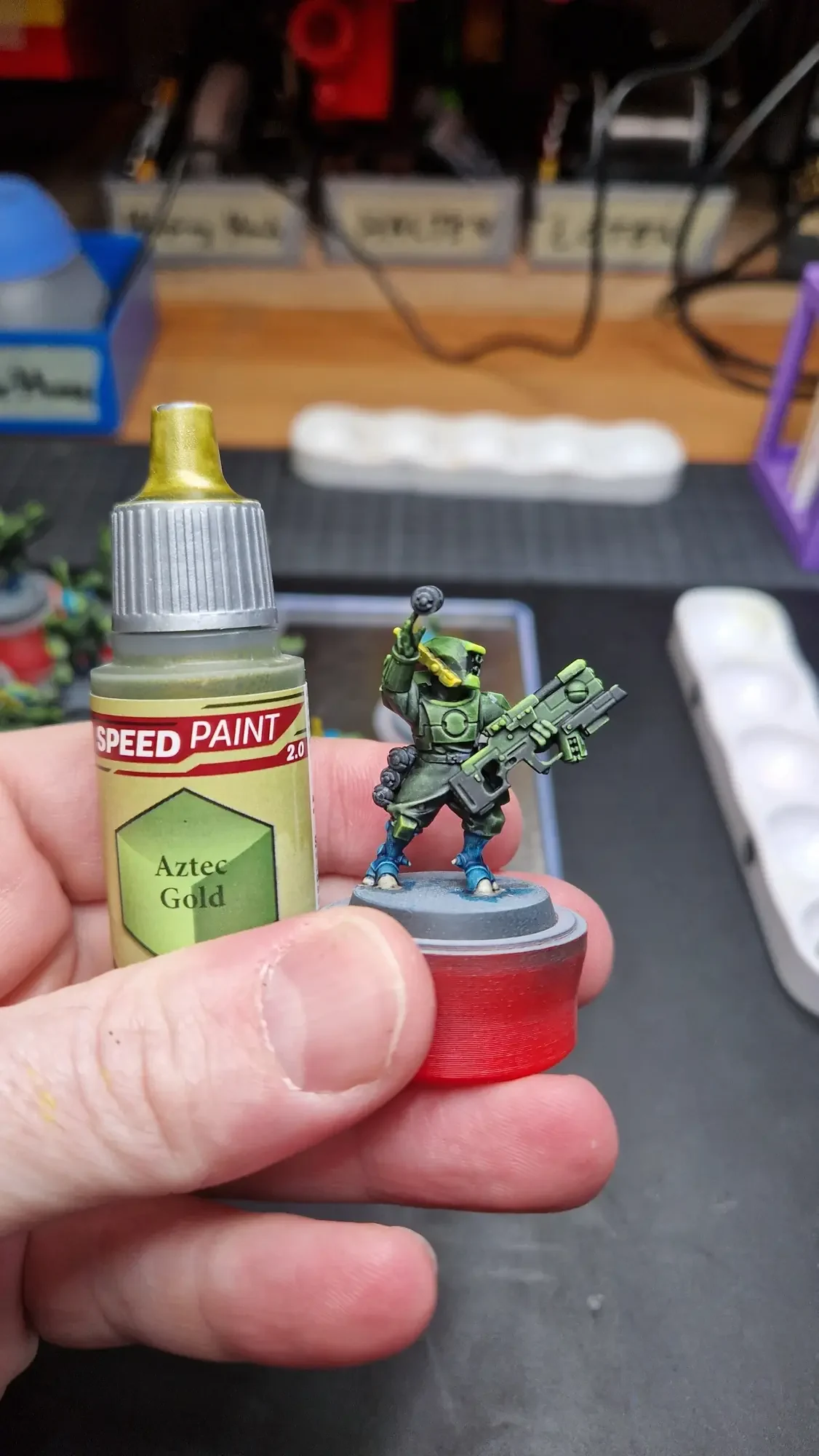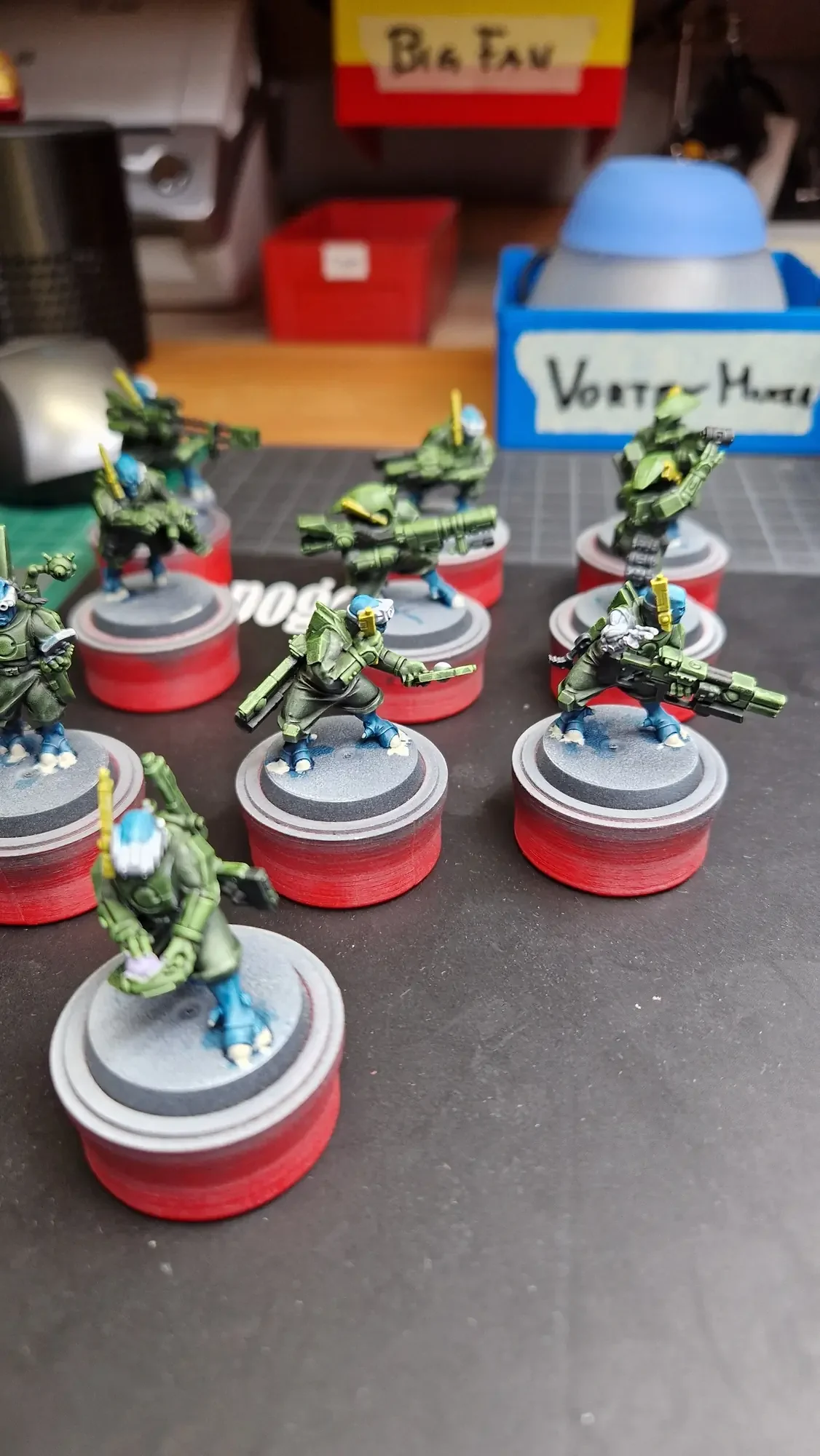 Zuerst Bilder des Build-Prozesses. Da die T’au fliegende Drohnen haben, müssen auch die durchsichtigen Stands magnetisiert werden. Und schon wieder habe ich den Tamiya Leim umgestossen … eine Flasche für 2 Kill Teams… 😒 Also habe ich einen Ständer designed und gedruckt. Praktischerweise passt auch der Tamiya Panel-Liner perfekt in den Halter.