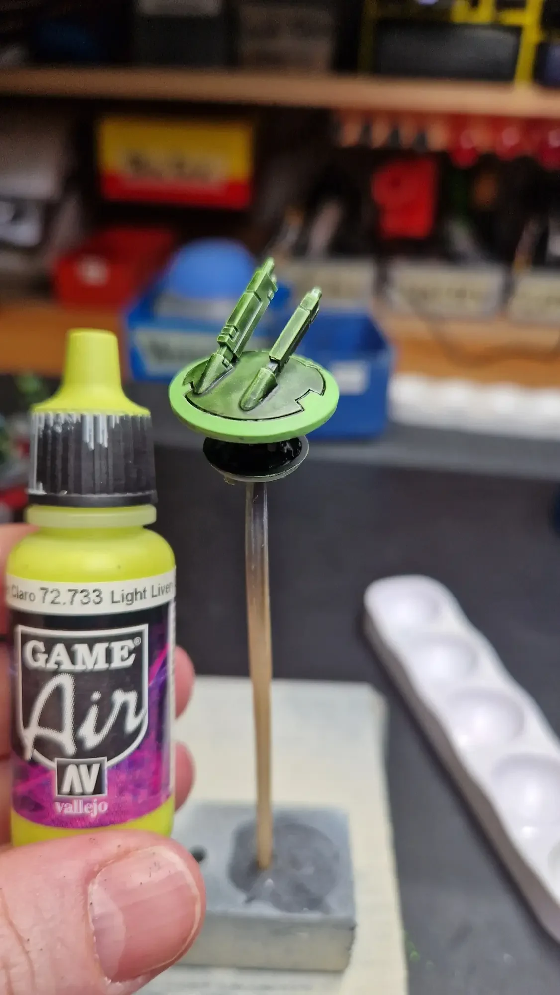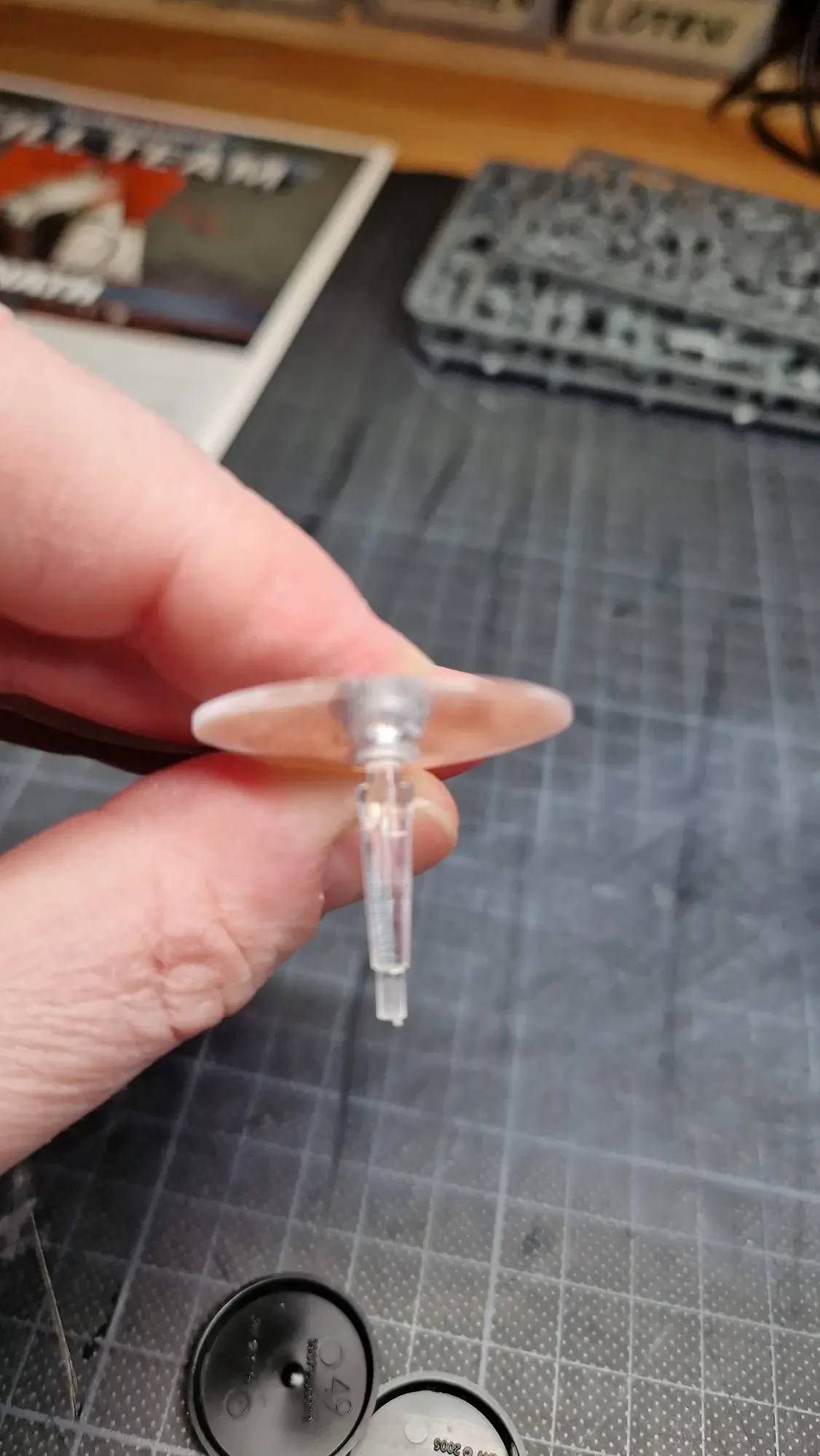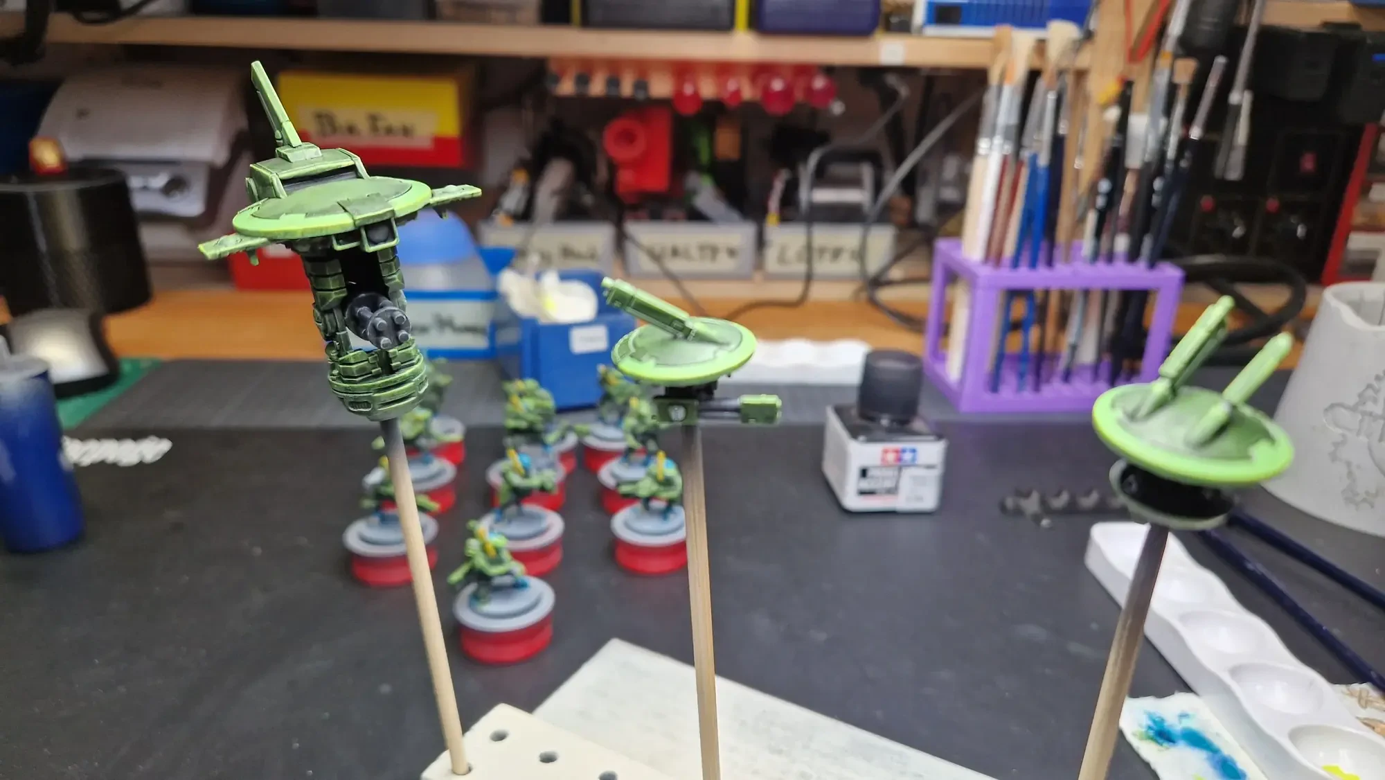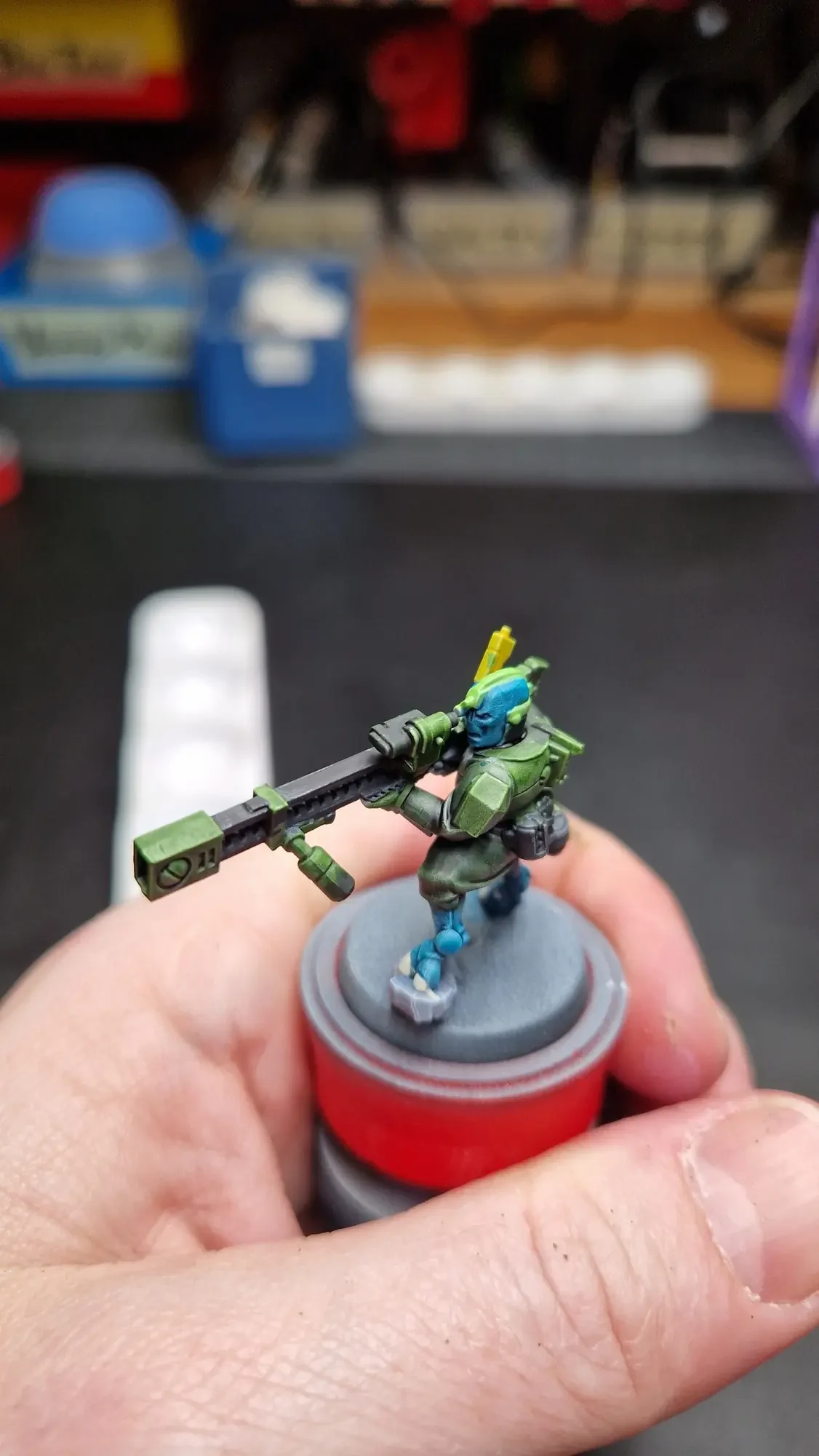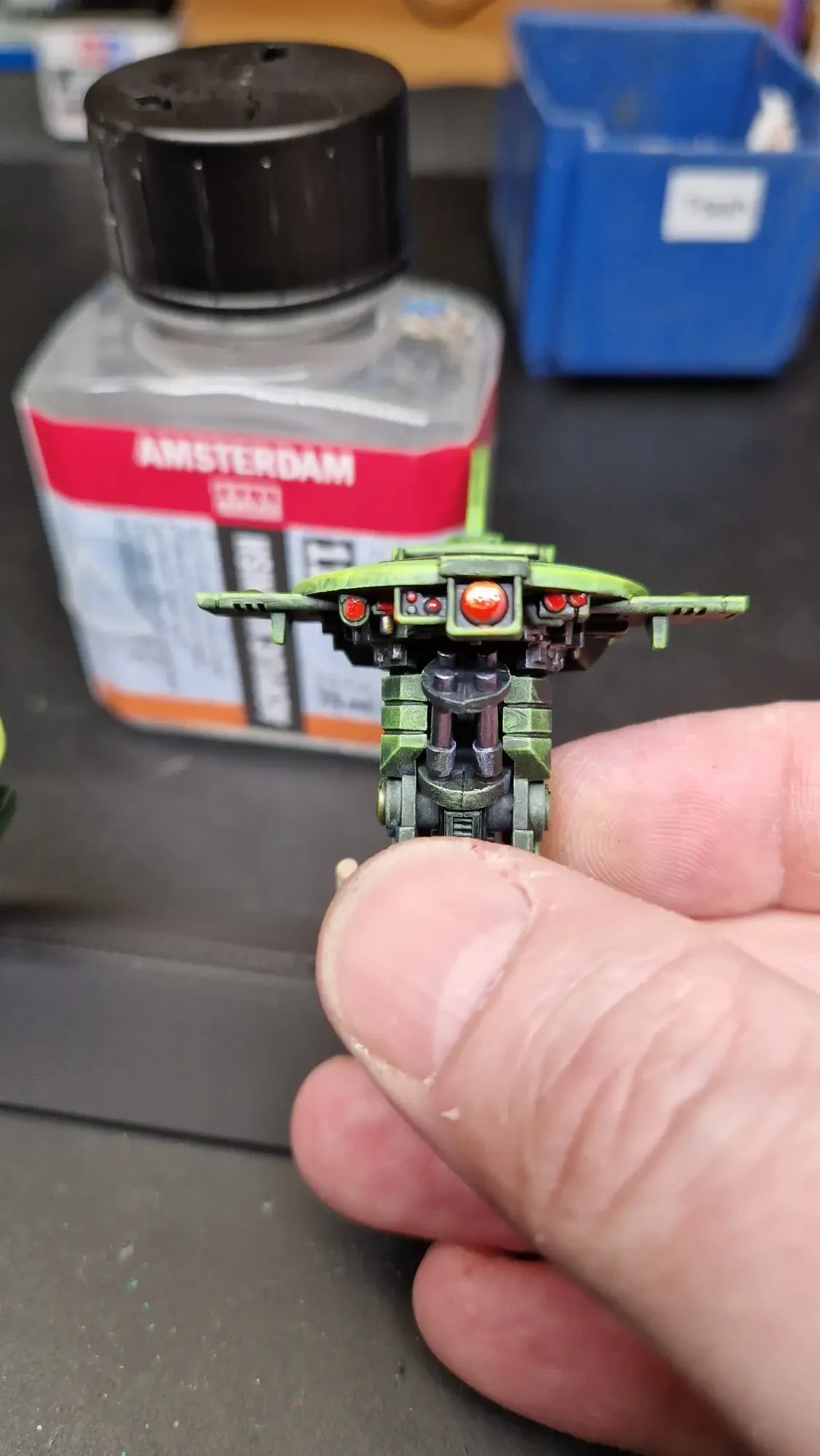 Zuerst Bilder des Build-Prozesses. Da die T’au fliegende Drohnen haben, müssen auch die durchsichtigen Stands magnetisiert werden. Und schon wieder habe ich den Tamiya Leim umgestossen … eine Flasche für 2 Kill Teams… 😒 Also habe ich einen Ständer designed und gedruckt. Praktischerweise passt auch der Tamiya Panel-Liner perfekt in den Halter.