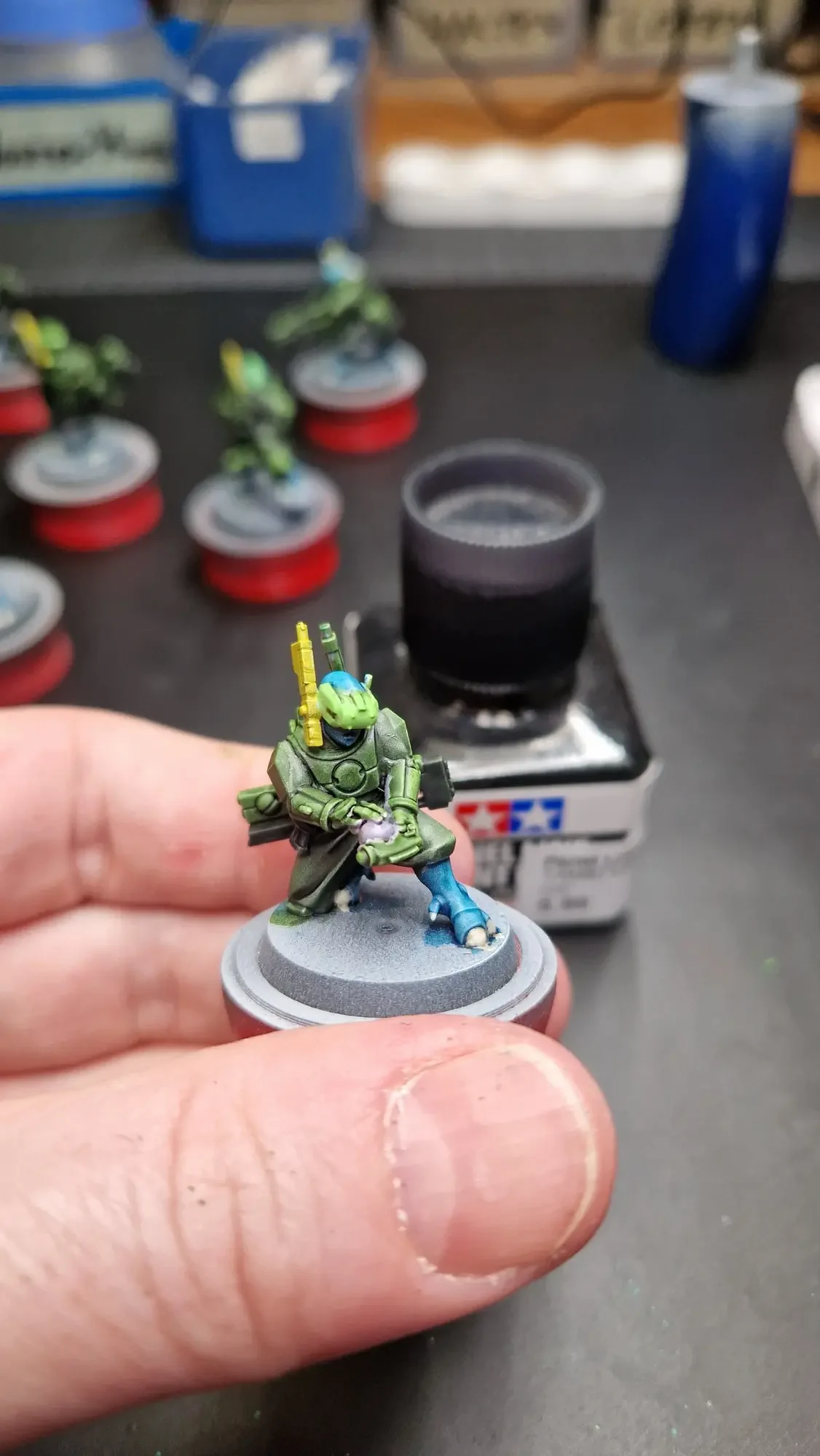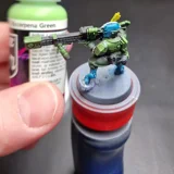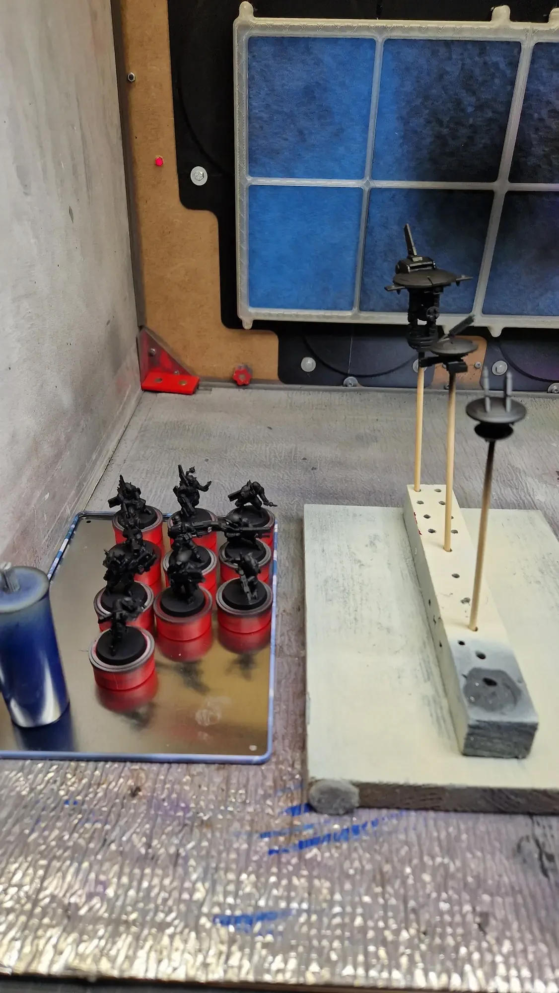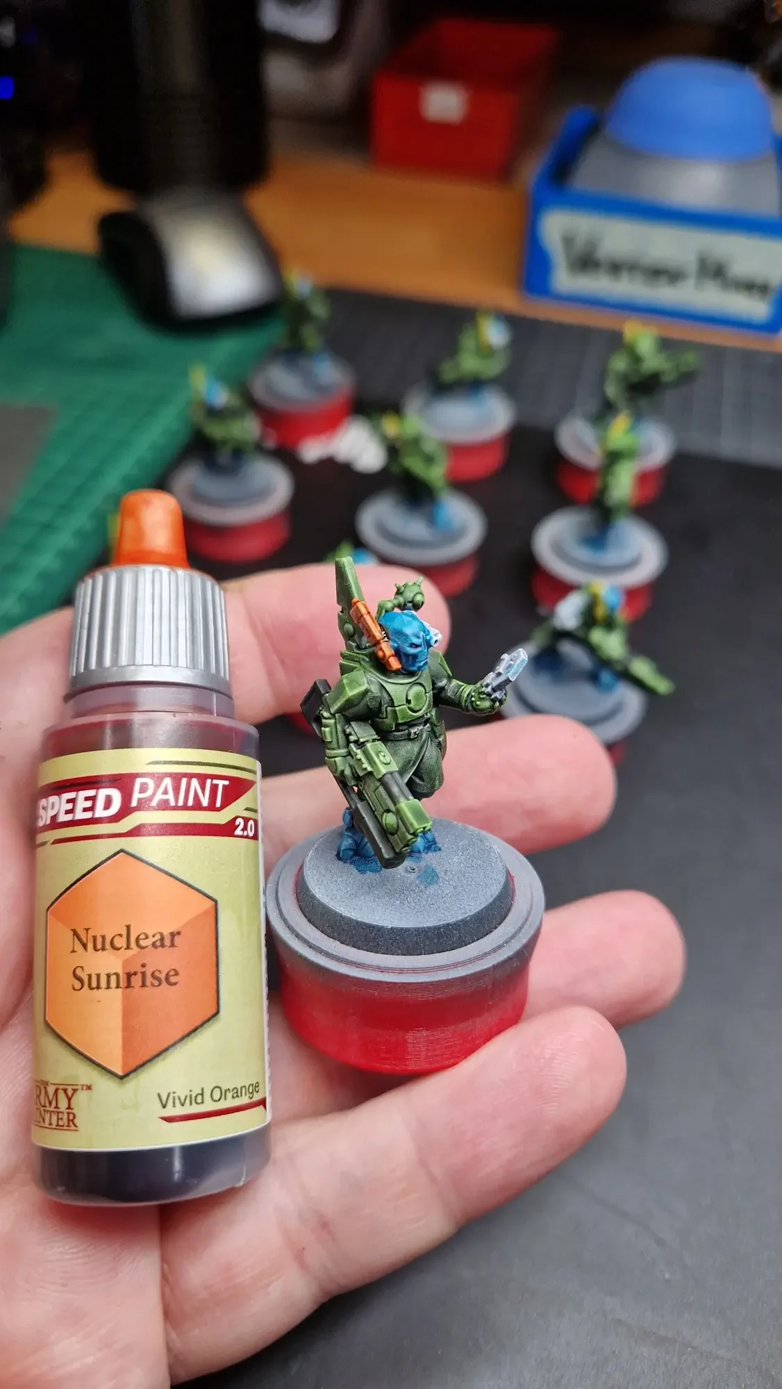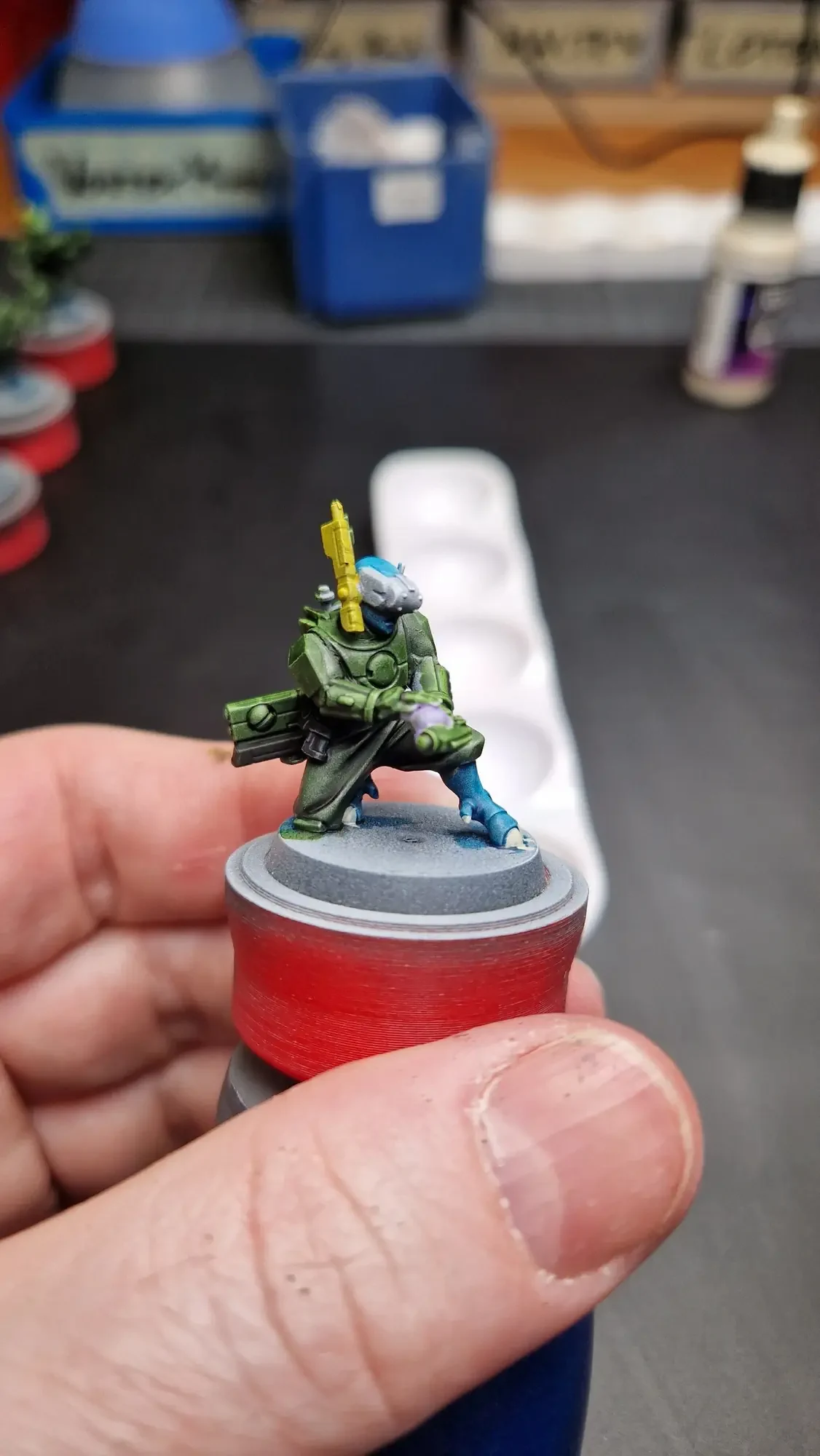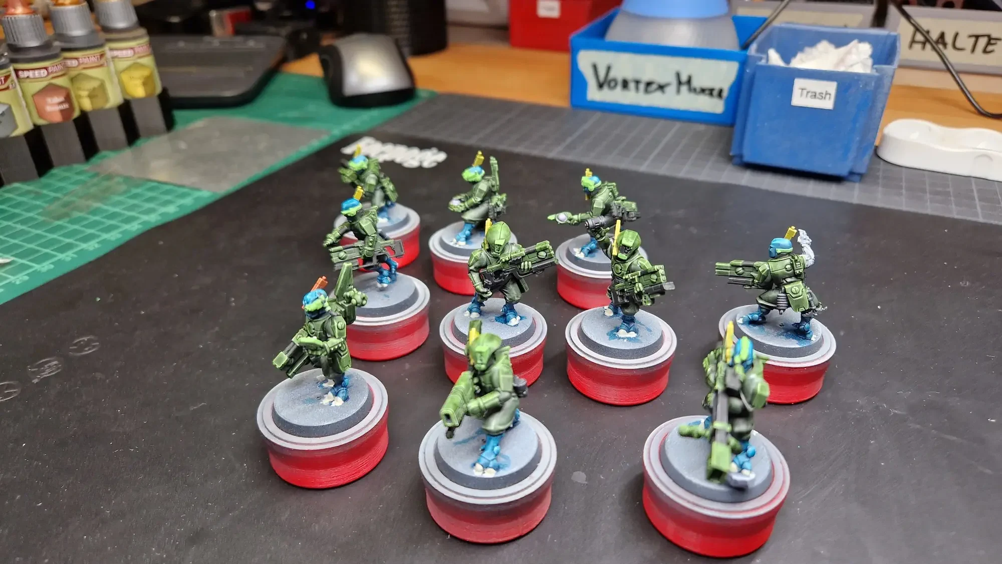Zuerst Bilder des Build-Prozesses. Da die T’au fliegende Drohnen haben, müssen auch die durchsichtigen Stands magnetisiert werden. Und schon wieder habe ich den Tamiya Leim umgestossen … eine Flasche für 2 Kill Teams… 😒 Also habe ich einen Ständer designed und gedruckt. Praktischerweise passt auch der Tamiya Panel-Liner perfekt in den Halter.