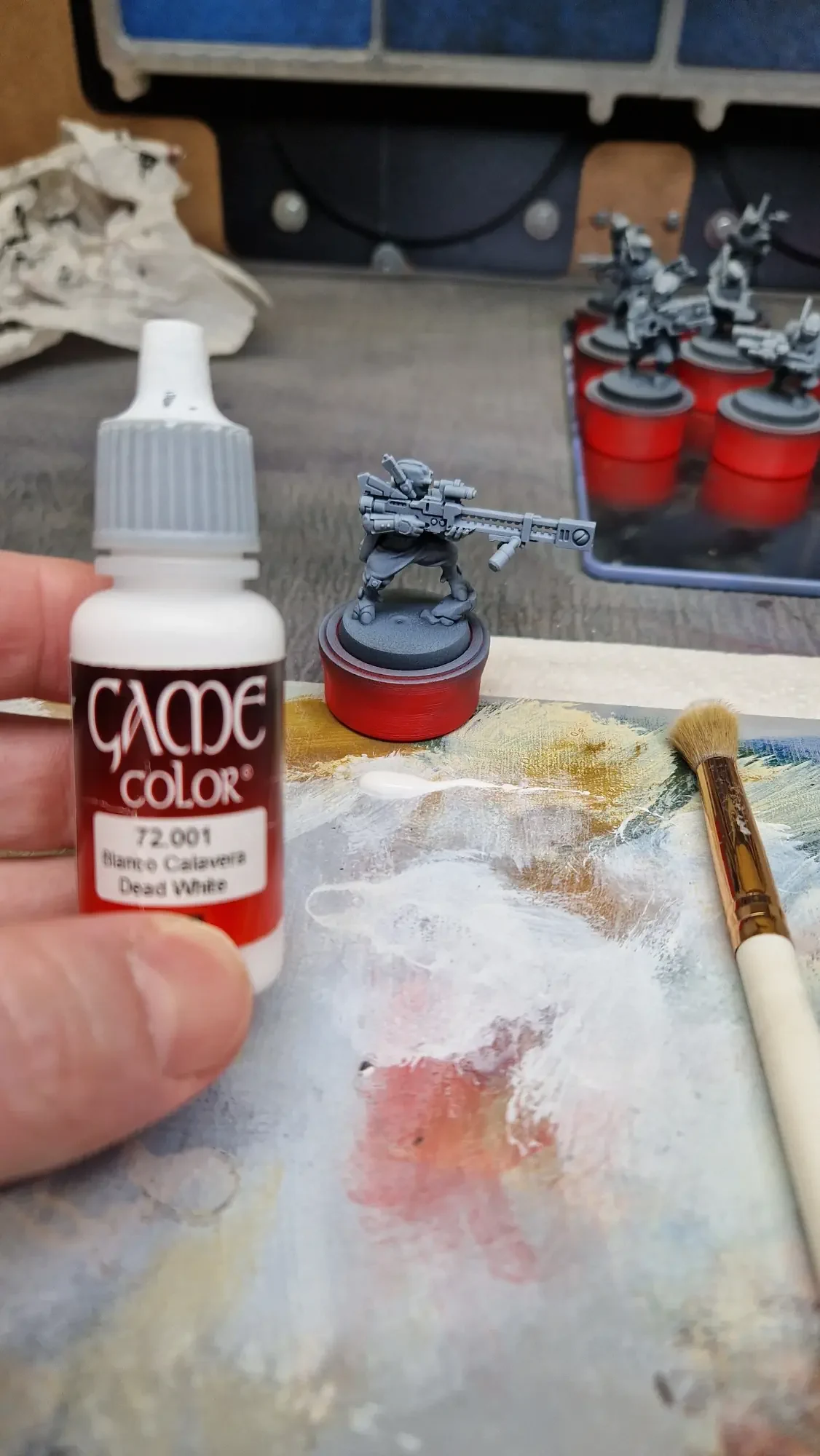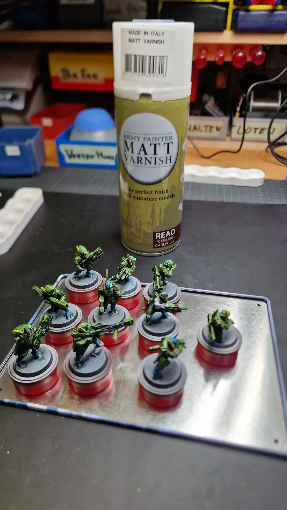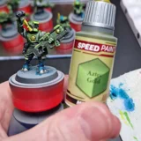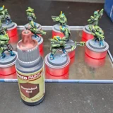Danach wurden die Minis in schwarz grundiert, mit grau Zenithal gehighlightet und anschliessend mit weiss drybrushed. Diesmal habe ich darauf geachtet, dass der graue Zenithal weniger stark ist, damit der Drybrush die Details und Kanten besser hervorhebt. Anschliessend habe ich alle minis mit gloss versiegelt, damit die Speed Paints gut fliessen können.