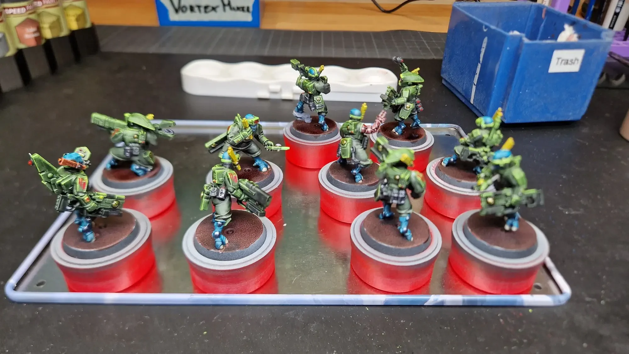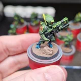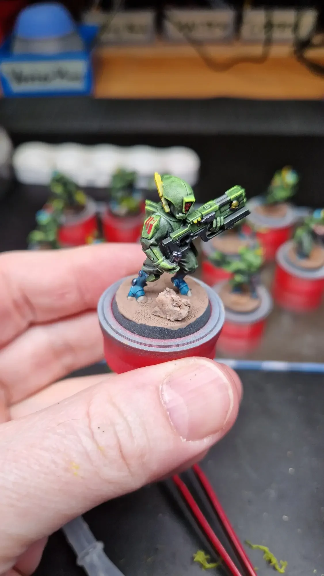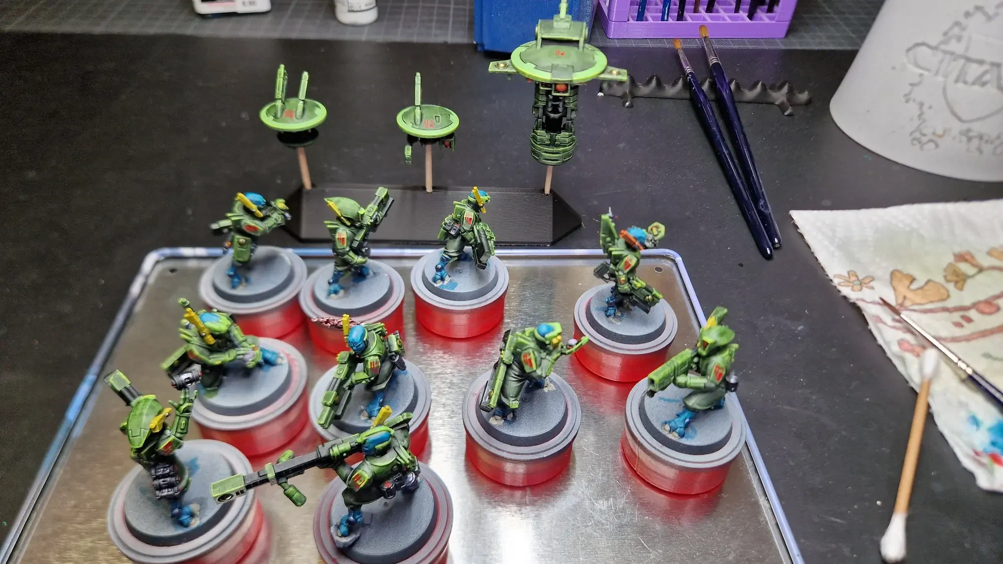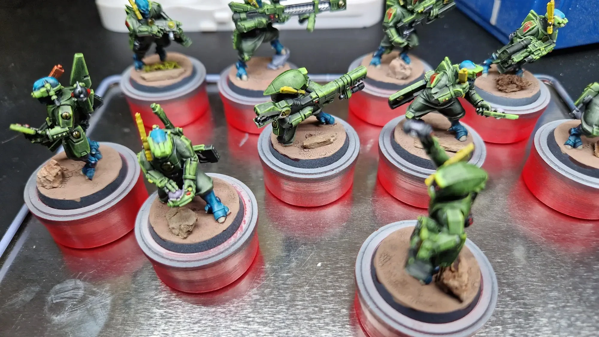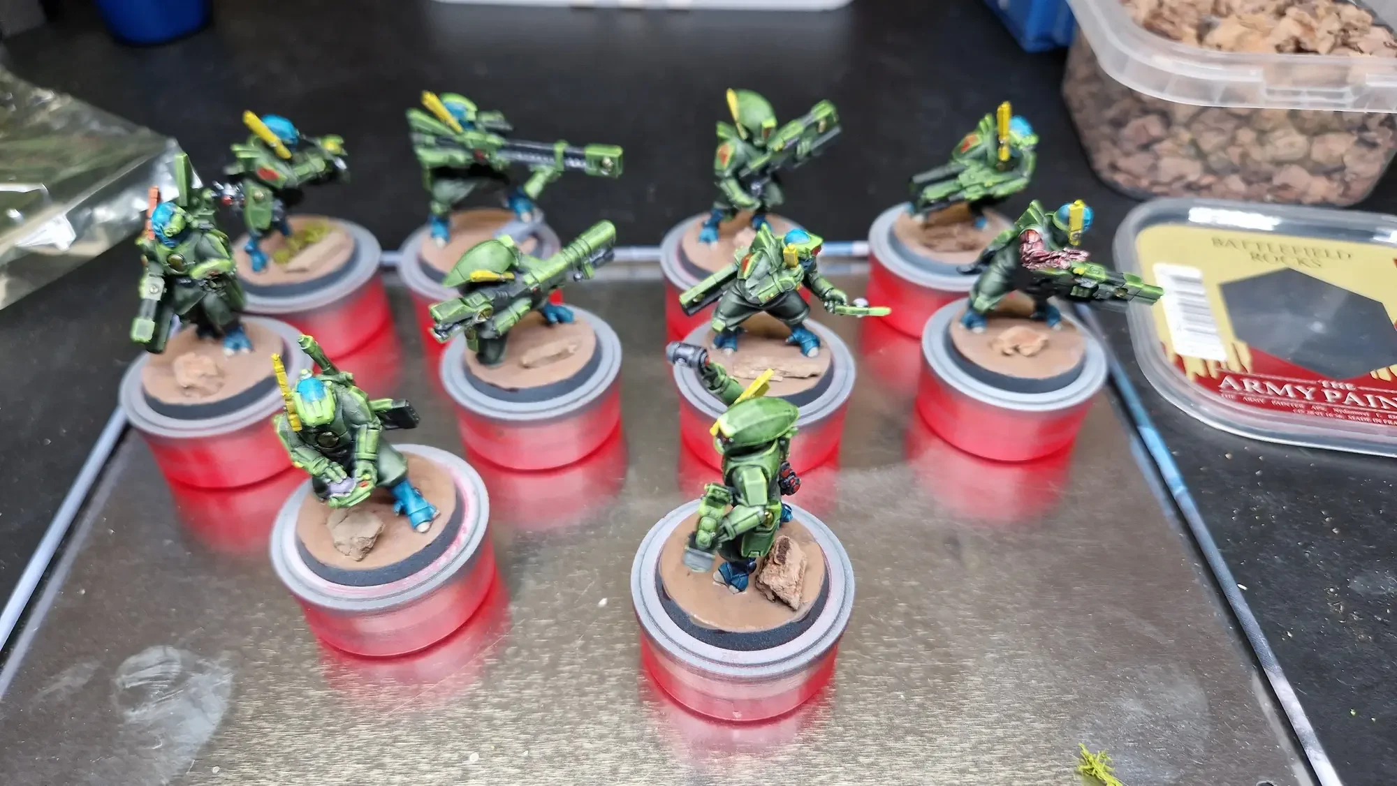 Das Farbschema ist entstanden, weil ich einmal Dschungel-Bases ausprobieren wollte. Und da die T’au die einzige Armee im Warhammer Universum ist, die sich um Tarnung kümmert, sind die Rüstungen in Grüntönen gehalten. Wie immer wurde ganz am Schluss noch der Rand der Bases schwarz bemalt.