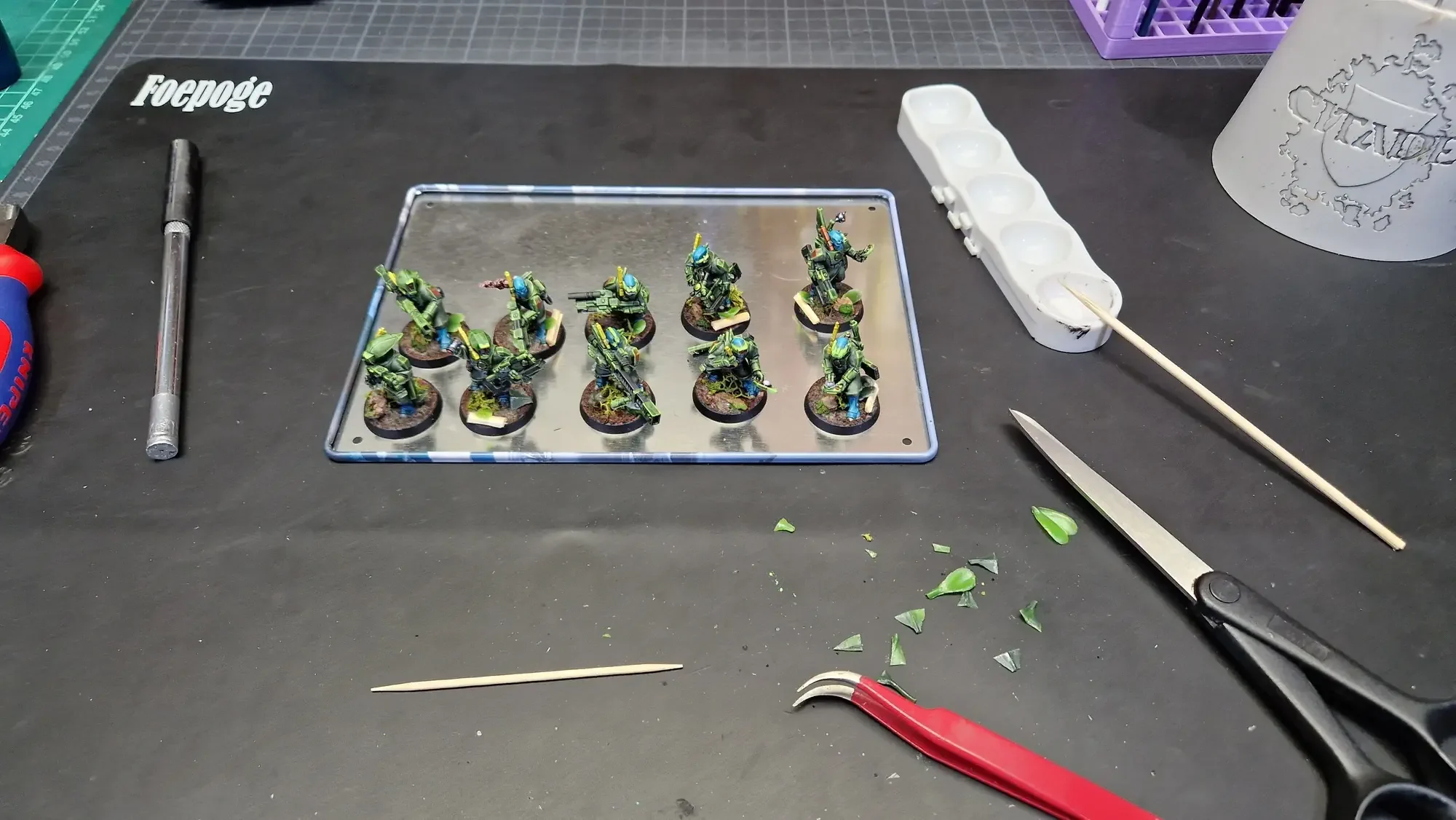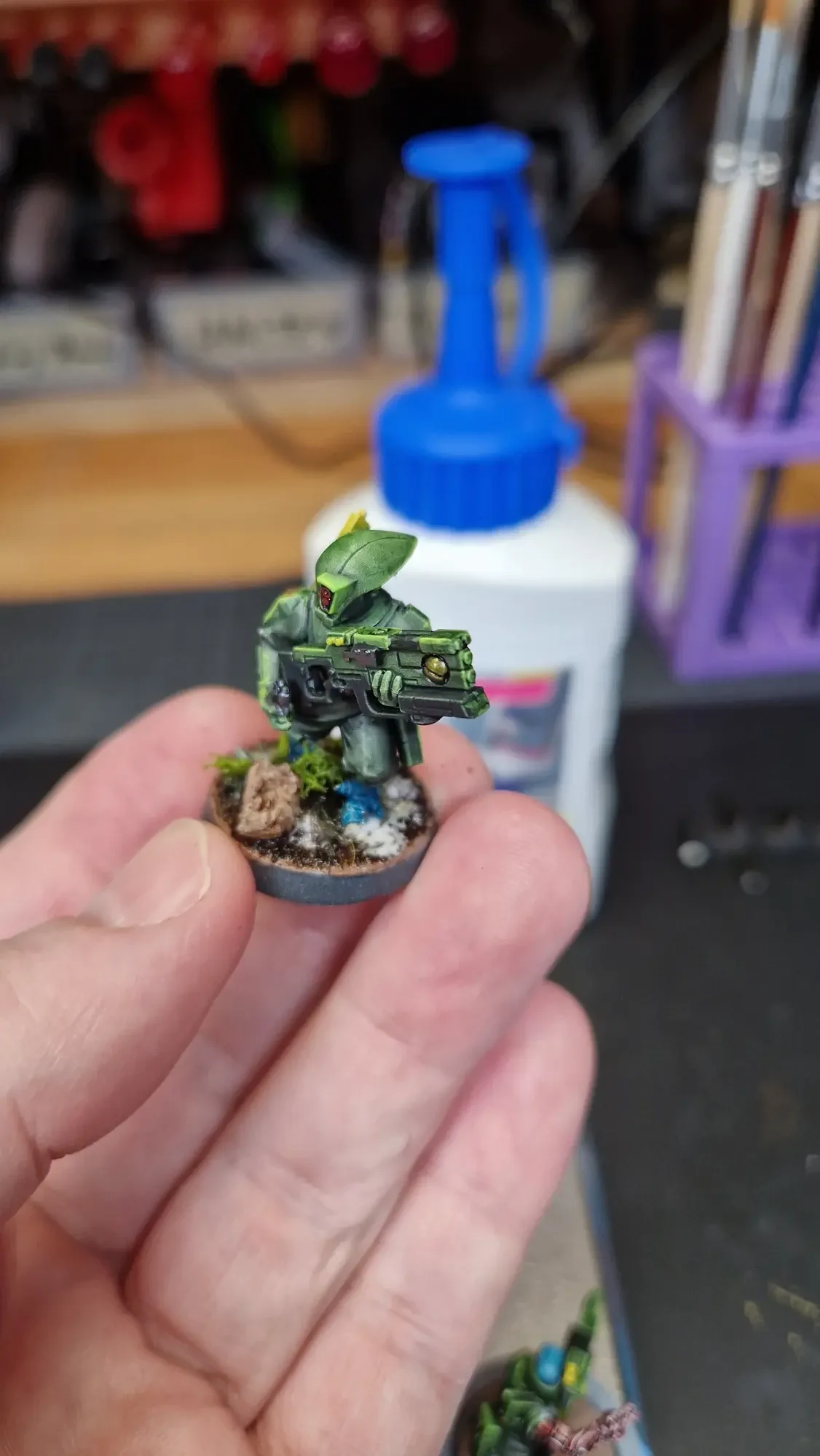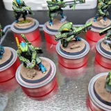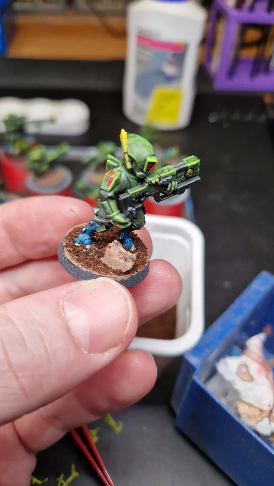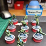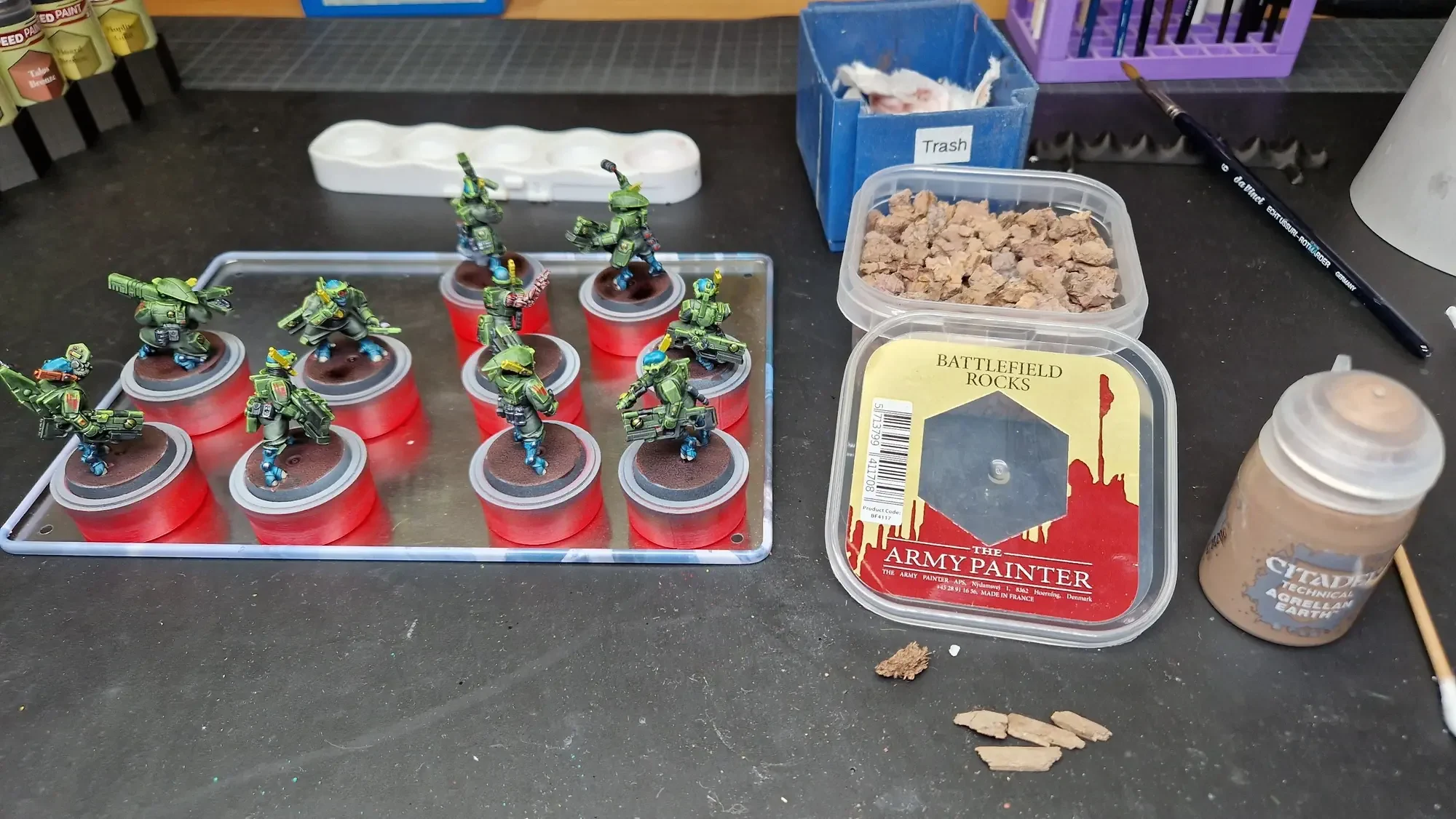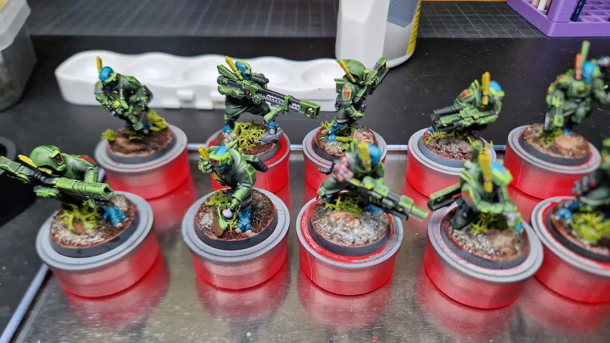 Das Farbschema ist entstanden, weil ich einmal Dschungel-Bases ausprobieren wollte. Und da die T’au die einzige Armee im Warhammer Universum ist, die sich um Tarnung kümmert, sind die Rüstungen in Grüntönen gehalten. Wie immer wurde ganz am Schluss noch der Rand der Bases schwarz bemalt.