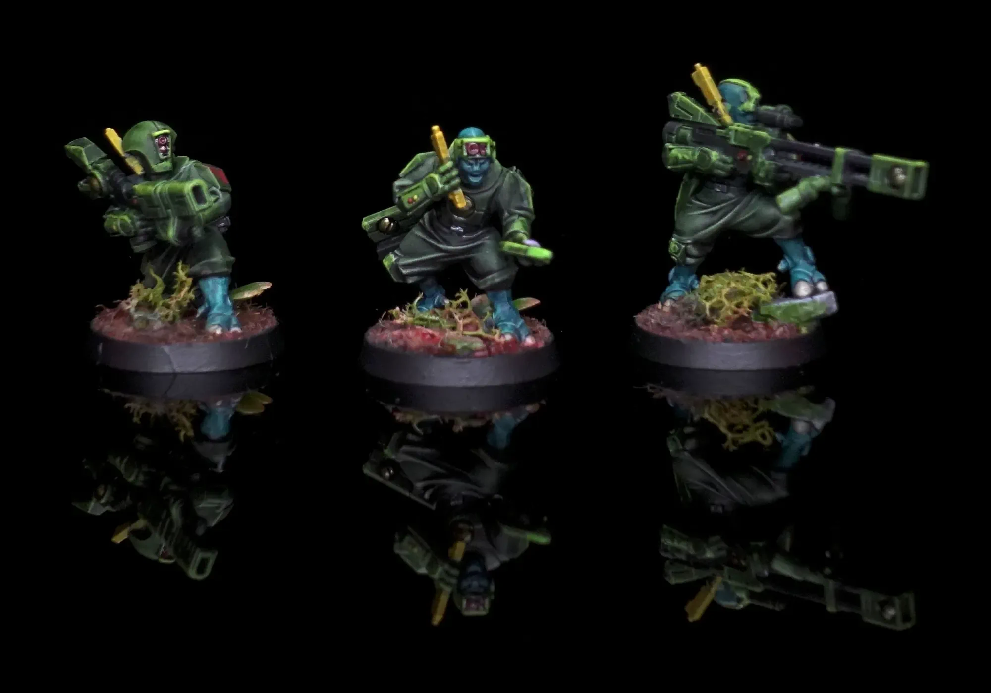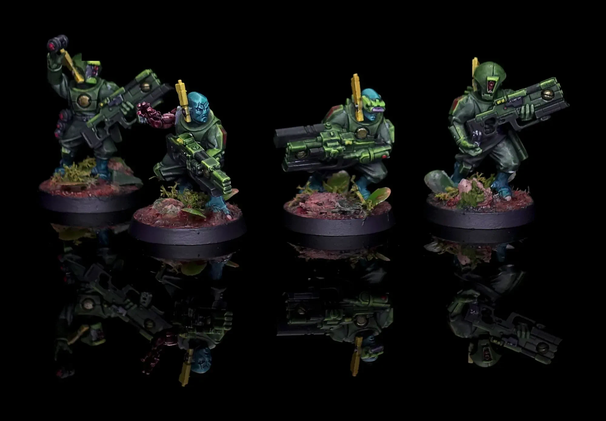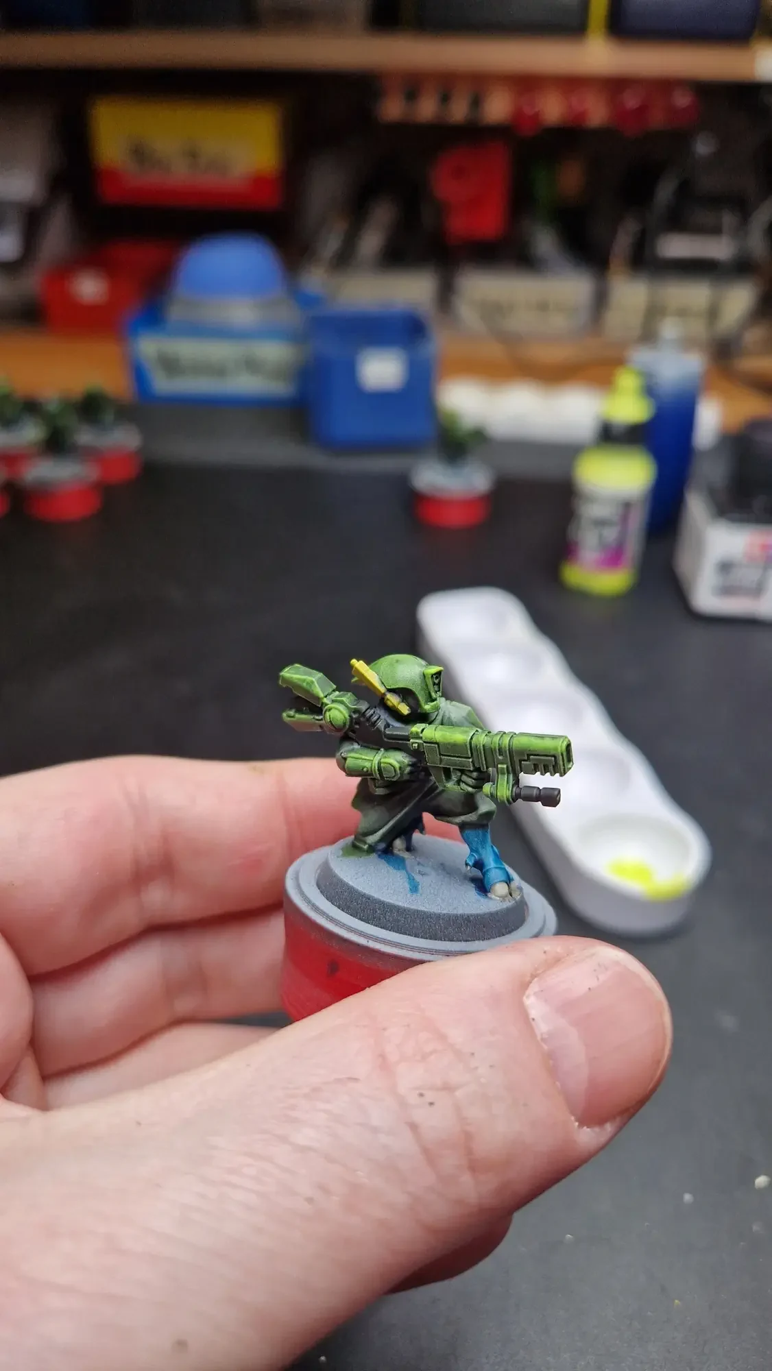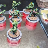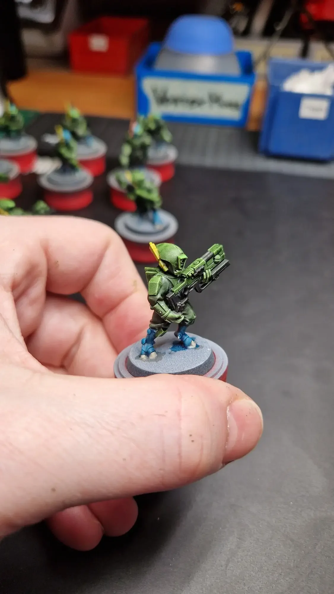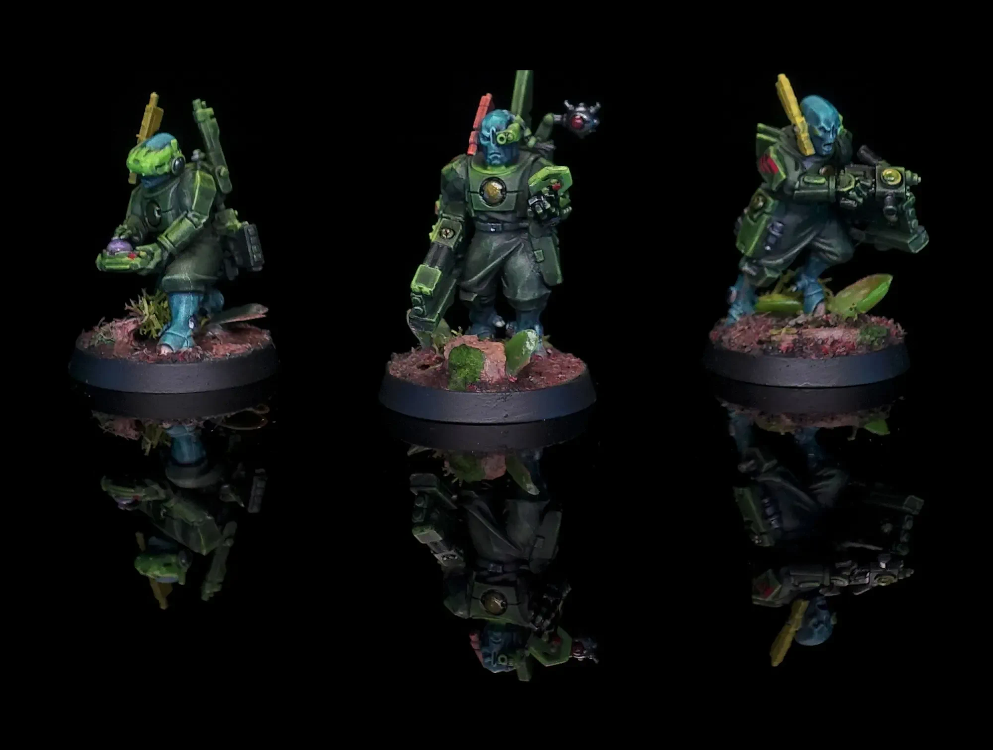 Das Farbschema ist entstanden, weil ich einmal Dschungel-Bases ausprobieren wollte. Und da die T’au die einzige Armee im Warhammer Universum ist, die sich um Tarnung kümmert, sind die Rüstungen in Grüntönen gehalten. Wie immer wurde ganz am Schluss noch der Rand der Bases schwarz bemalt.