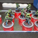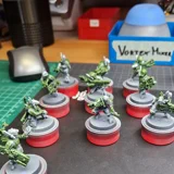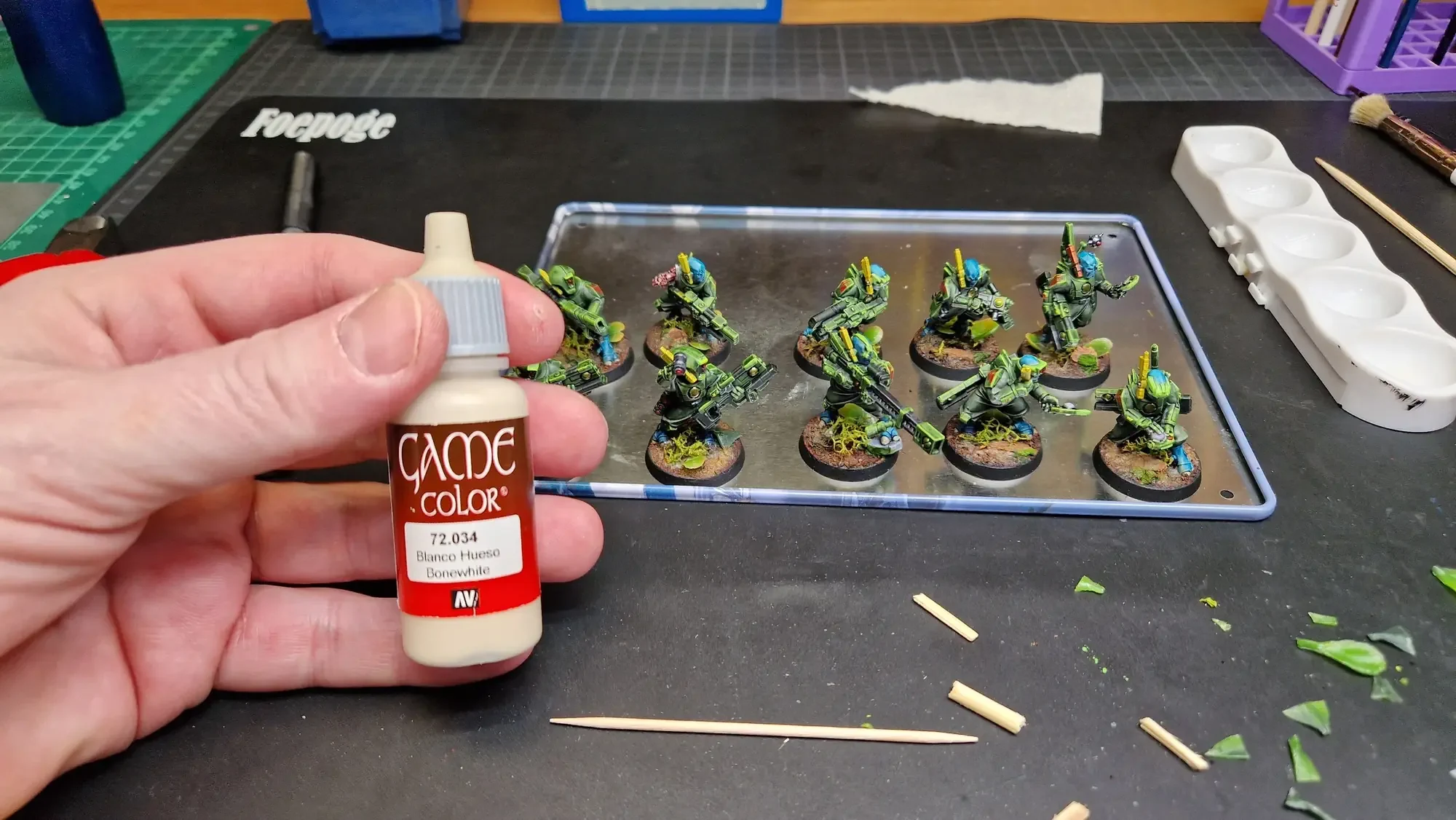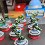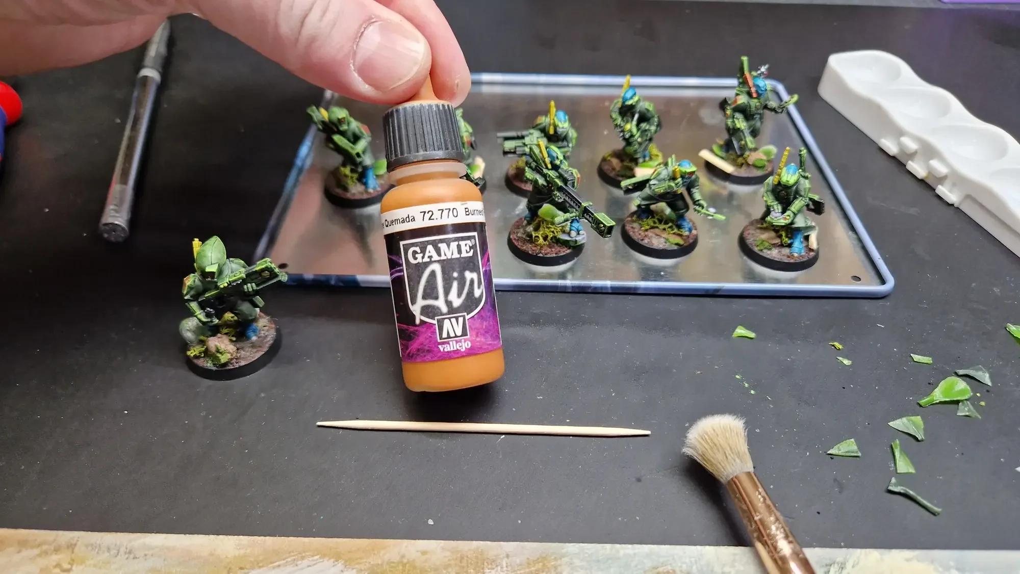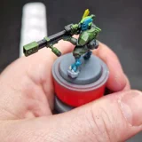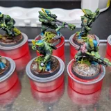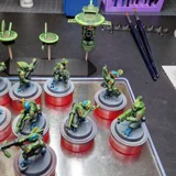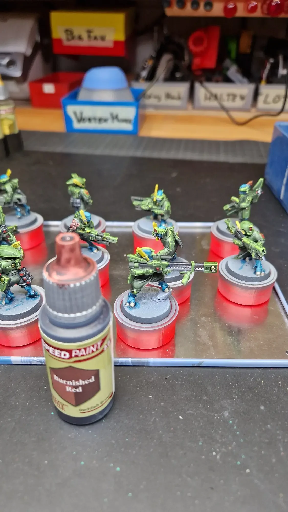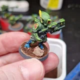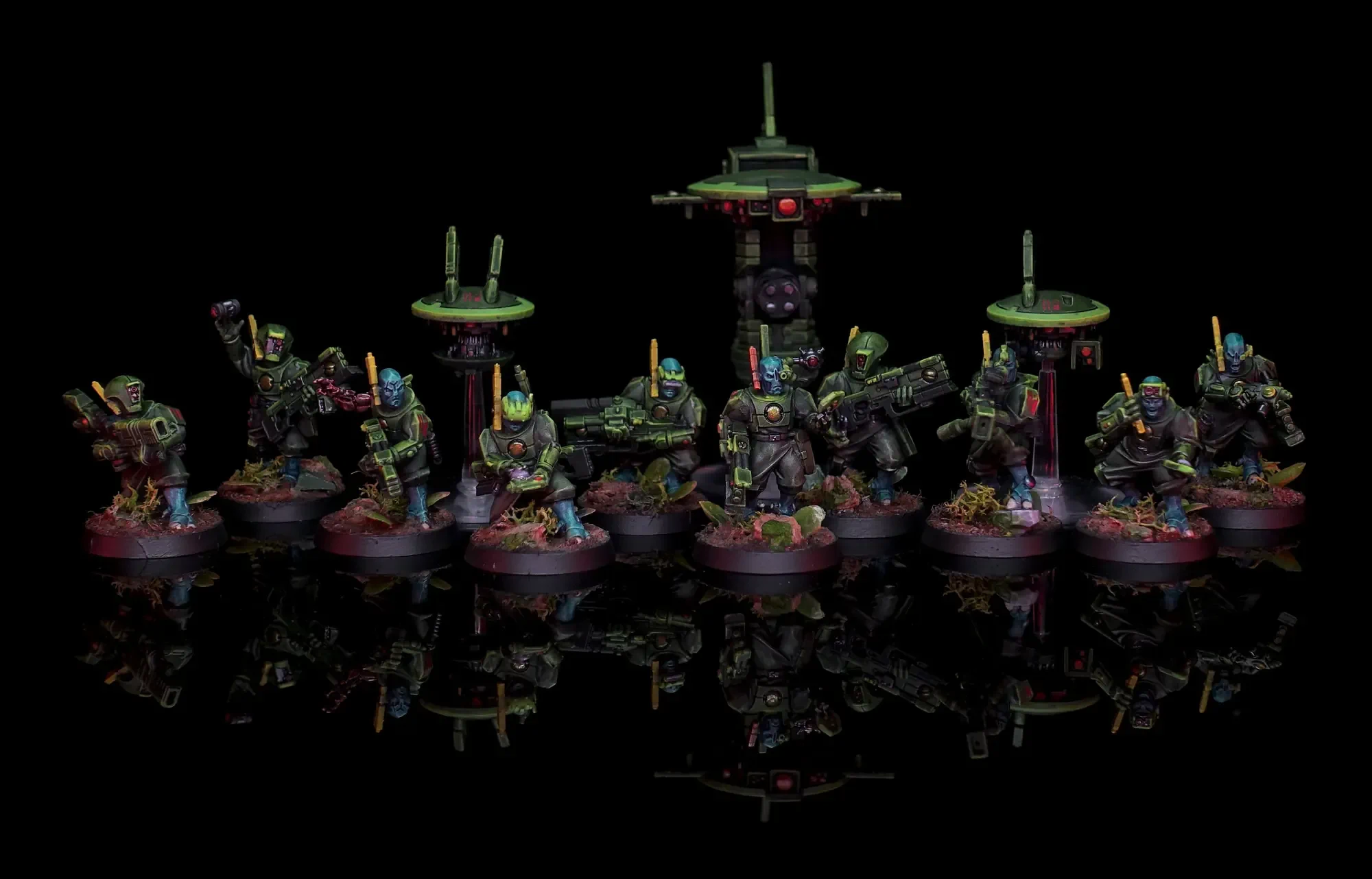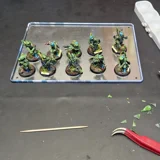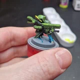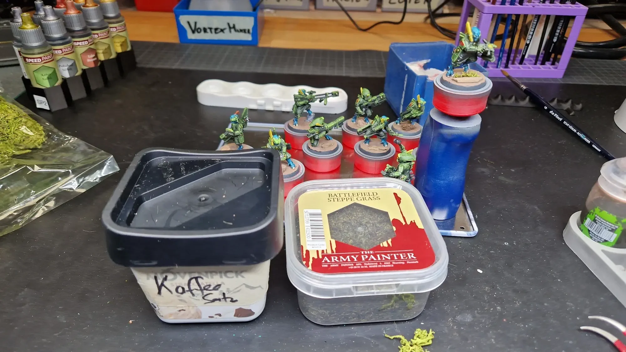 Das Farbschema ist entstanden, weil ich einmal Dschungel-Bases ausprobieren wollte. Und da die T’au die einzige Armee im Warhammer Universum ist, die sich um Tarnung kümmert, sind die Rüstungen in Grüntönen gehalten. Wie immer wurde ganz am Schluss noch der Rand der Bases schwarz bemalt.