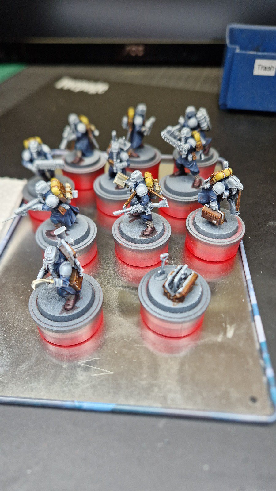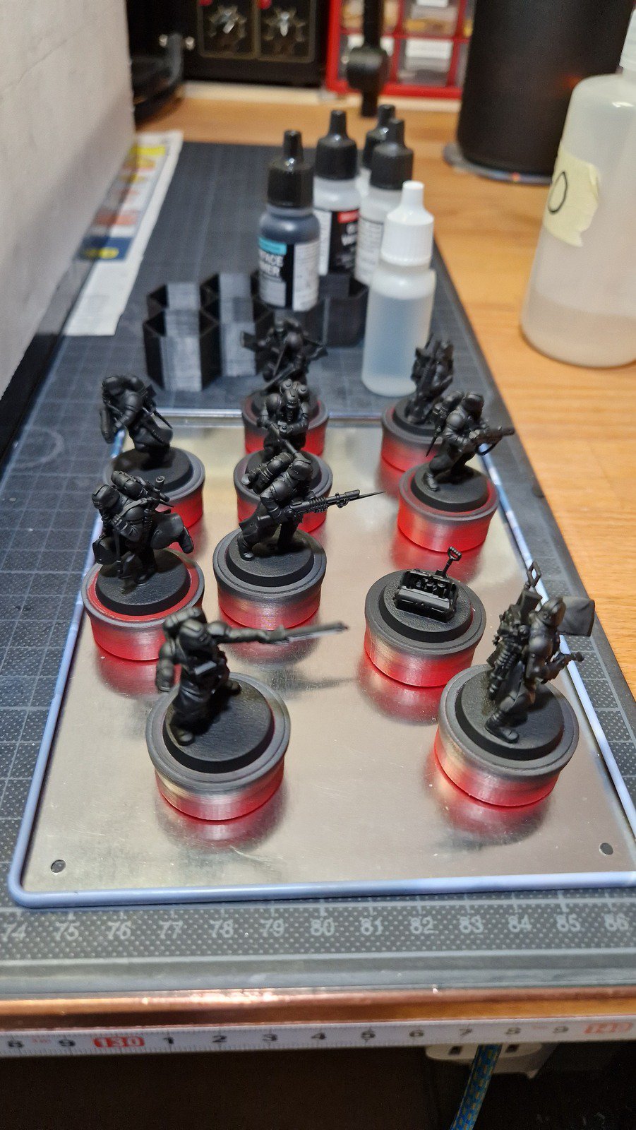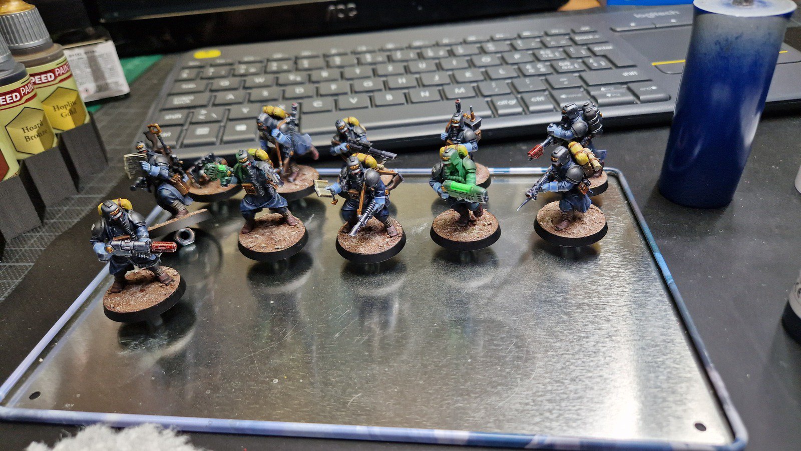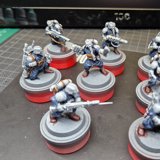 Die Bases habe ich zunächst mit Armageddon Dust (Technical) von Citadel bemalt und die wenigen Decals angebracht, welche anschliessend matt versiegelt wurden. Um die Bases schlammiger zu machen, habe ich noch diverse weitere Farben aufgebracht. Das Leuchten der Plasma-Waffen ist wirklich gut geworden und OSL mit der Airbrush zu simulieren ist einfach super! Wie immer wurde ganz am Schluss noch der Rand der Bases schwarz bemalt. Dies ist nun das zehnte Kill Team … sechs weitere warten noch im Pile of shame…