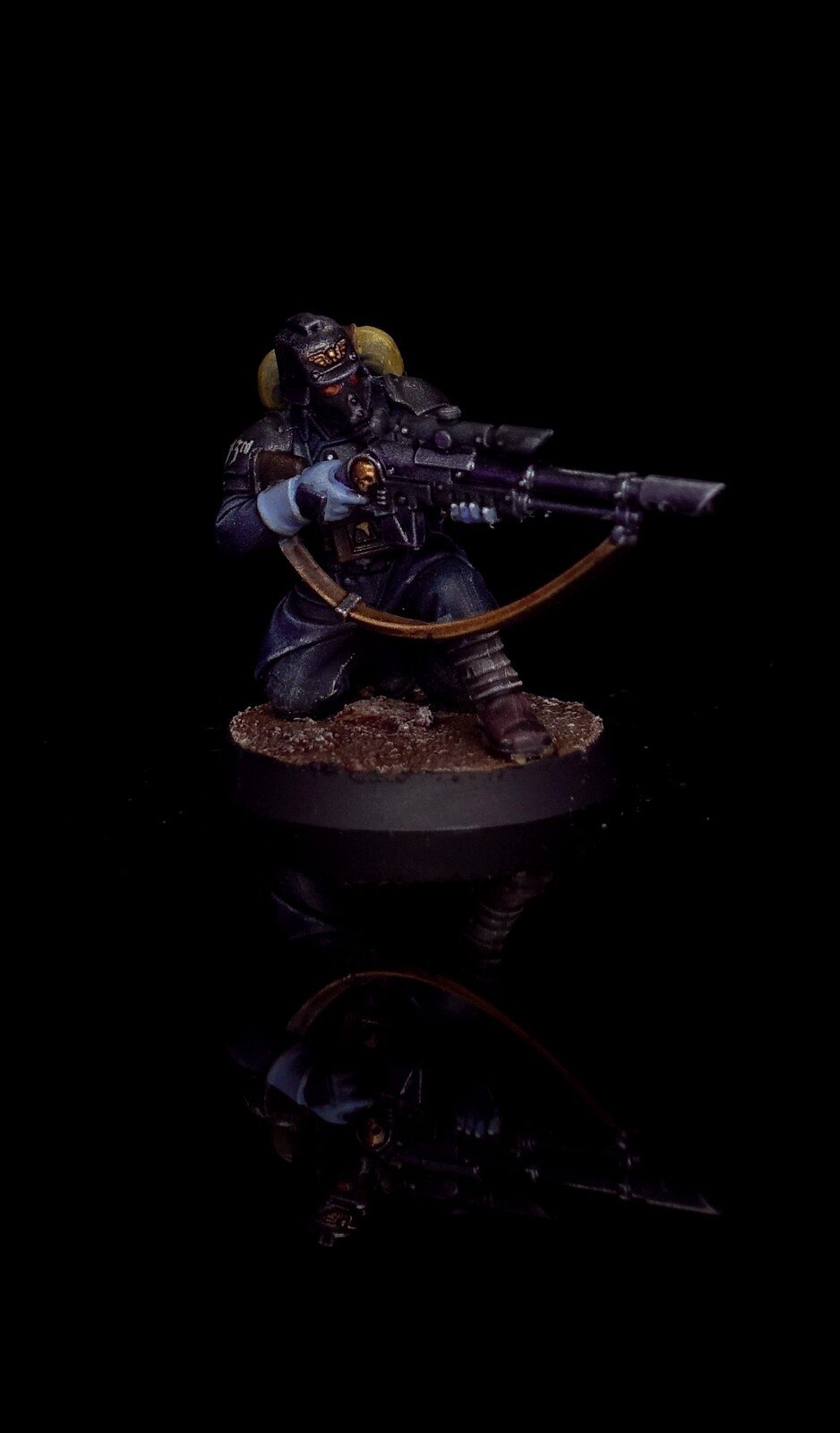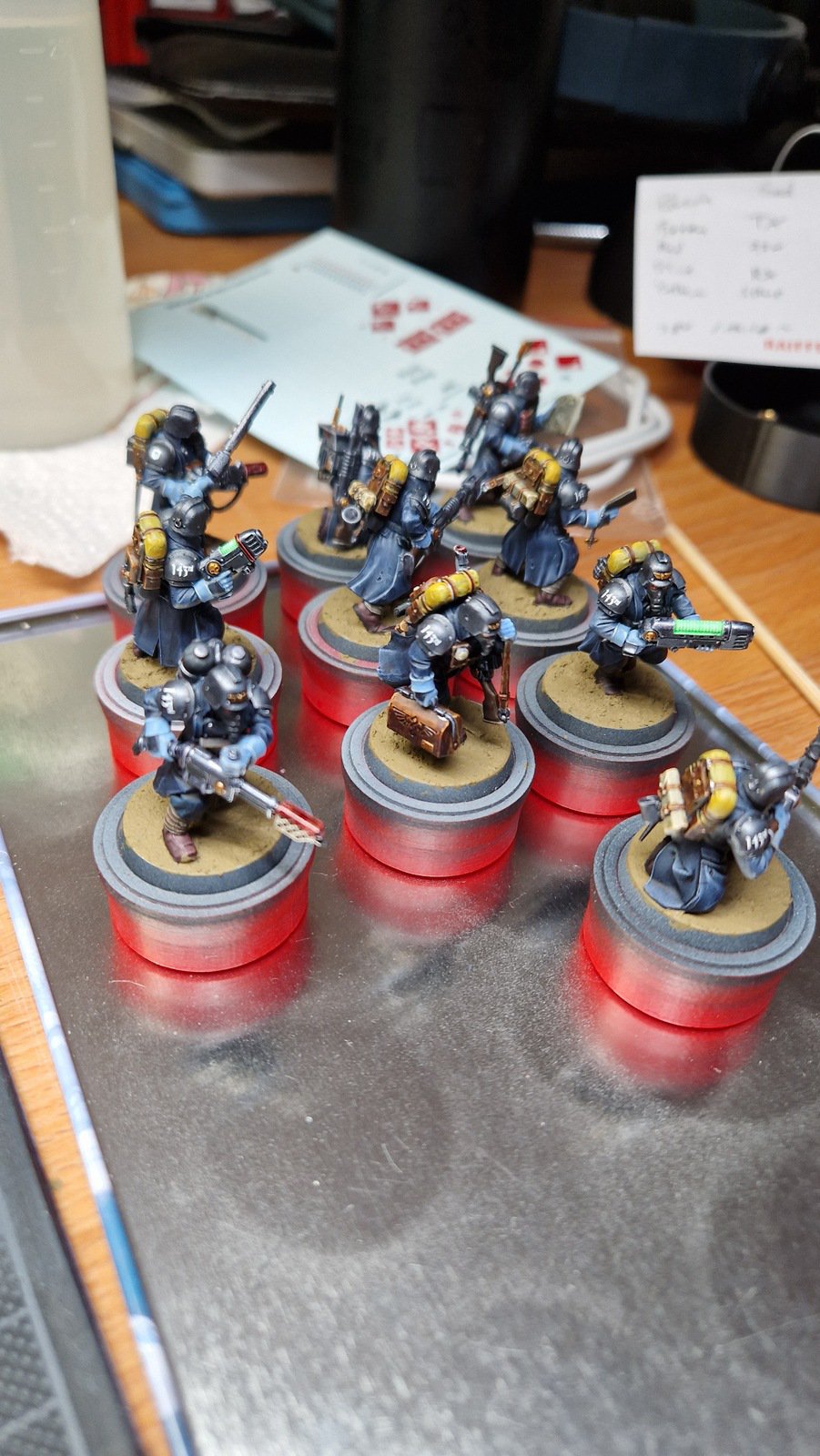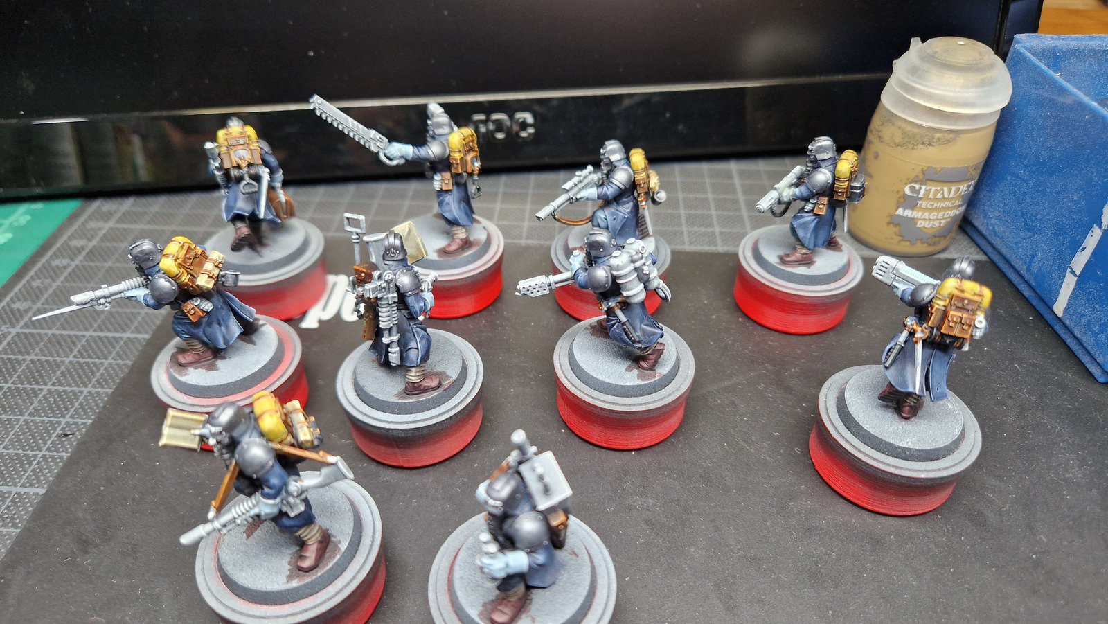 Die Bases habe ich zunächst mit Armageddon Dust (Technical) von Citadel bemalt und die wenigen Decals angebracht, welche anschliessend matt versiegelt wurden. Um die Bases schlammiger zu machen, habe ich noch diverse weitere Farben aufgebracht. Das Leuchten der Plasma-Waffen ist wirklich gut geworden und OSL mit der Airbrush zu simulieren ist einfach super! Wie immer wurde ganz am Schluss noch der Rand der Bases schwarz bemalt. Dies ist nun das zehnte Kill Team … sechs weitere warten noch im Pile of shame…
