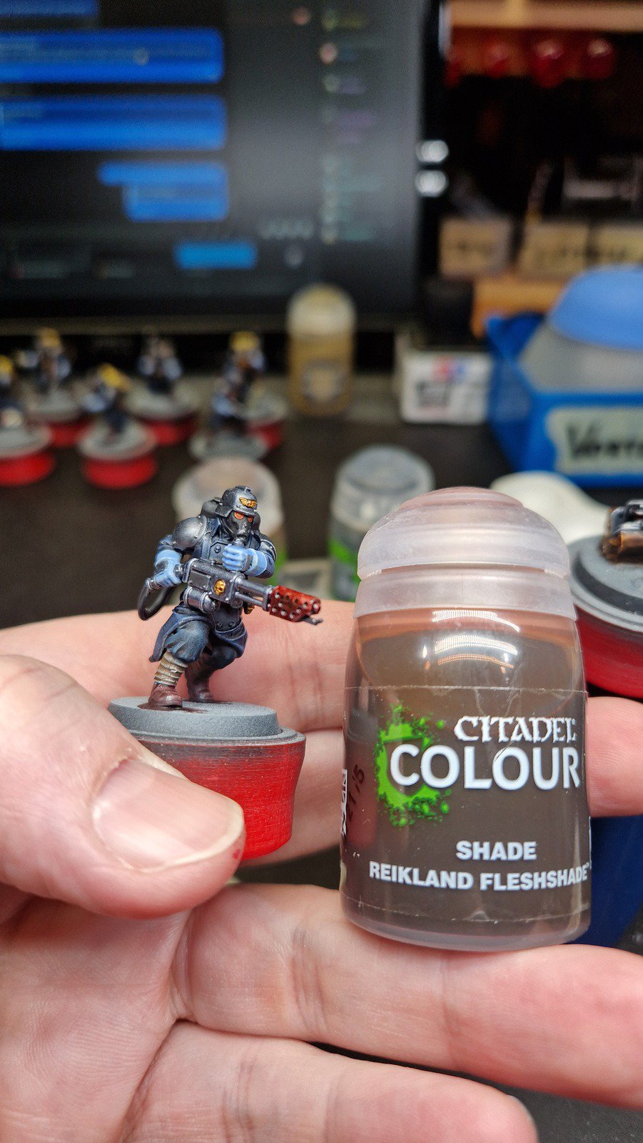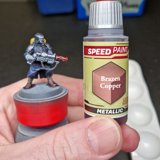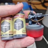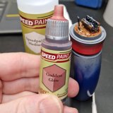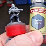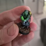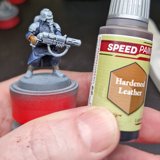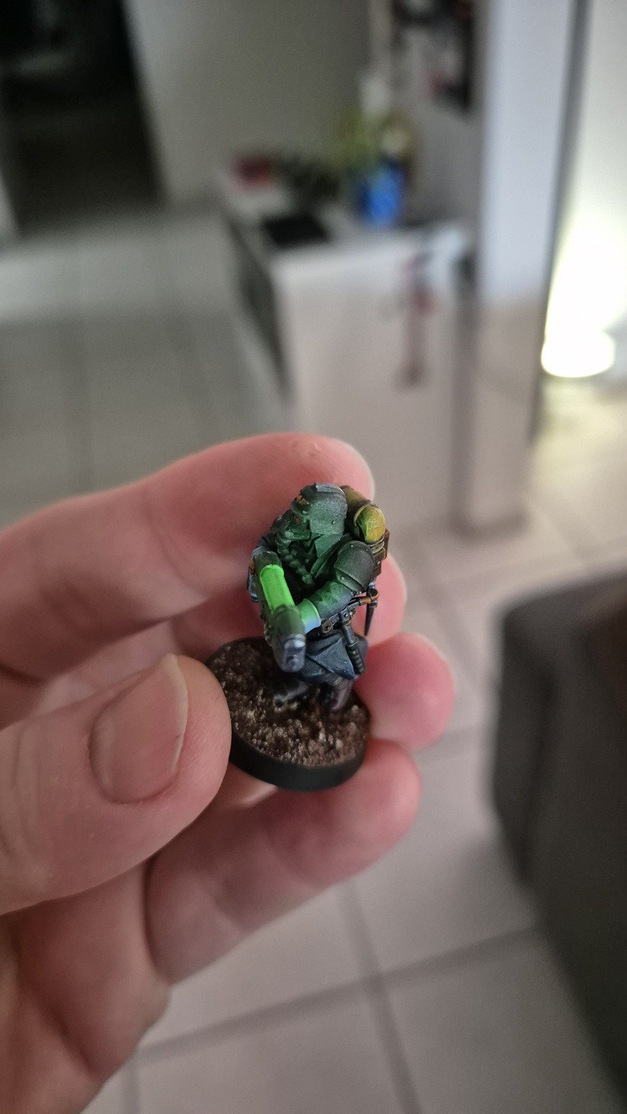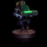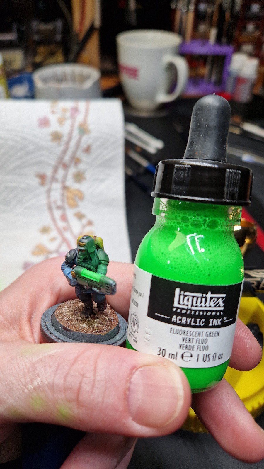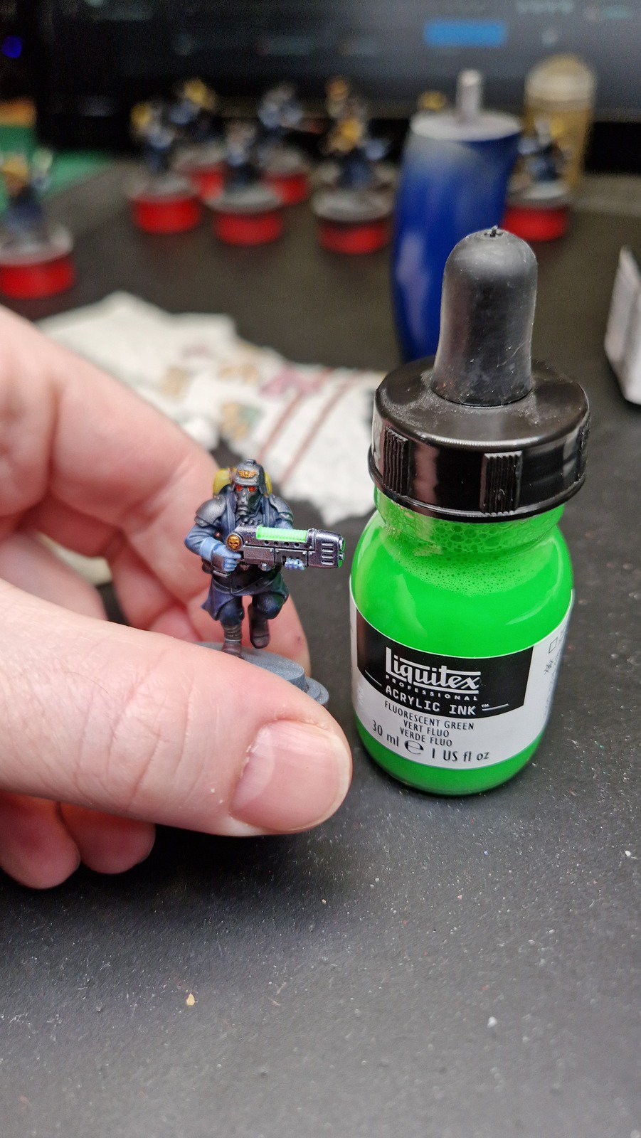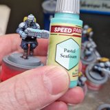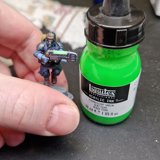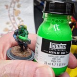 Die angewendete Technik diese Minis anschliessend mit Kontrast-Farben zu bemalen, ich verwende hier wieder Speed Paints 2.0, wird auch “Slap Chop” genannt. Für die Plasma-Waffen habe ich mit Airbrush-Verdünner und weisser Tinte einen weissen Wash hergestellt damit die Neon-Grüne Tinte im nächsten Schritt richtig gut leuchtet.