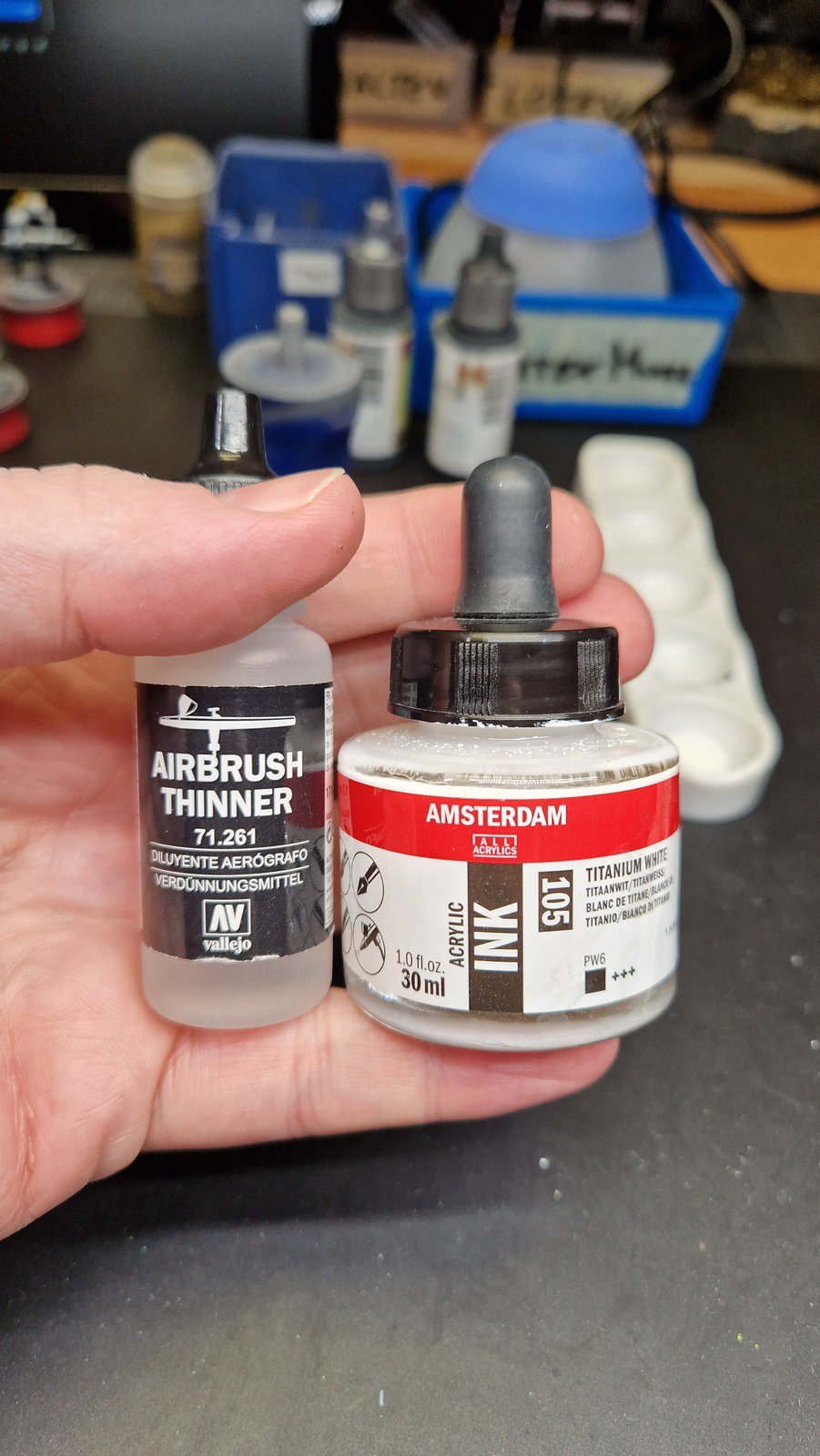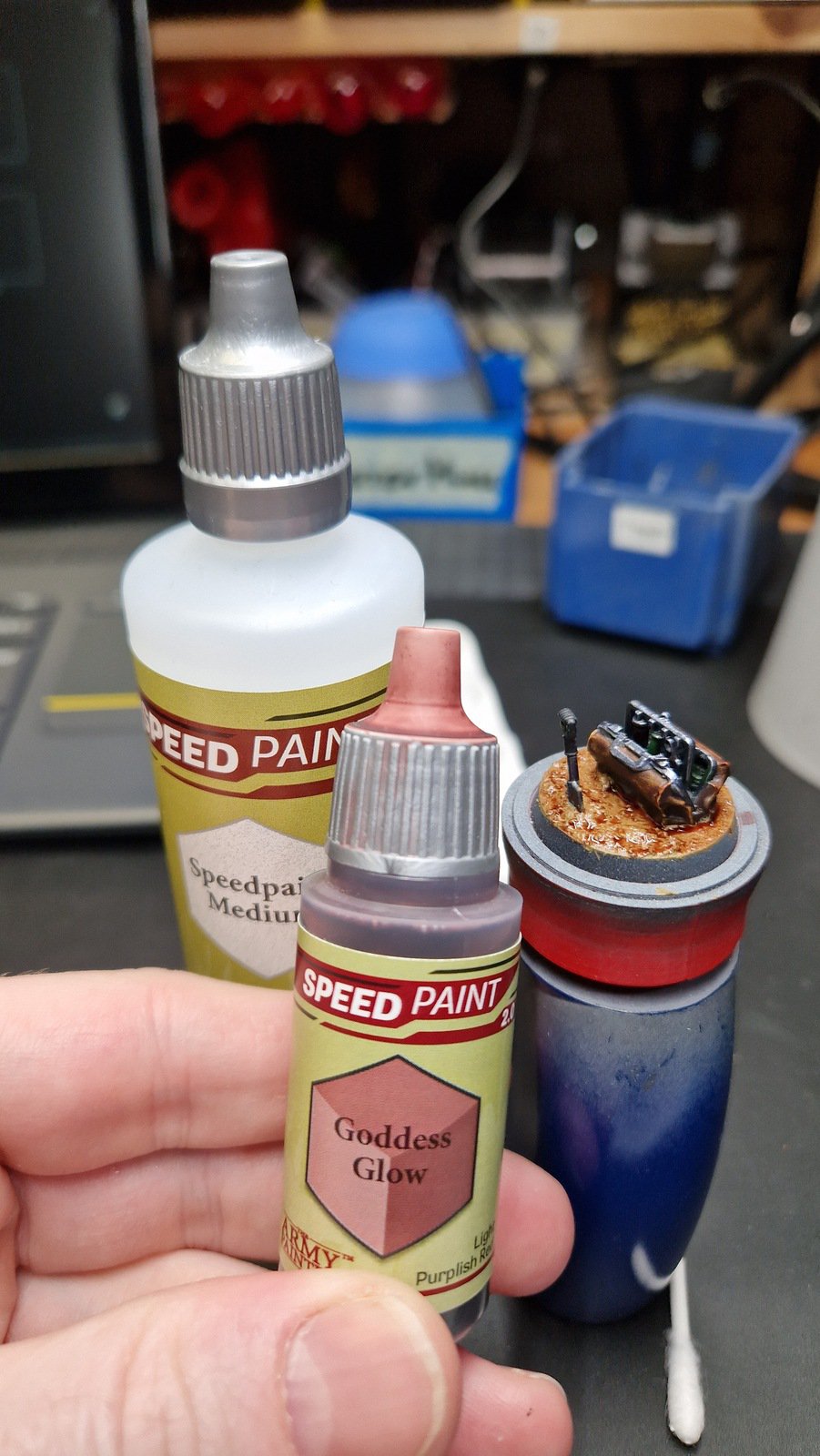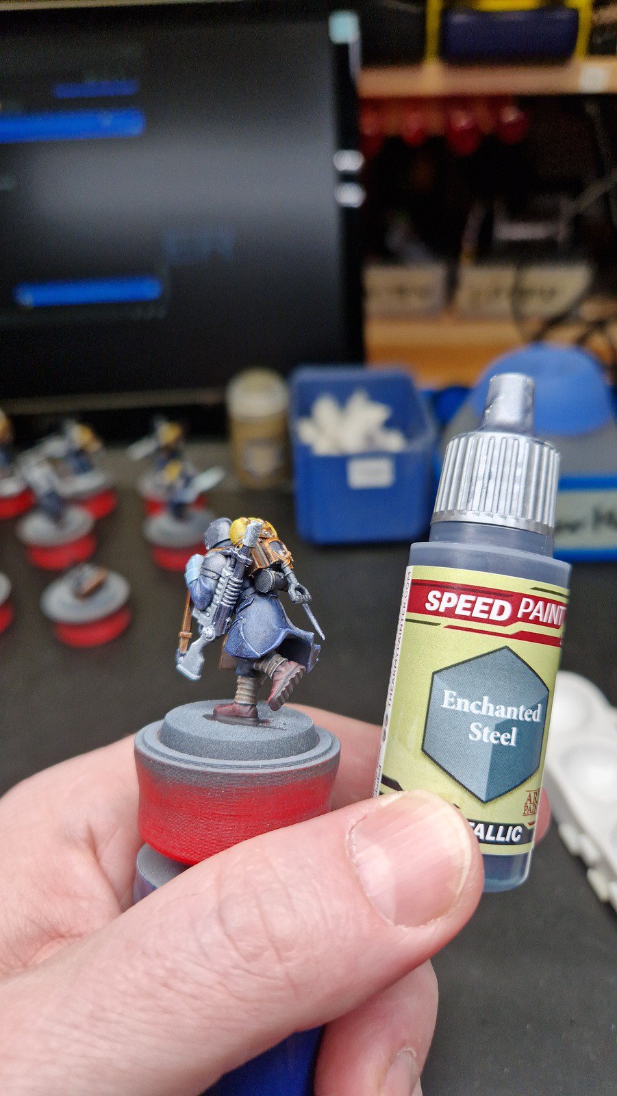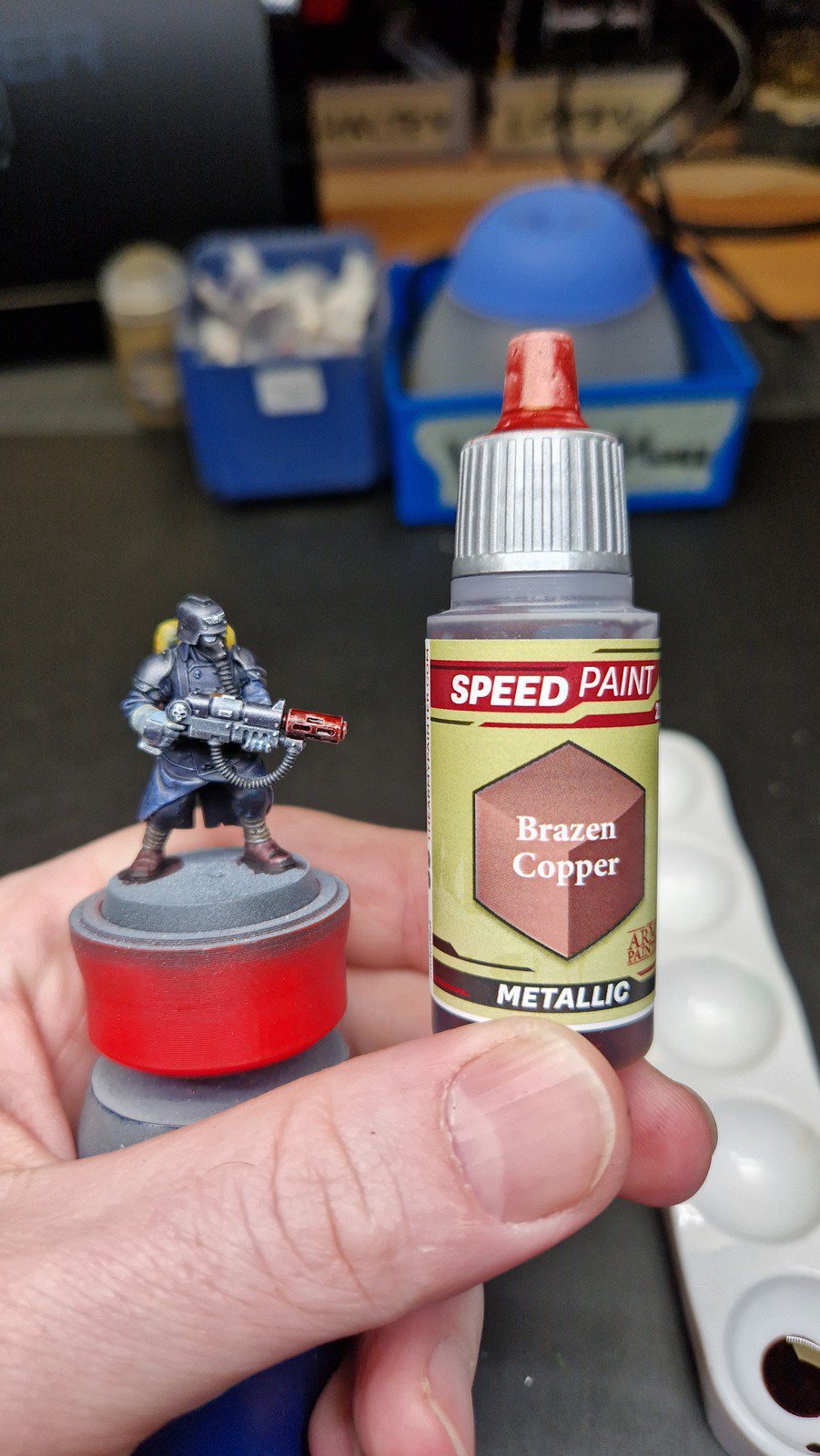 Die angewendete Technik diese Minis anschliessend mit Kontrast-Farben zu bemalen, ich verwende hier wieder Speed Paints 2.0, wird auch “Slap Chop” genannt. Für die Plasma-Waffen habe ich mit Airbrush-Verdünner und weisser Tinte einen weissen Wash hergestellt damit die Neon-Grüne Tinte im nächsten Schritt richtig gut leuchtet.